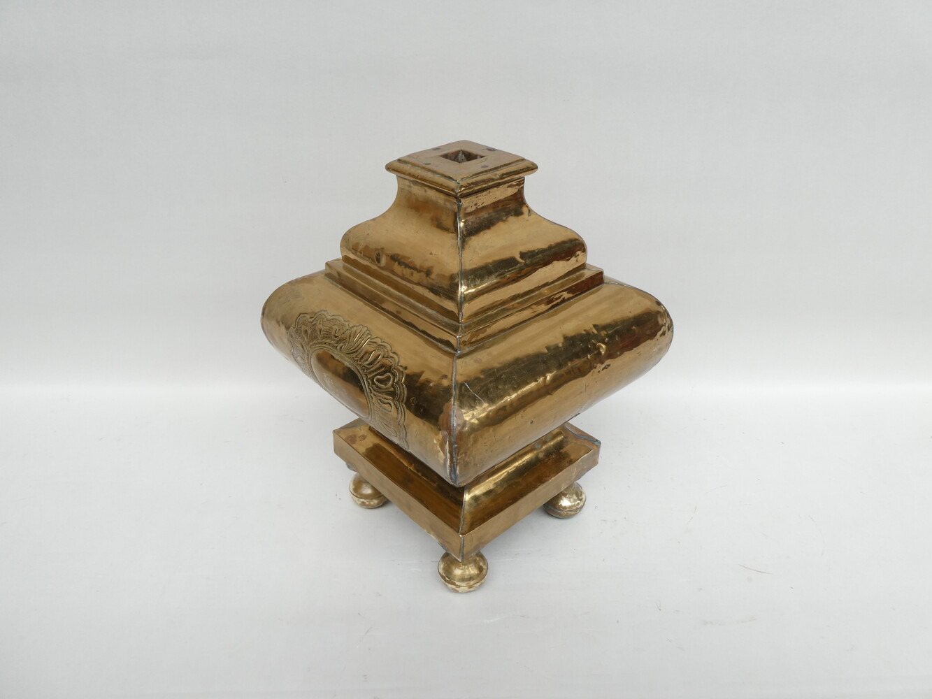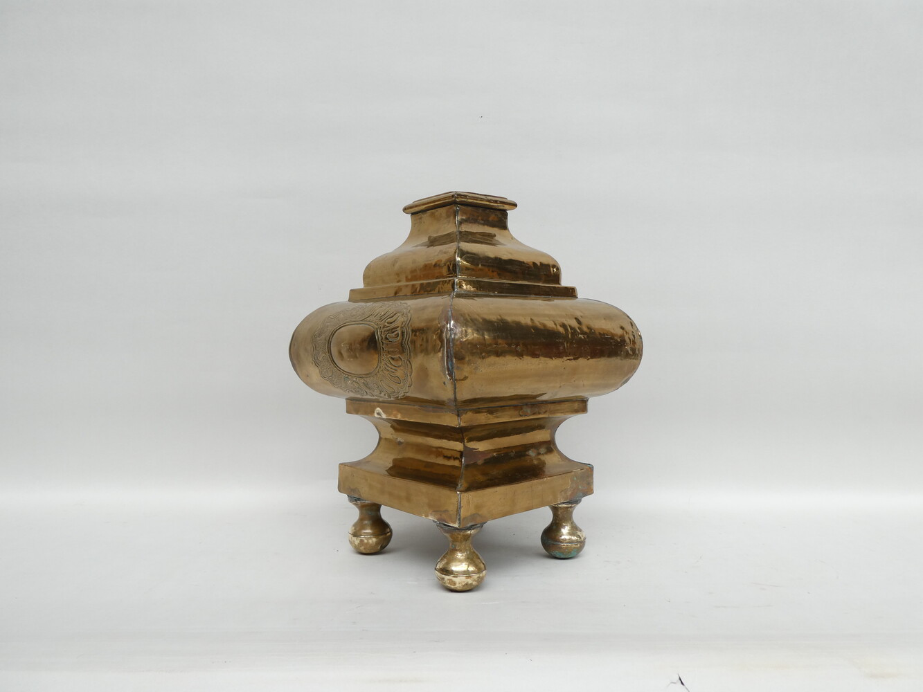 Koperen ornament van op een altaarstuk ( voetstuk van een kruis ? ).
