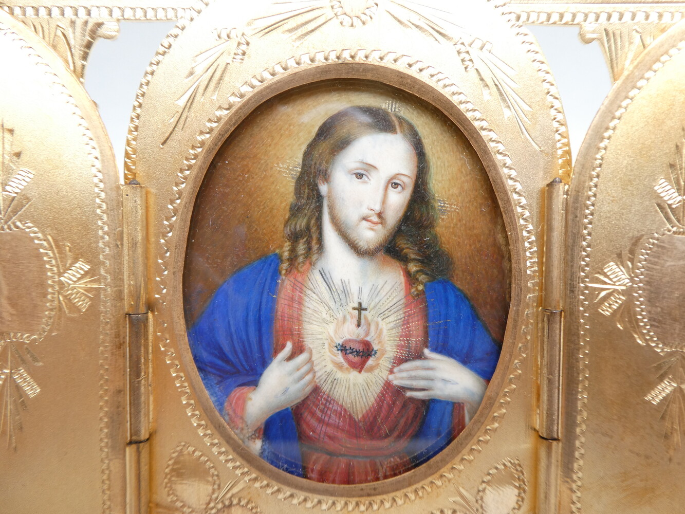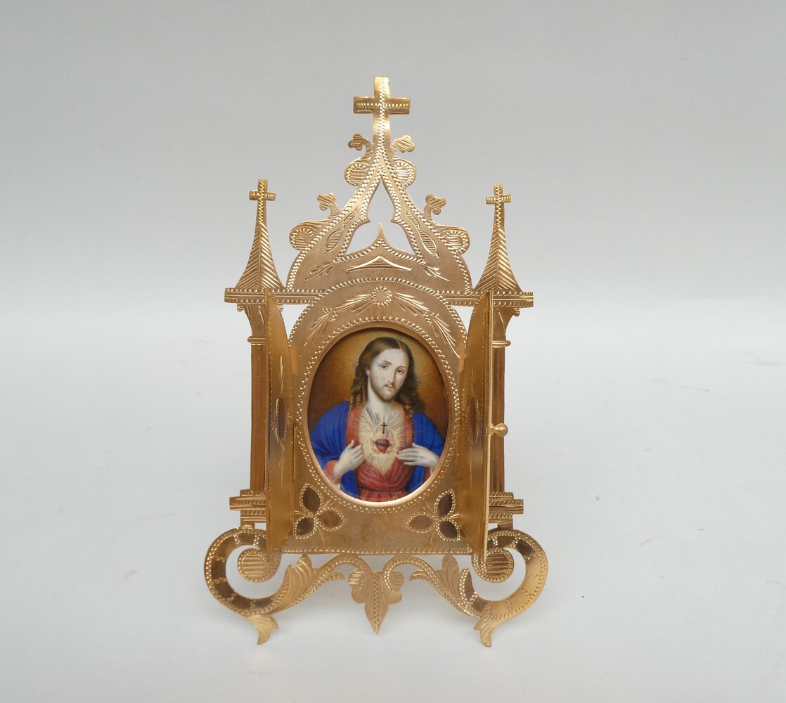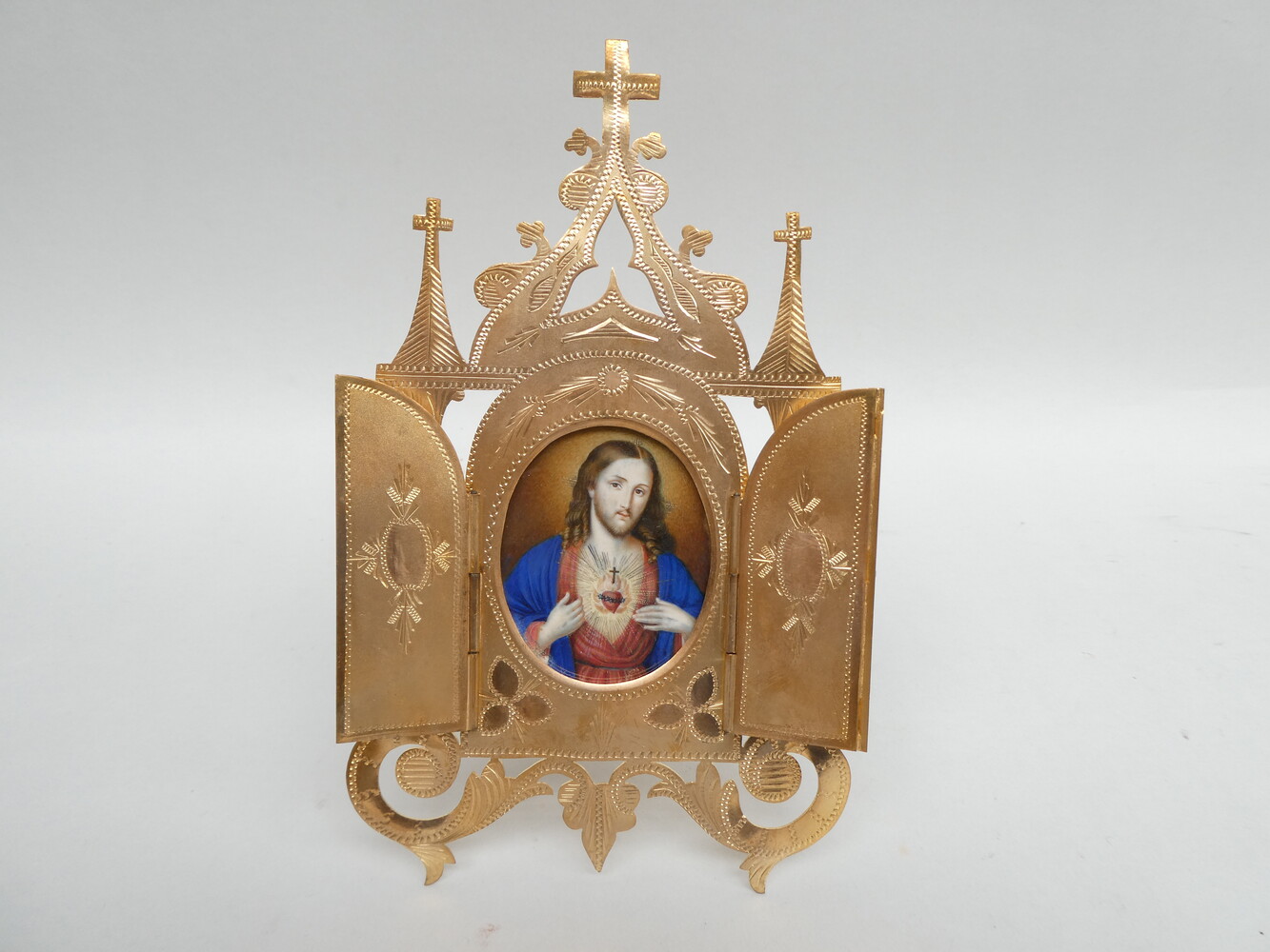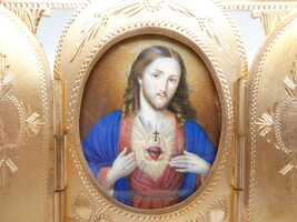 Koperen sierlijstje 11cmx18cm met een een miniatuur schilderijtje "Heilig Hart".