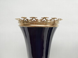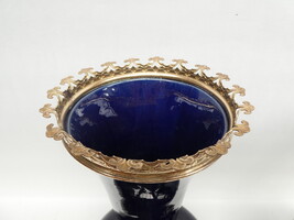 Koppel grote blauwe vazen in faiënce met bronzen voetstuk en bovenmontuur.