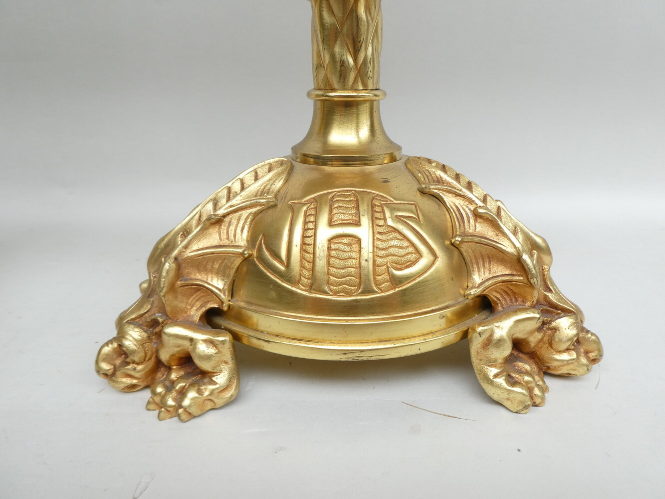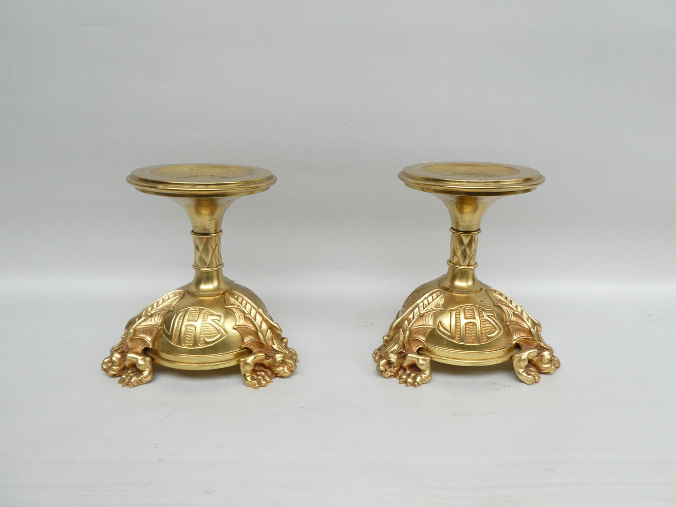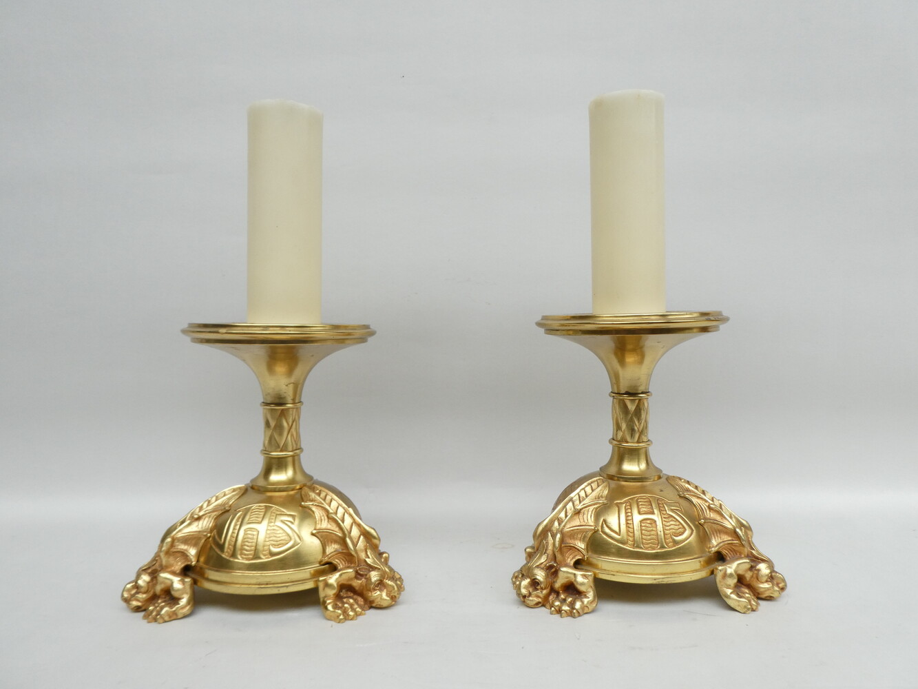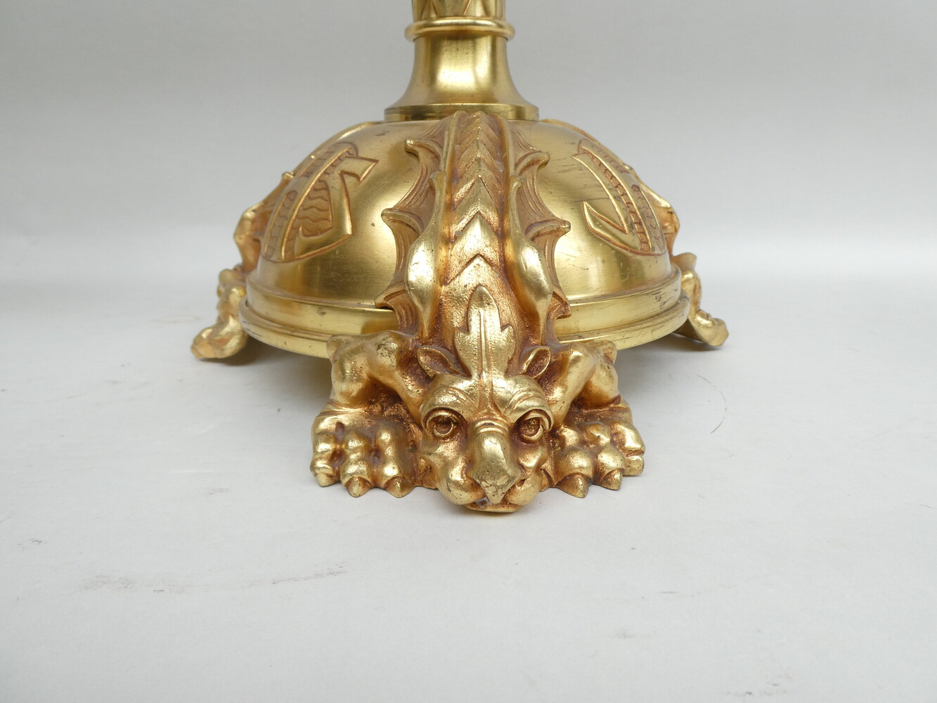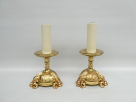 Koppel lage koperen altaarkandelaars ( zonder pin ) op pootjes in de vorm van een draak. Hoogte 25cm. ( koppel kaarsen bijgevoegd ).