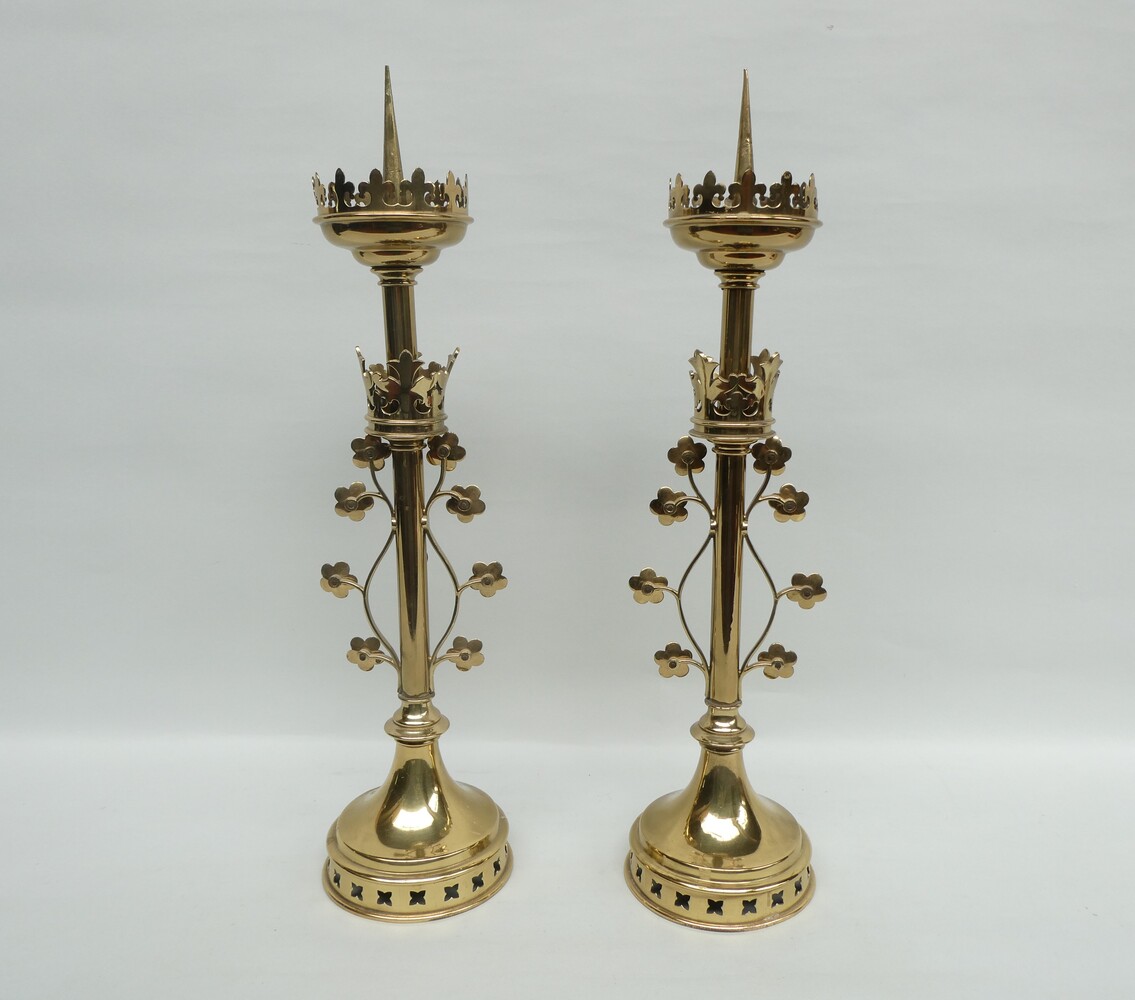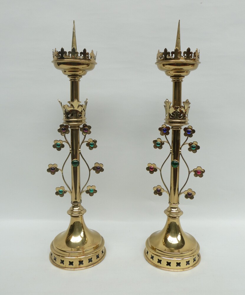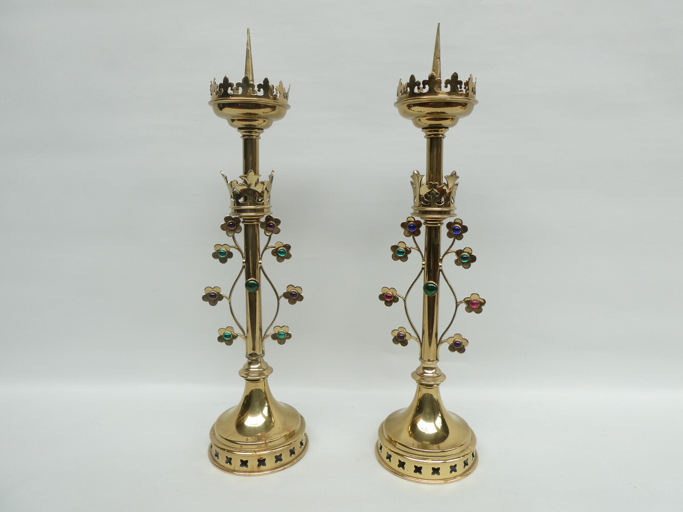 Koppel neogotieke koperen altaarkandelaars met gekleurde glazen knopen