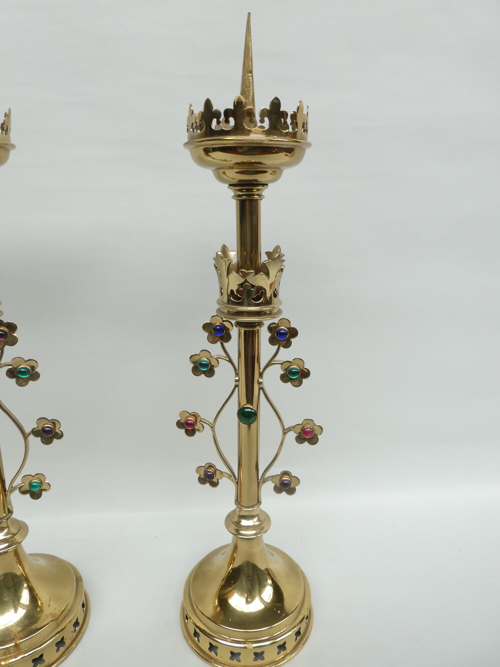 Mooi koppel neogotieke koperen altaarkandelaars met gekleurde glazen knopen.