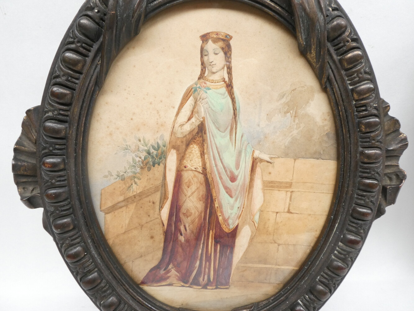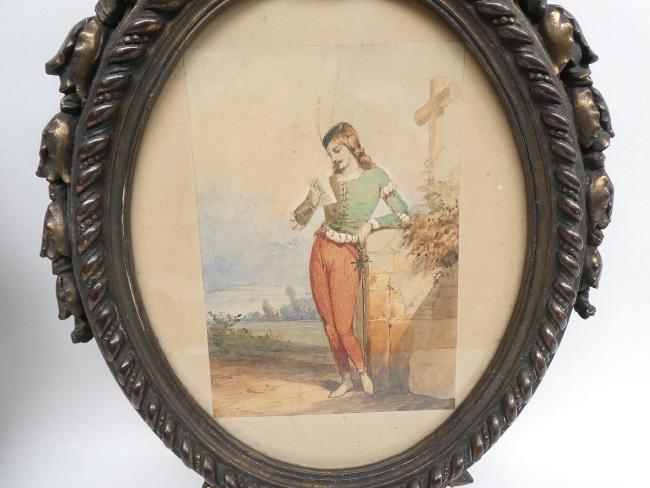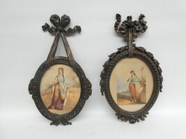 Koppel antieke lijsten met koperen omhulsel in Lodewijk XVI stijl 54cmx31cm, met aquarellen "jonge adelijke dame" en "jonge heer".