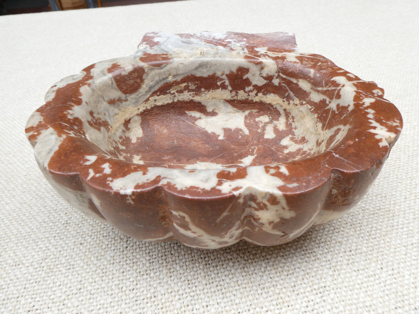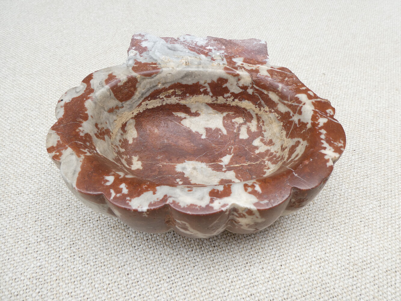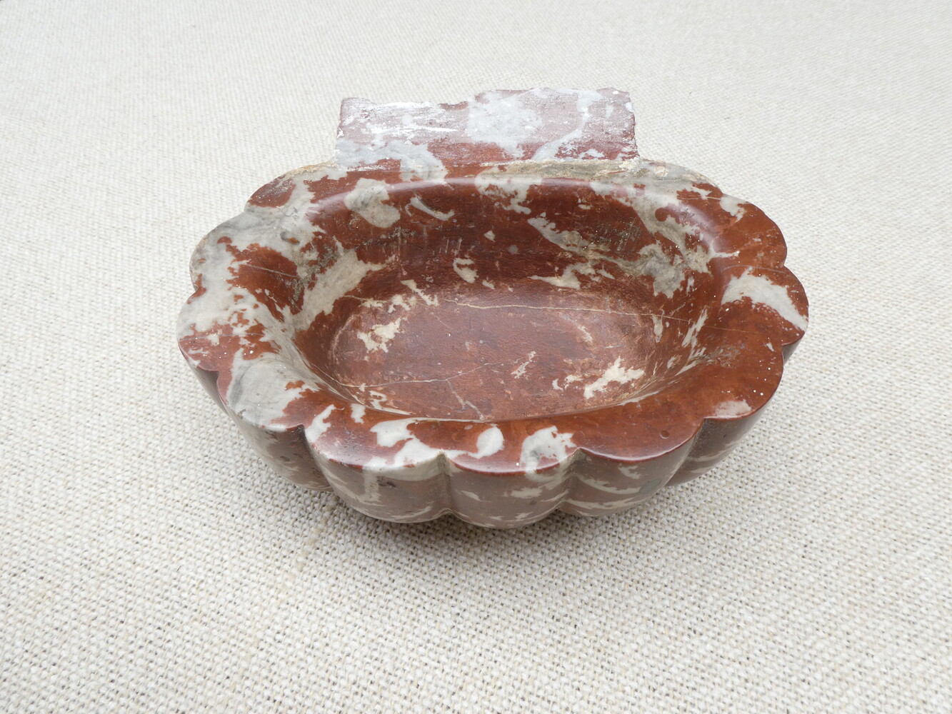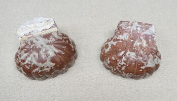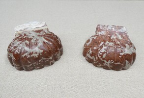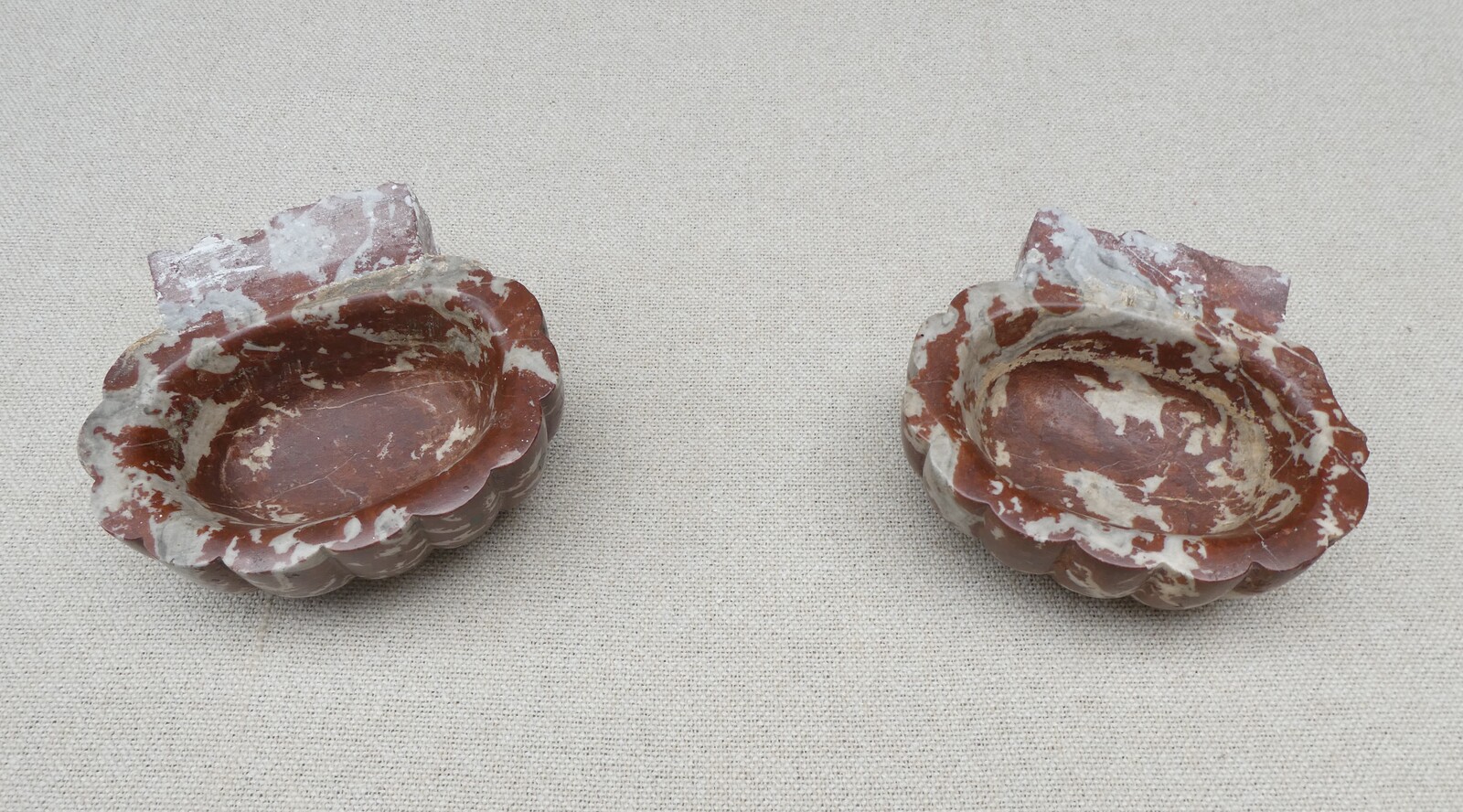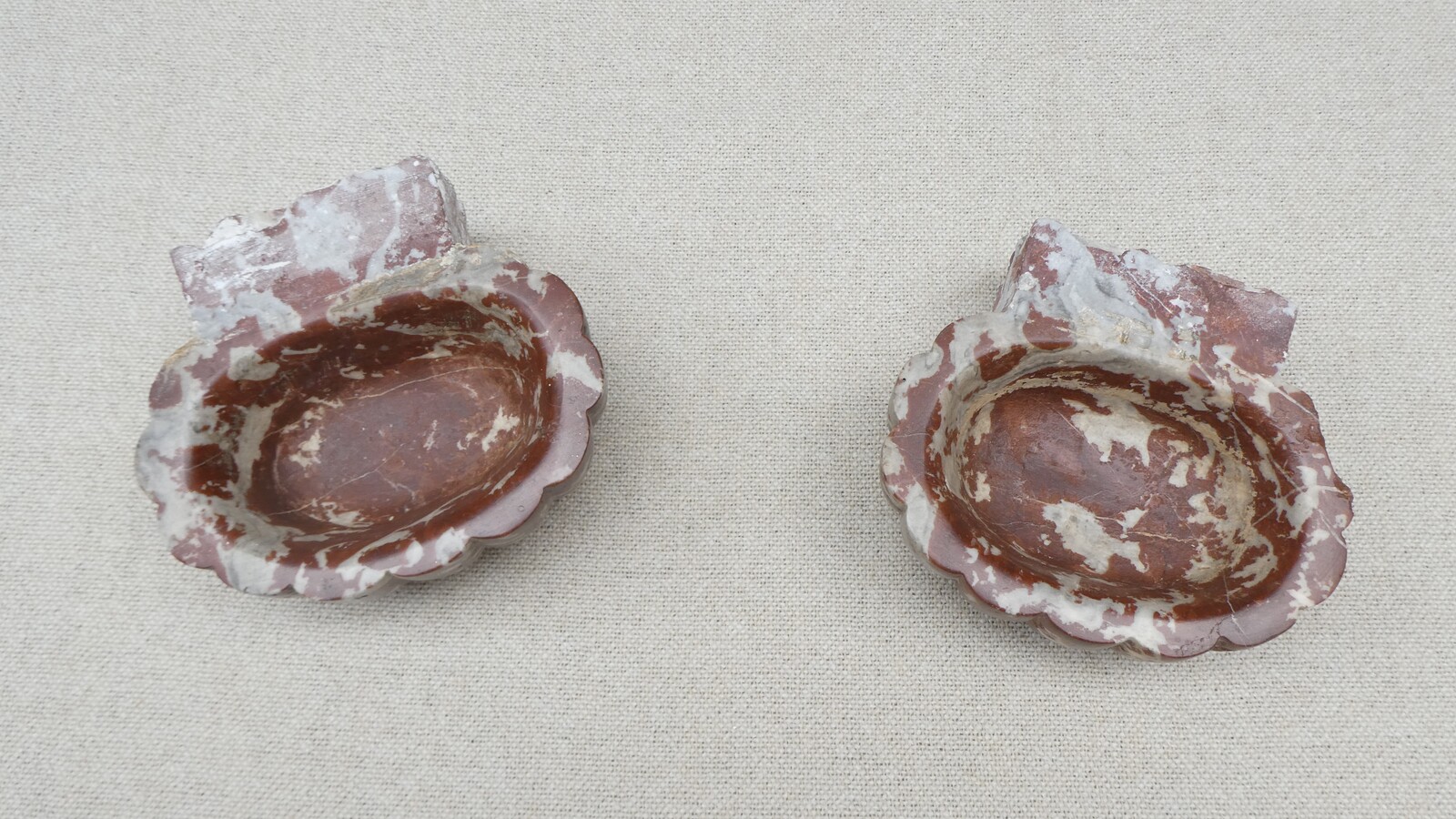 Koppel schelpvormige wijwatervaten in gekleurde marmer
