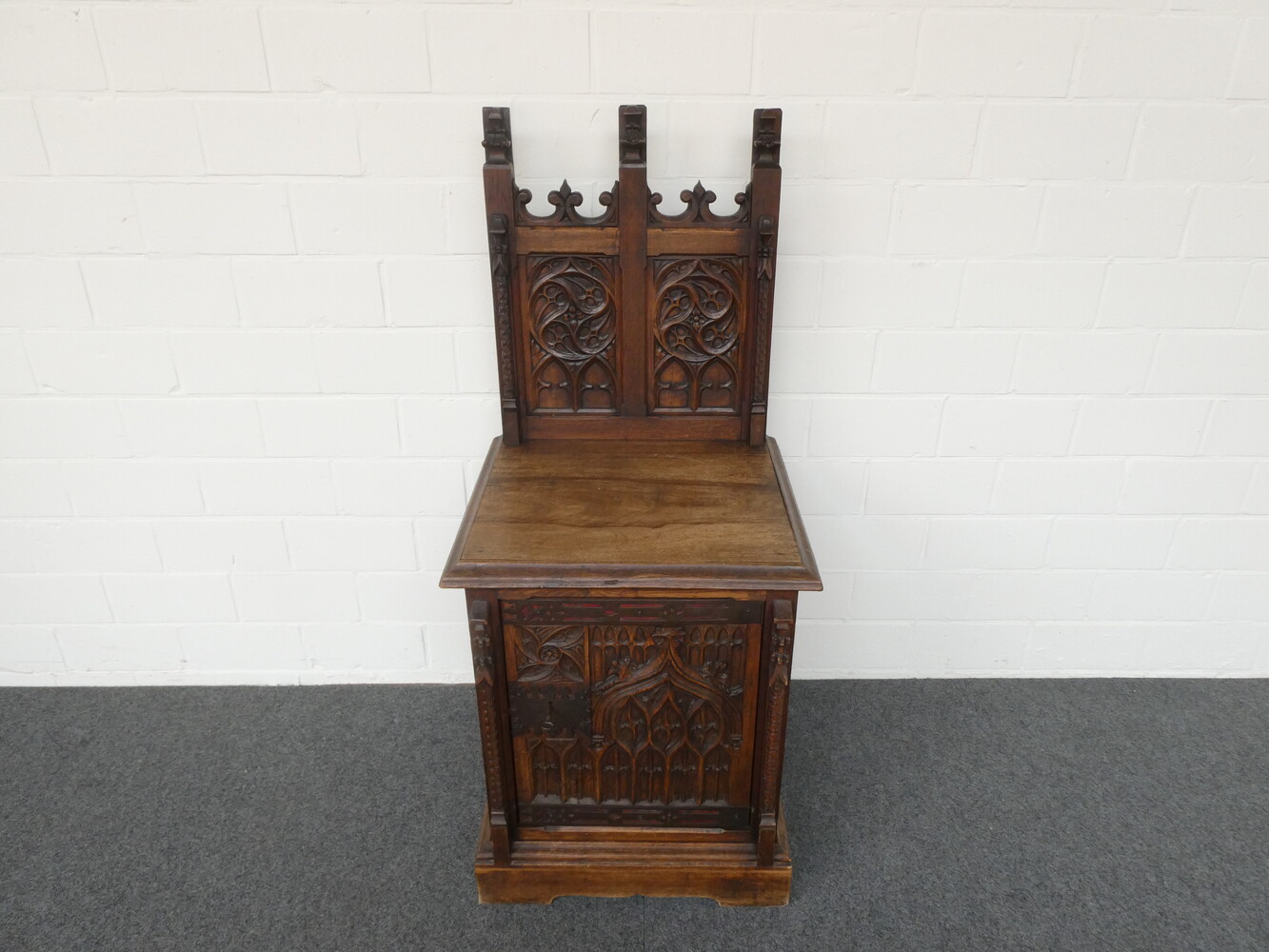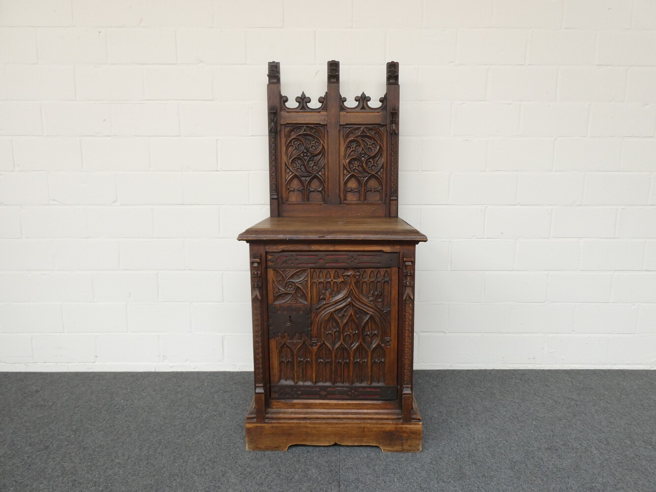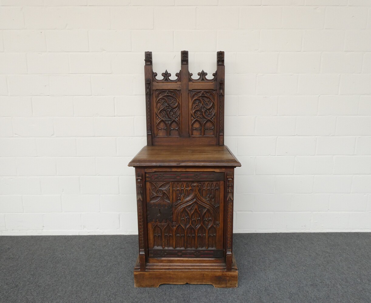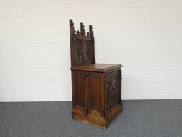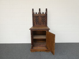 Laag neogotisch eiken ééndeurskastje met opstand, met mooie briefpanelen en spitsbogen. 60cm x 56cm - hoogte 75cm. Totale hoogte met opstand 138cm.