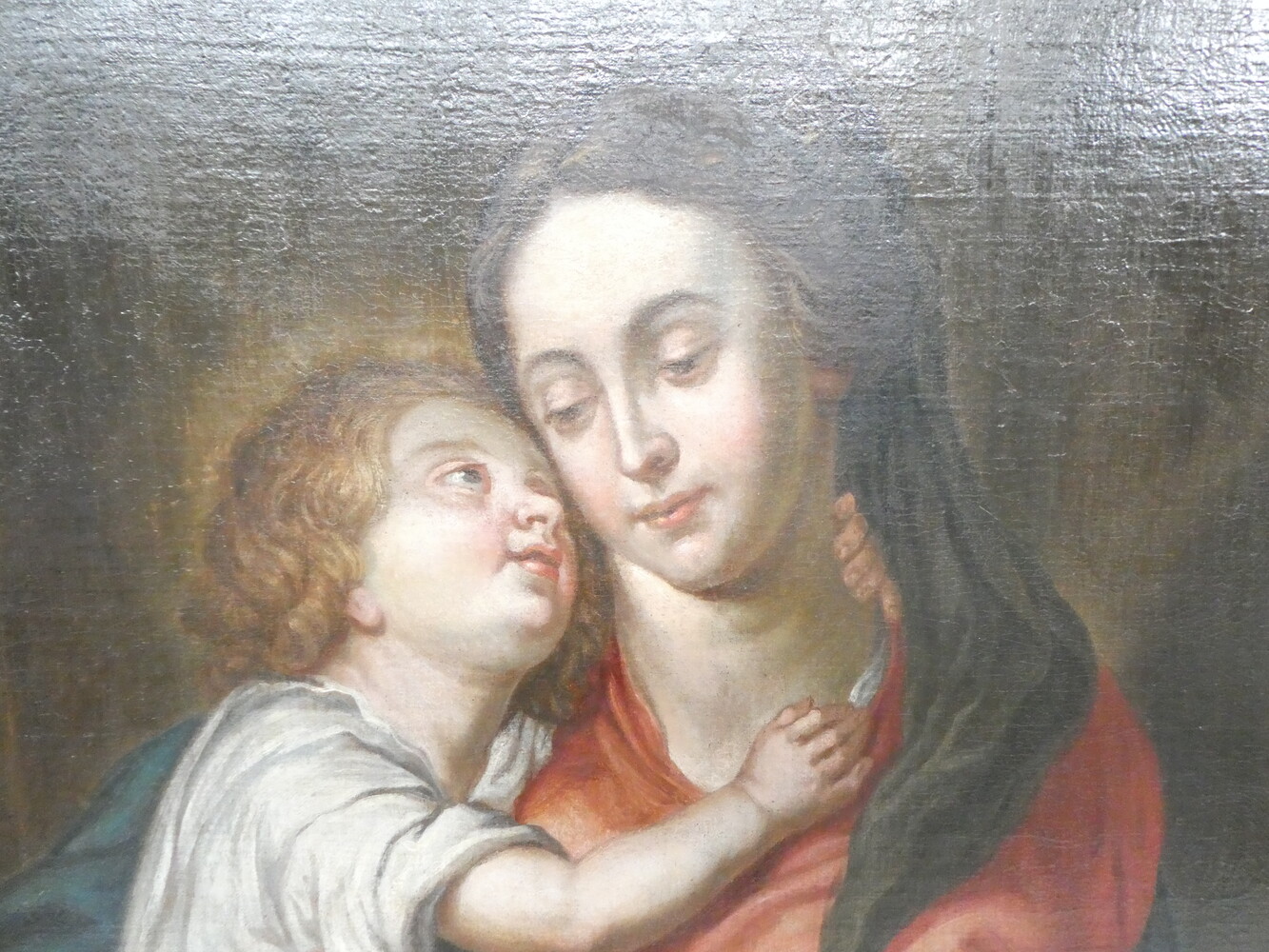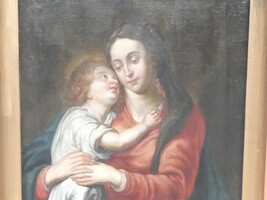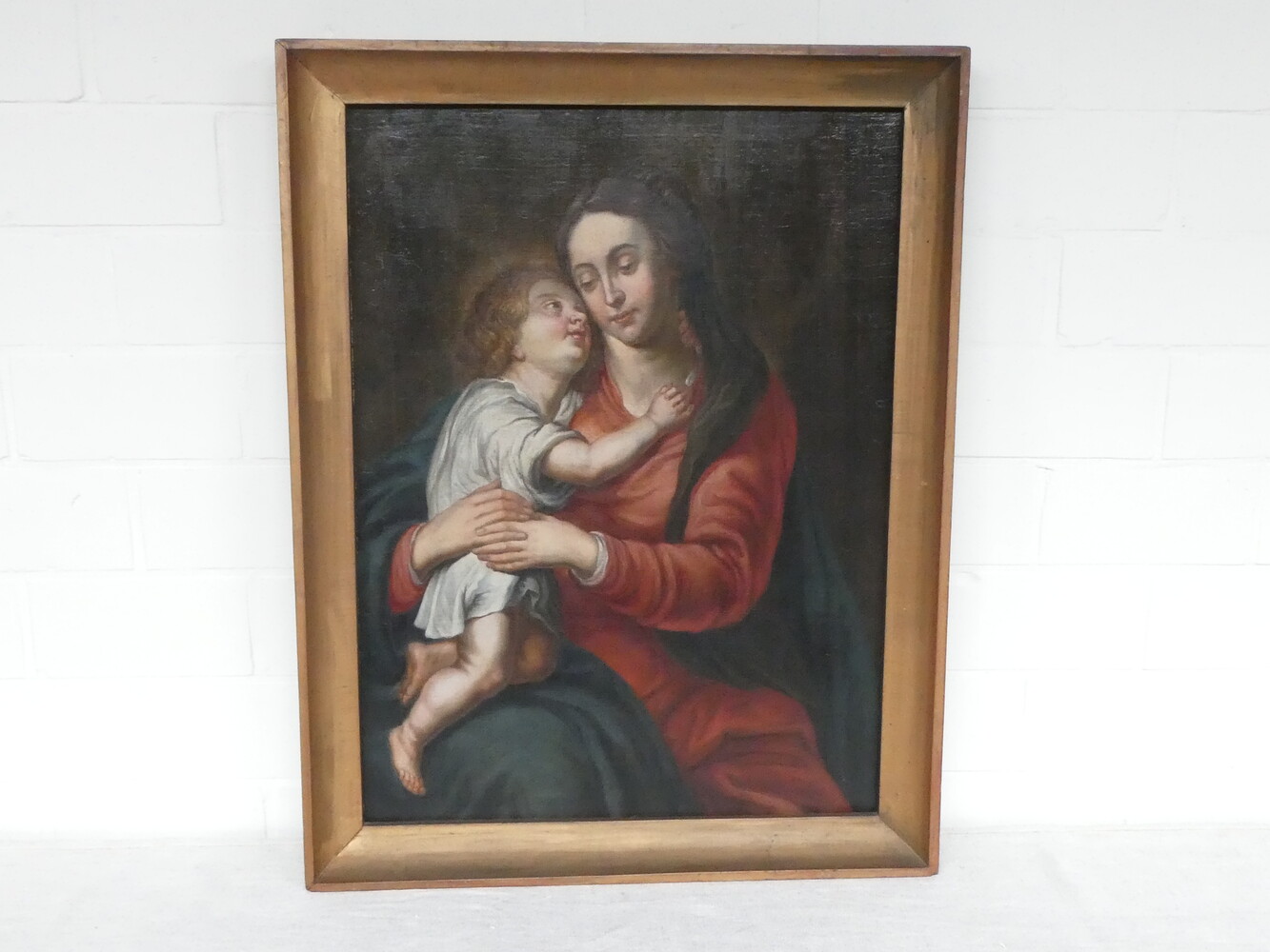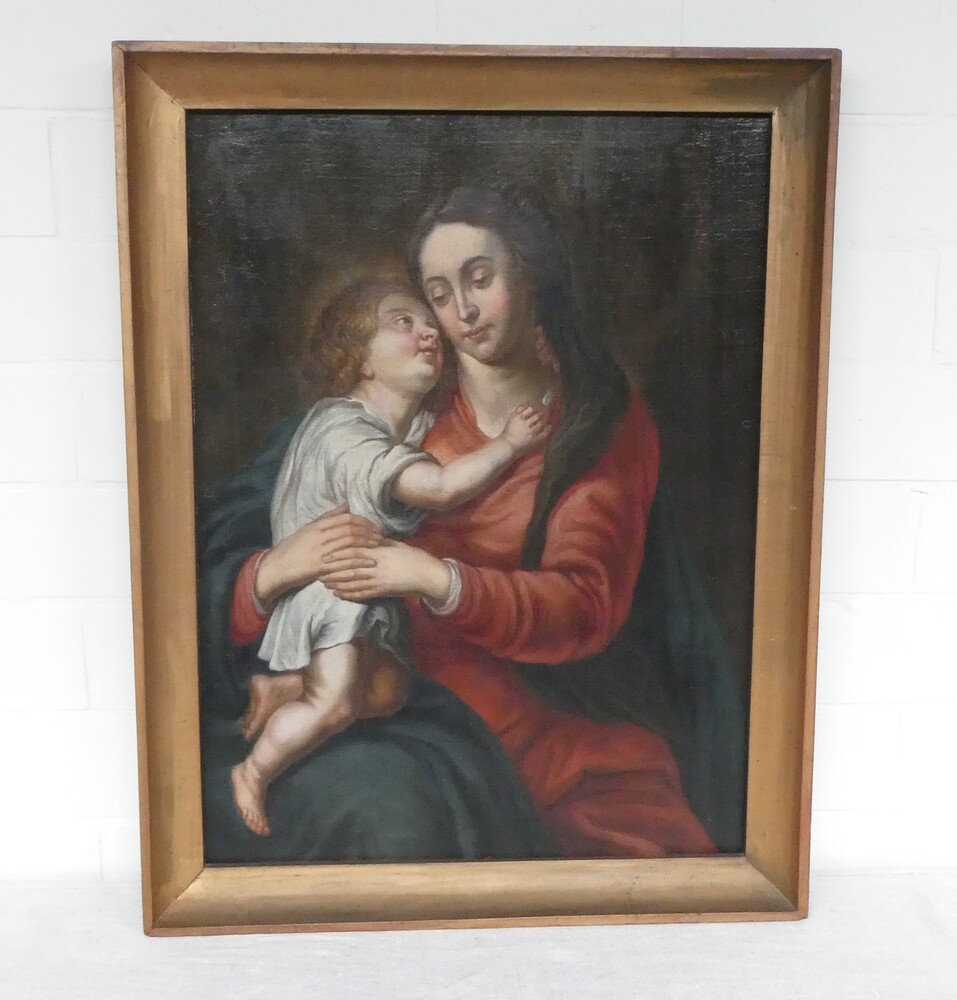 "Madonna met Kindje" antiek oliewerk op doek, onleesbare signatuur. 68cmx92cm - met kader 82cmx105cm.