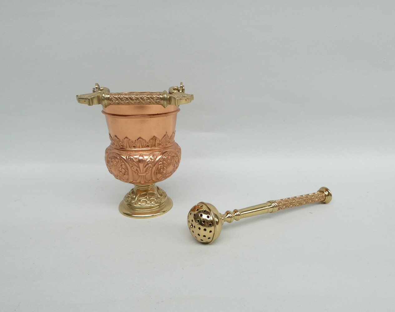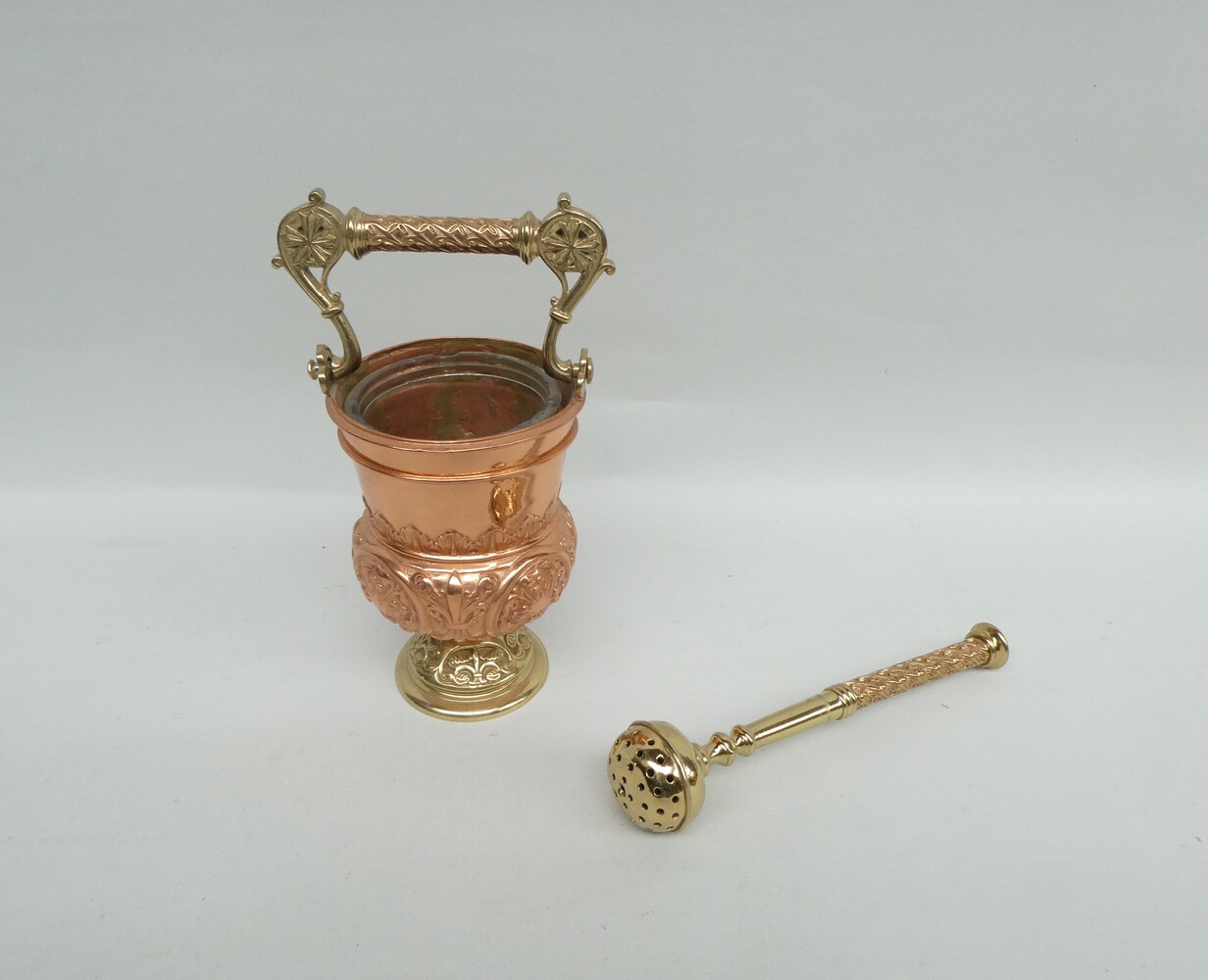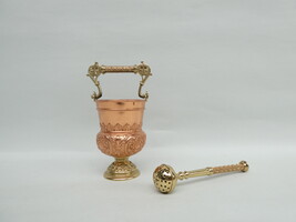 Mooi bewerkte wijwateremmer in geel en rood koper met de bijhorende mooie kwispel.