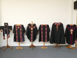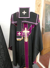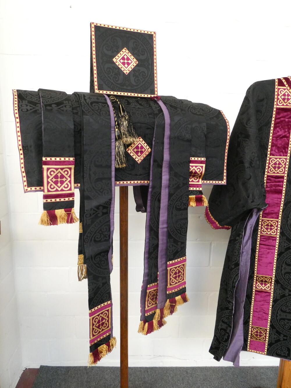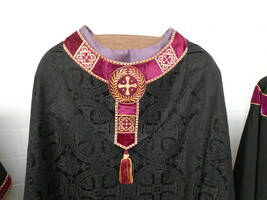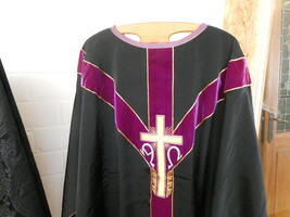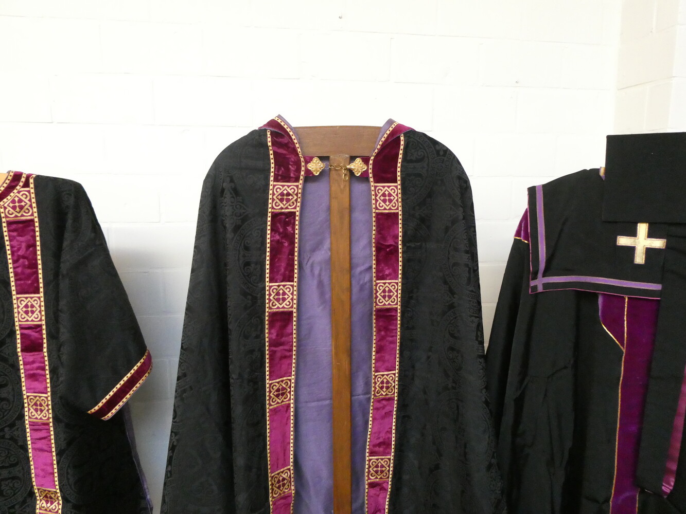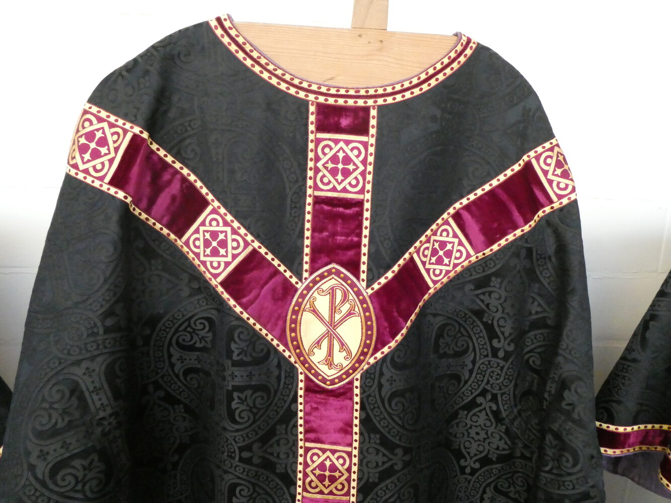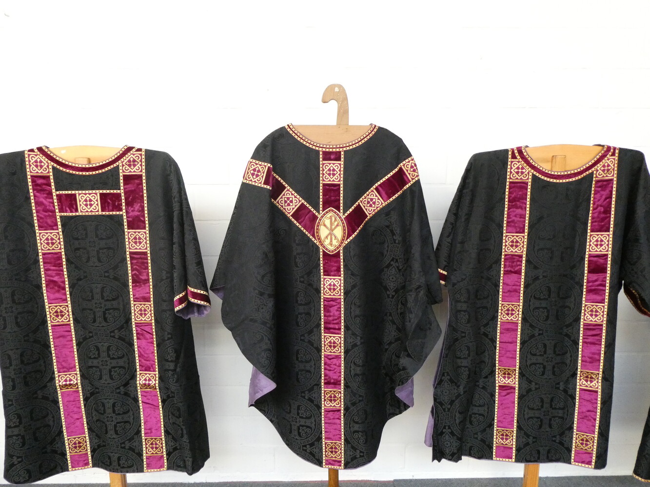 Mooi set zwarte liturgische gewaden : kazuifel, twee dalmatieken, koorkap, stola's, manipels, bursa... en bijgevoegd een zwarte kazuifel.