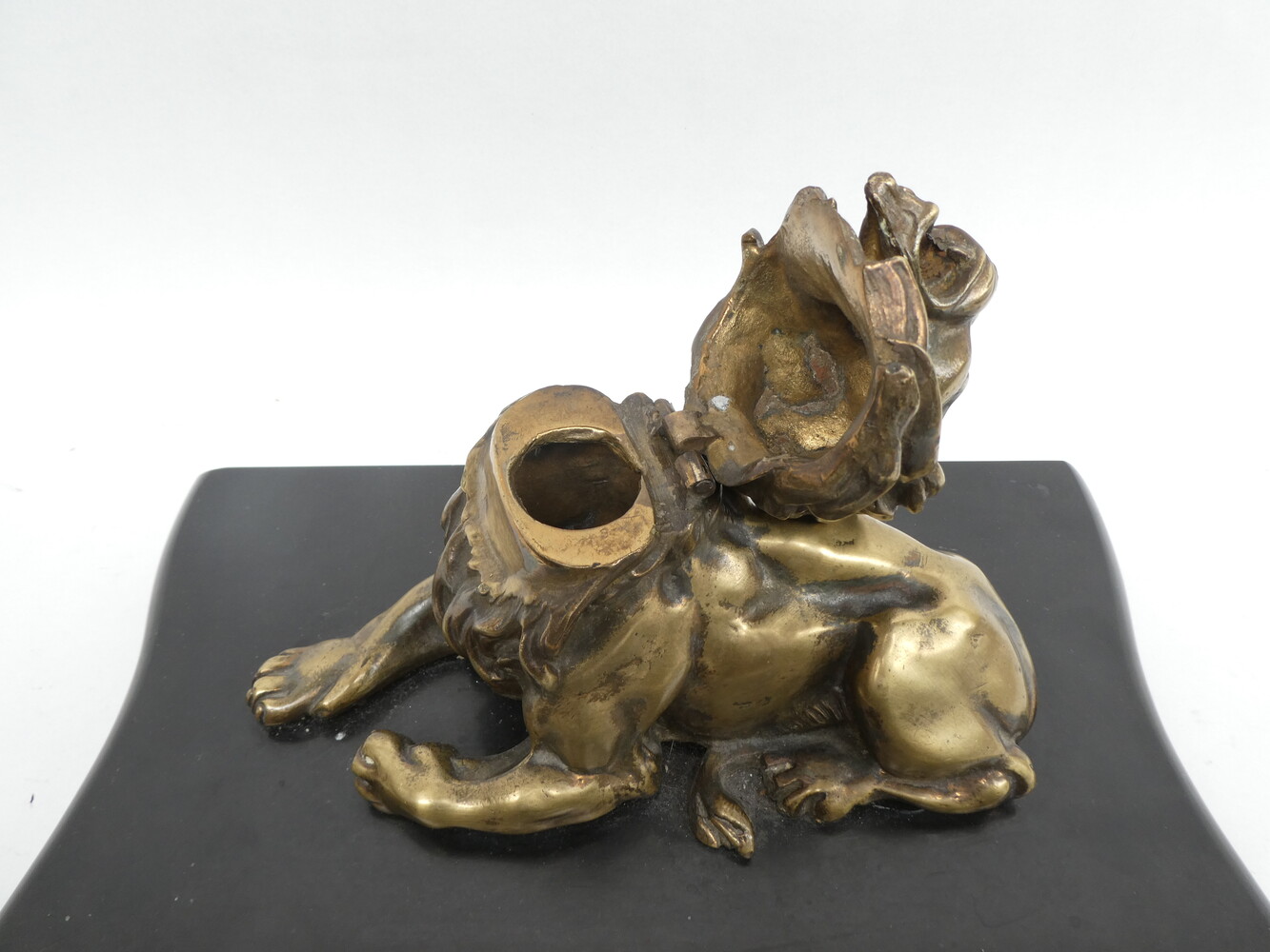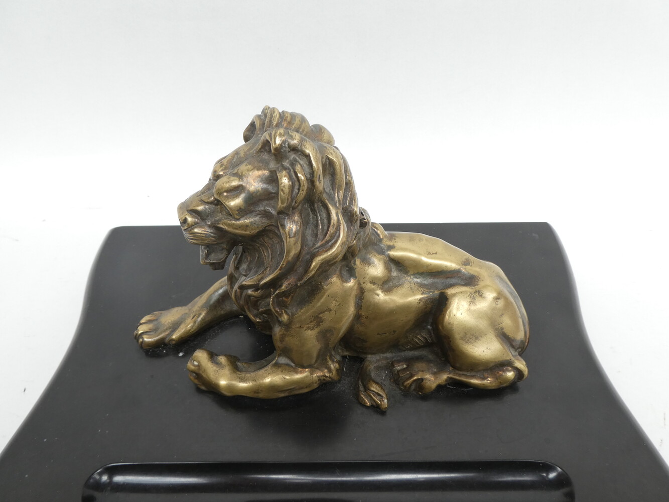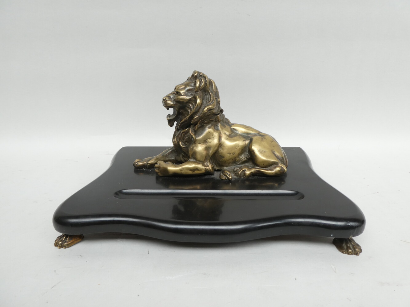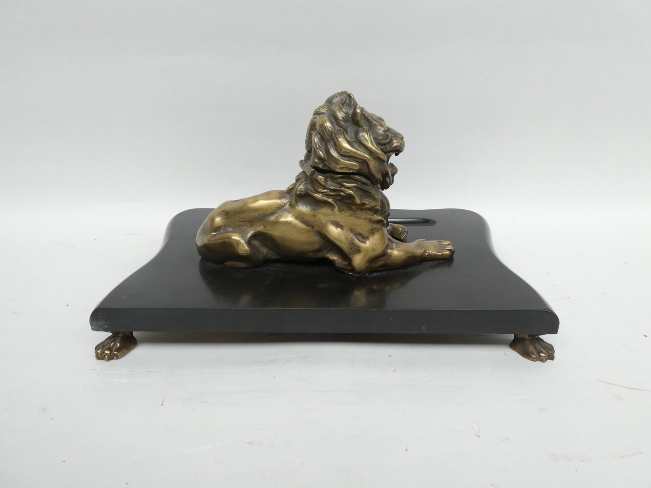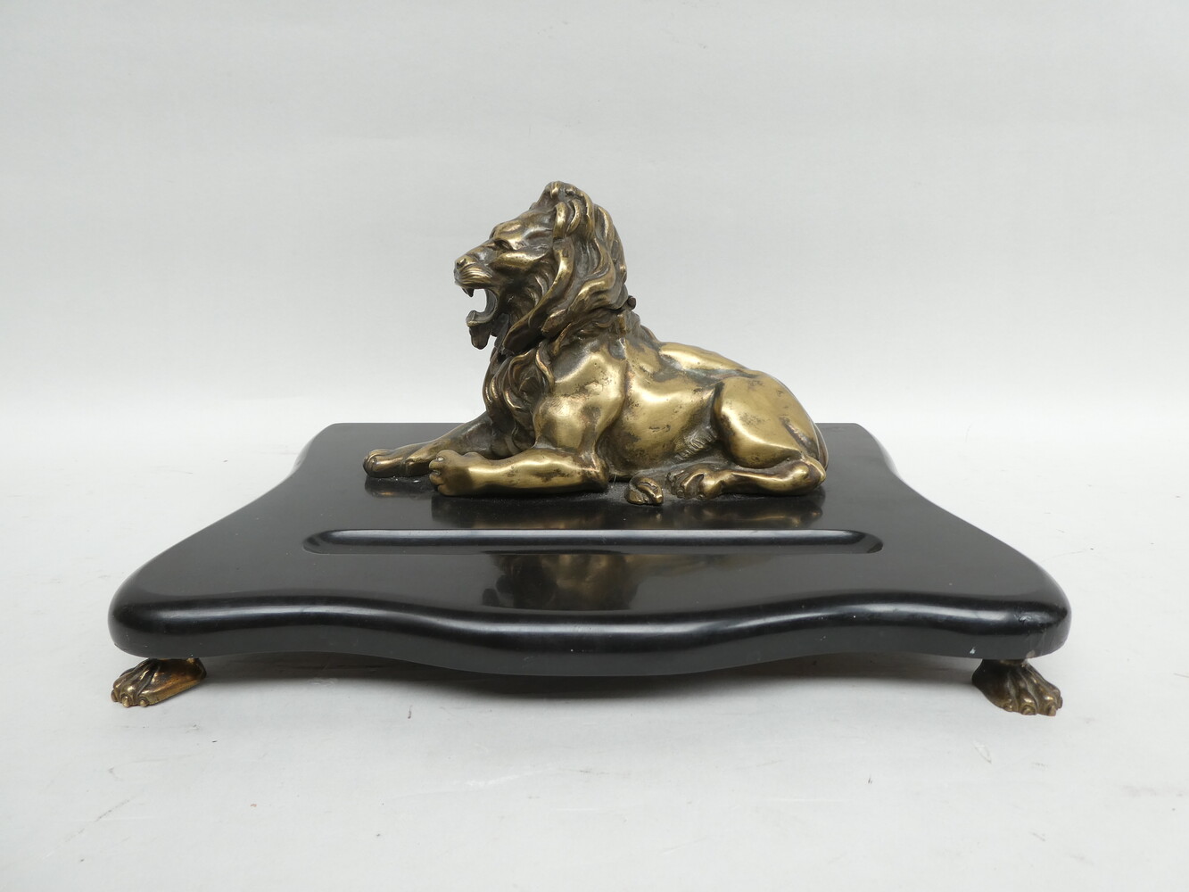 Napoleon III inktstel op zwart marmeren voetplaat op leeuwenpootjes, met inktpot in de vorm van een bronzen leeuw.