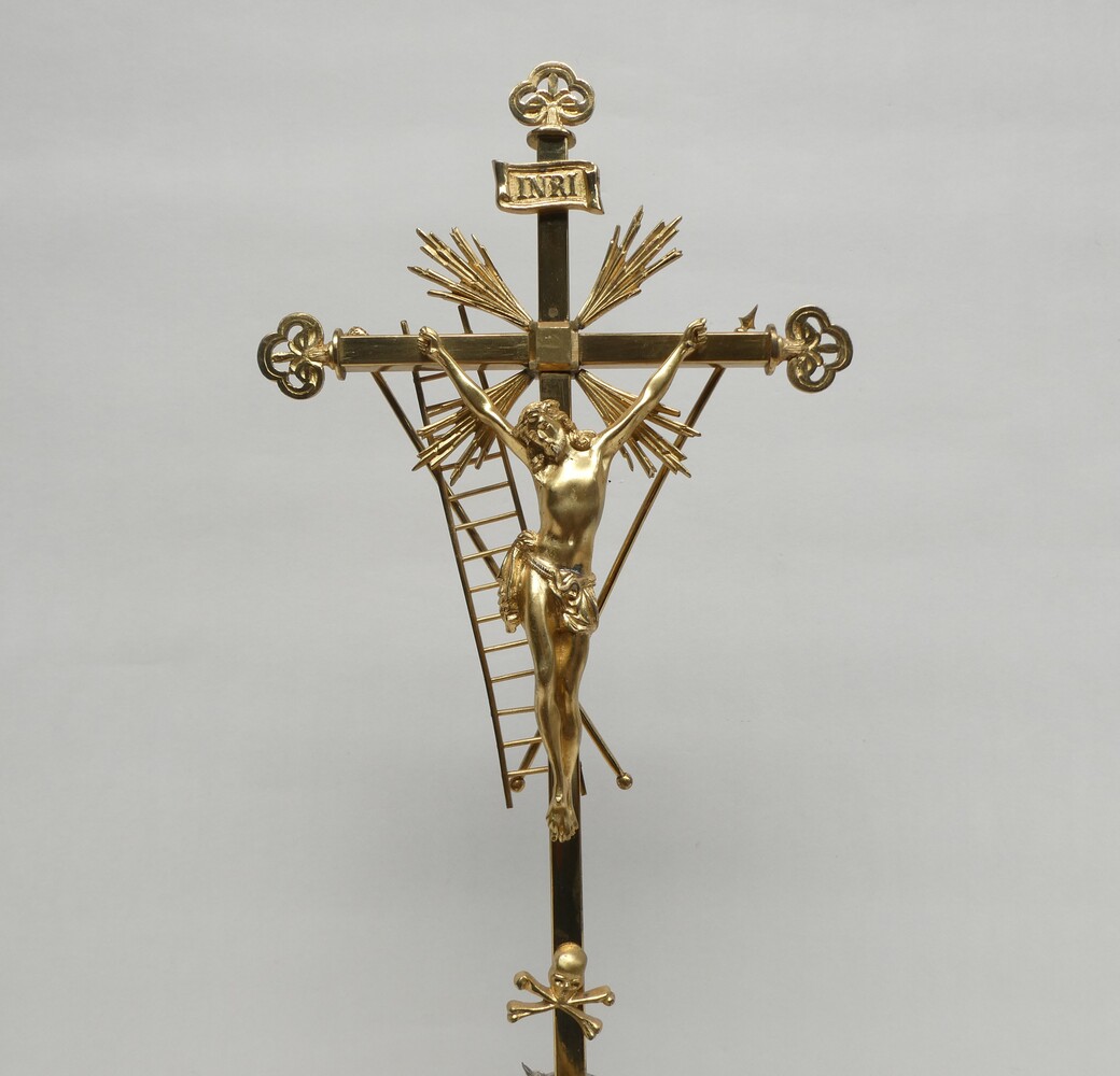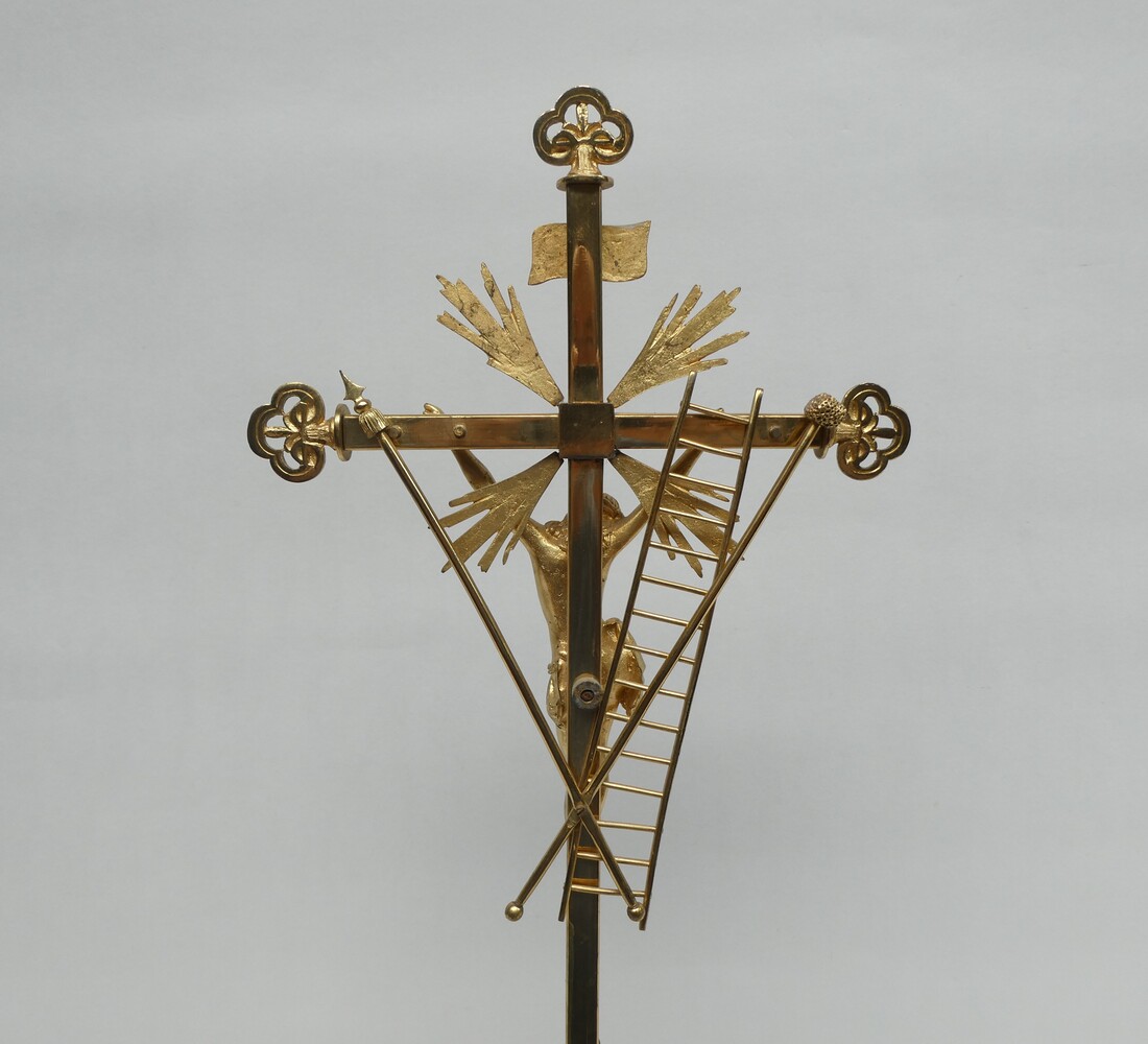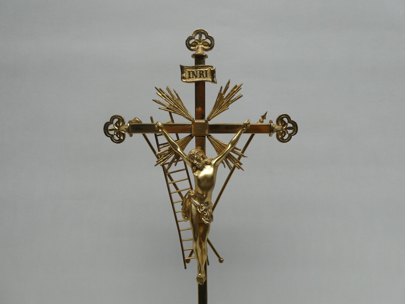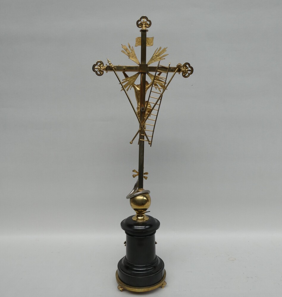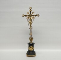 Napoleon III koperen kruisbeeld met de lijdenssymbolen op een zwarthouten voetstuk.