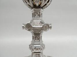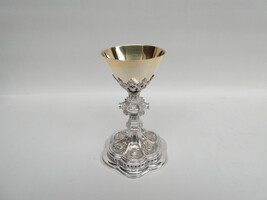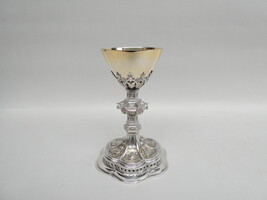Neogotieke zilveren kelk met religieuze symbolen in het voetstuk