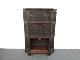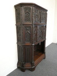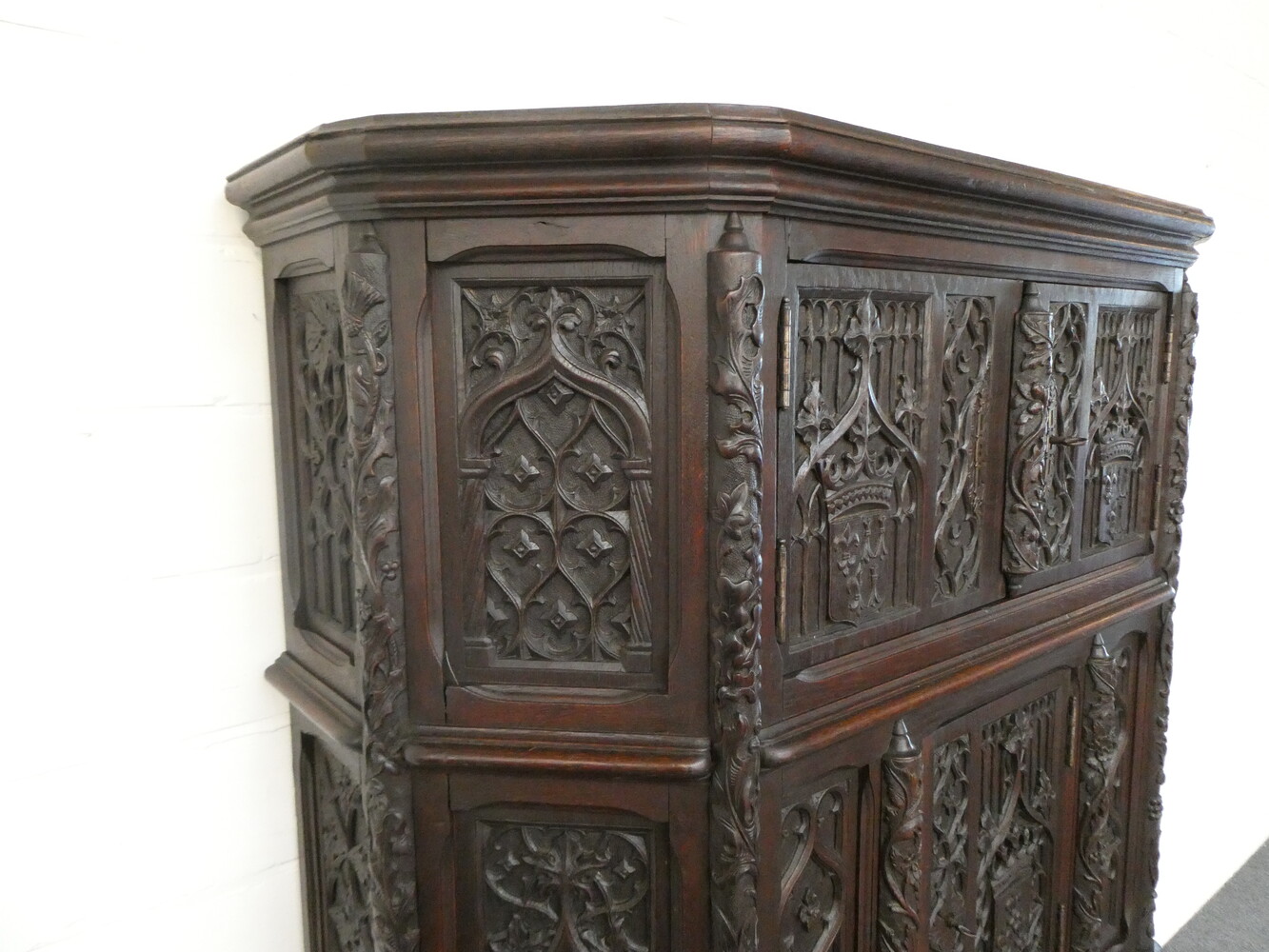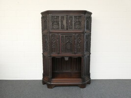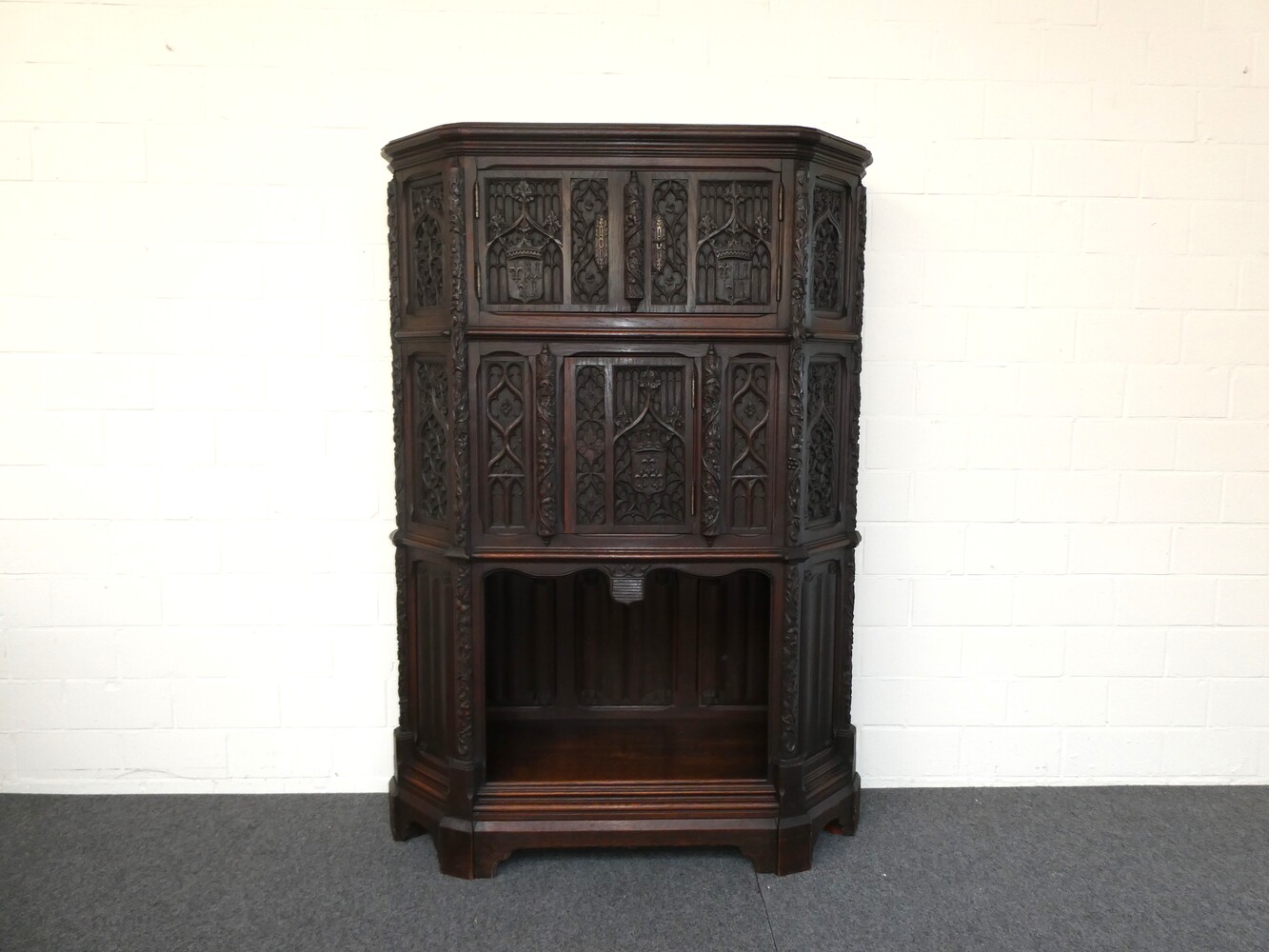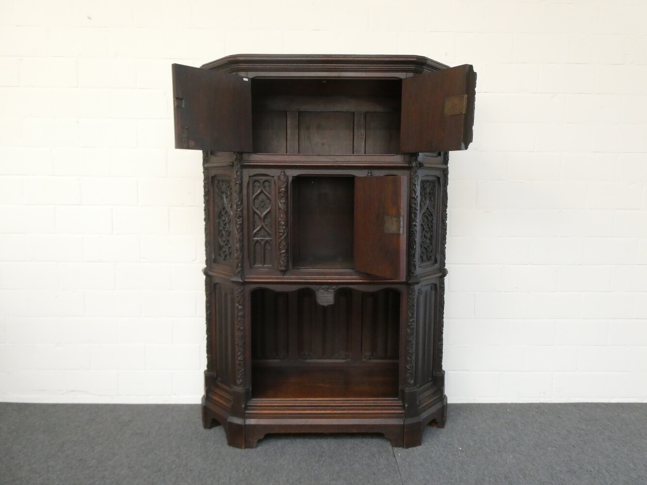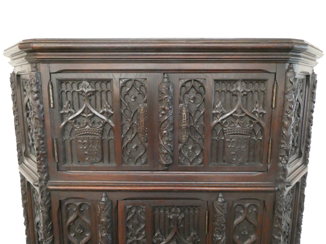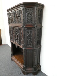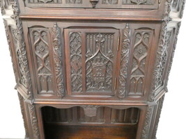Neogotische eiken driedeurskast met afgeschuinde zijkanten, met briefpanelen, spitsbogen en wapenschilden op de deuren. 120cm x 44cm - hoogte 176cm.