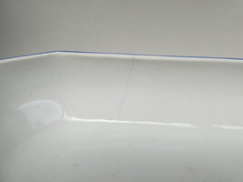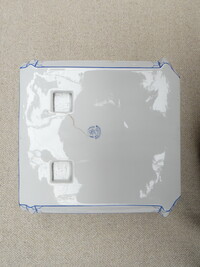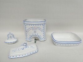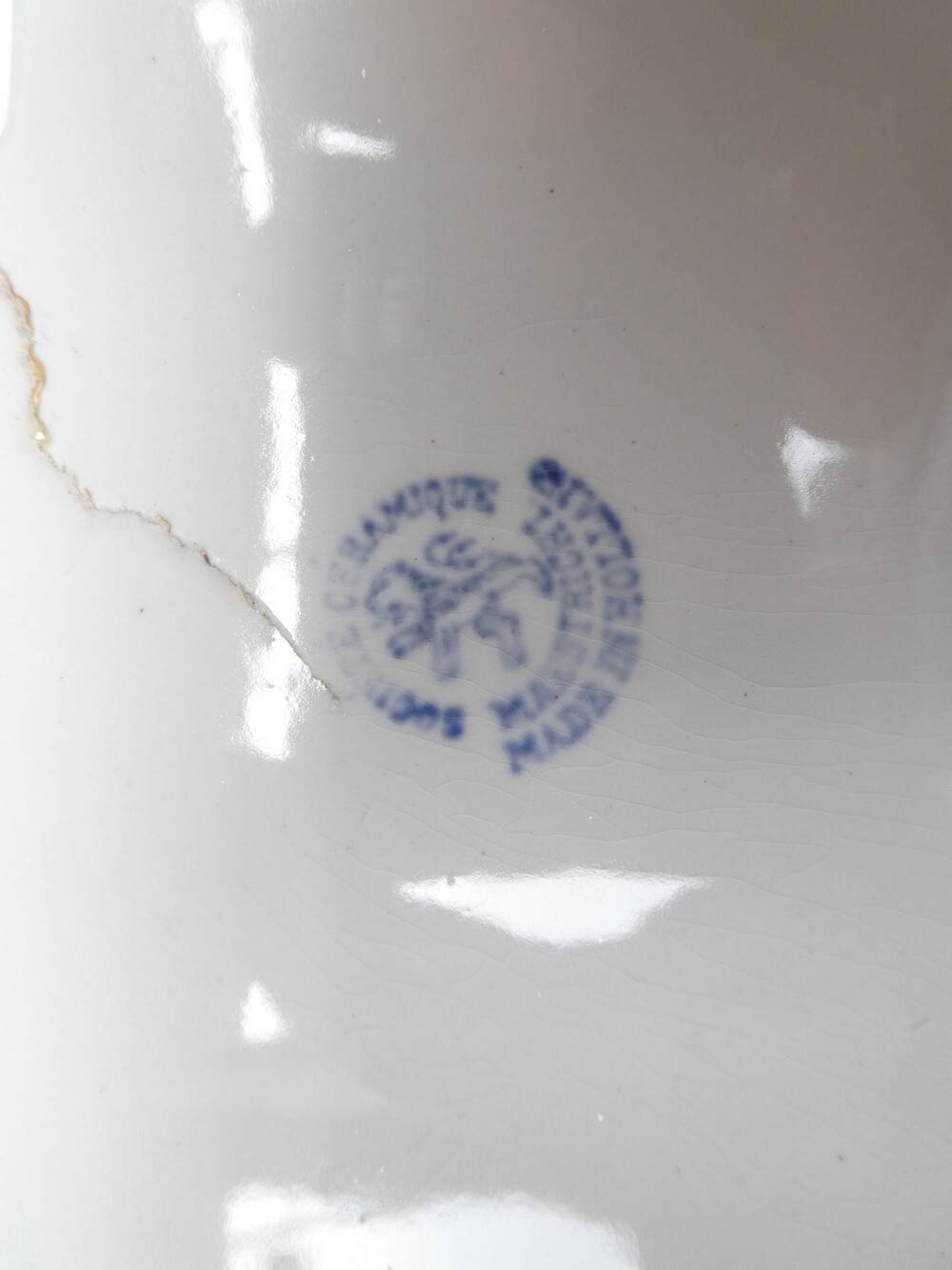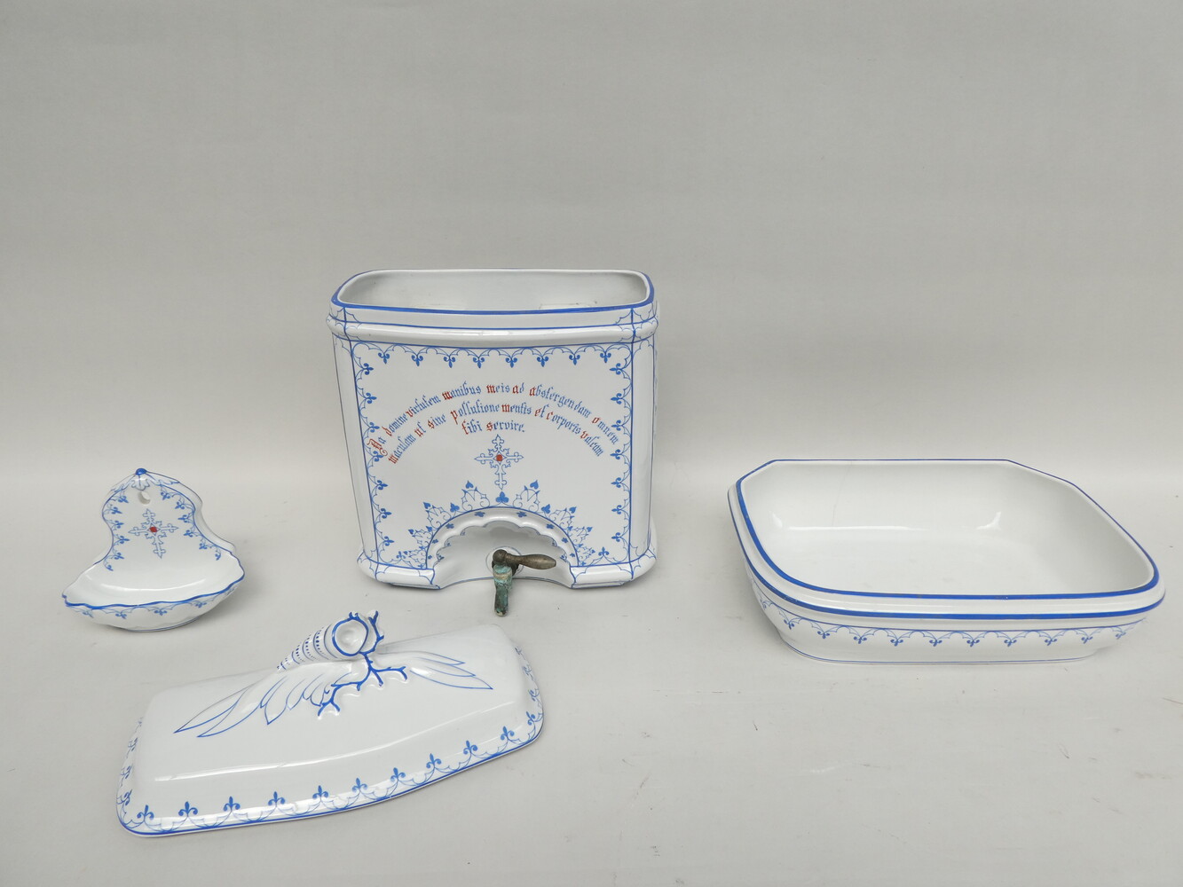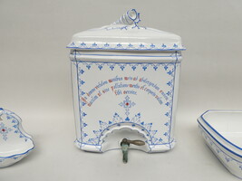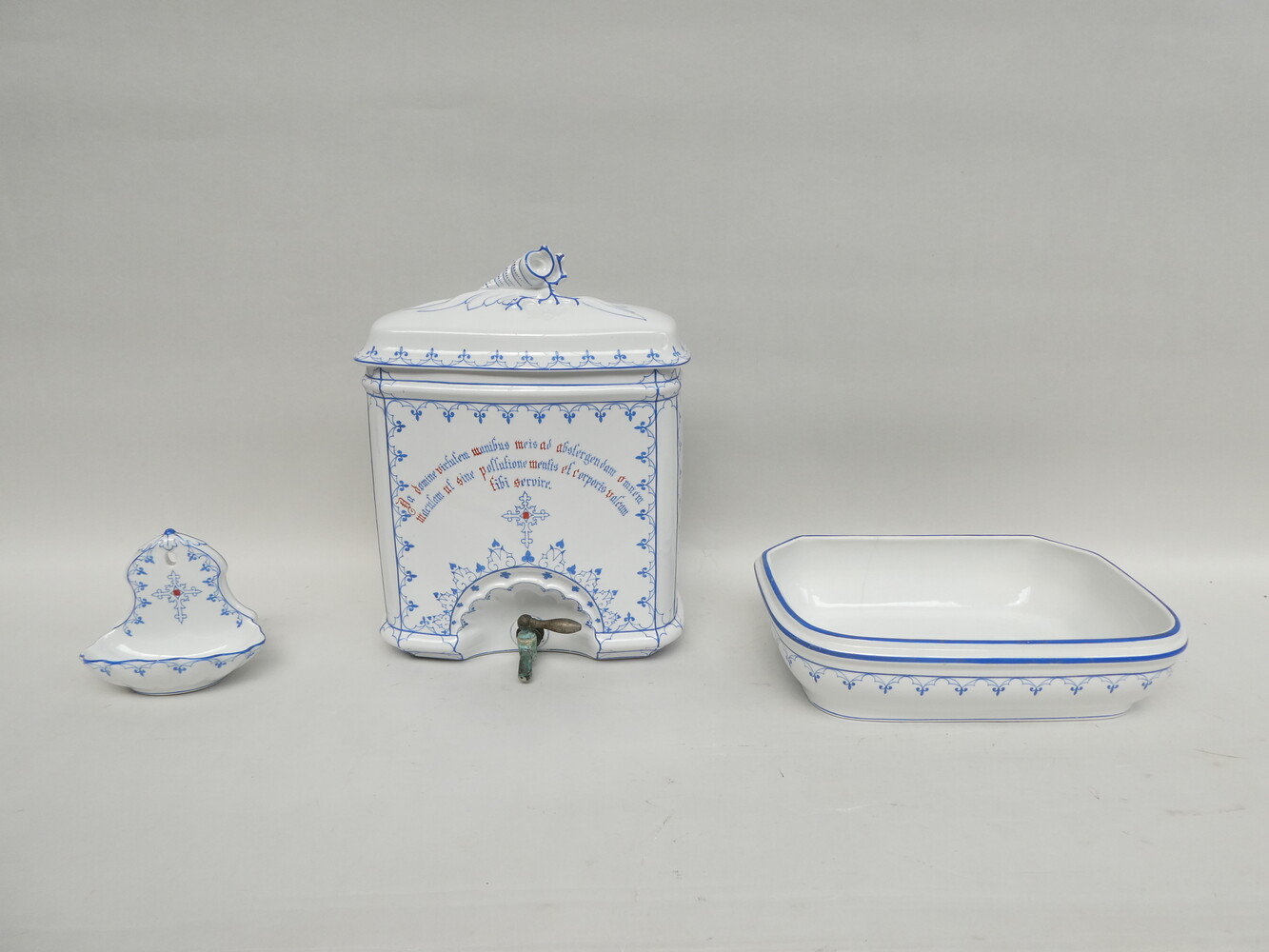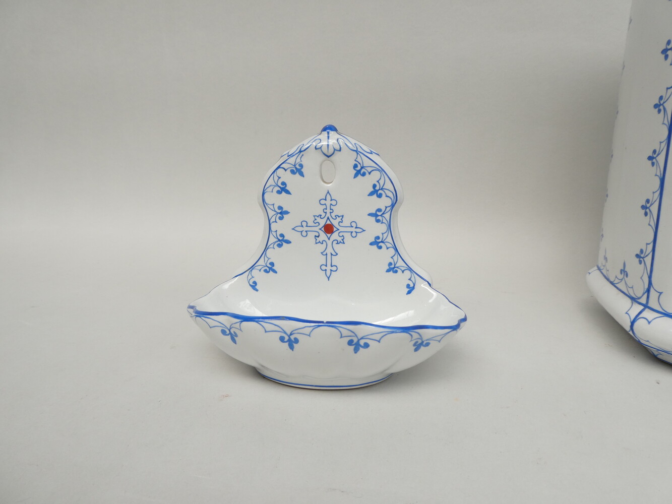 Neogotische lavabo in faiënce 26cmx12cm, hoogte 32cm met opvangbakje ( barstje ) en bijhorend zeepbakje.