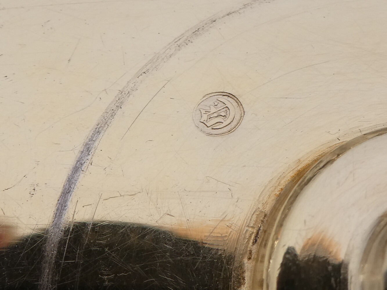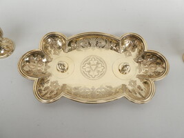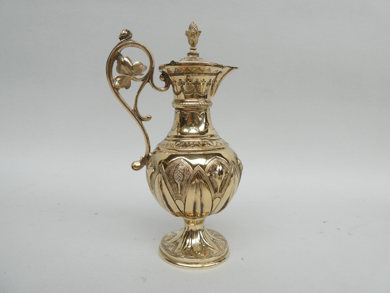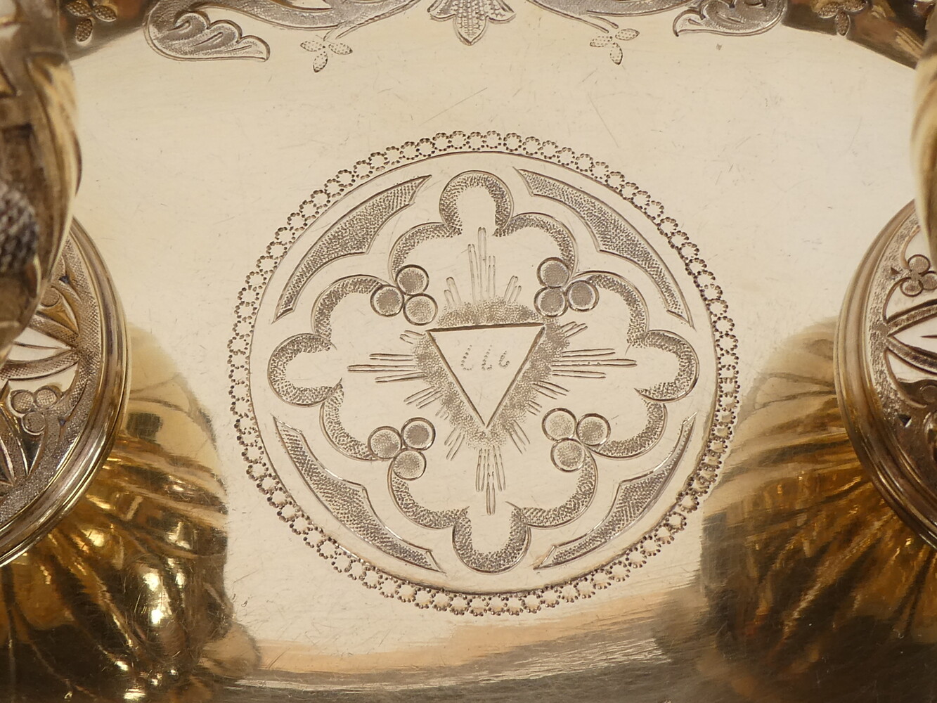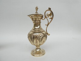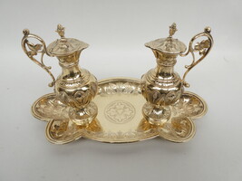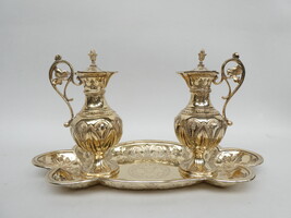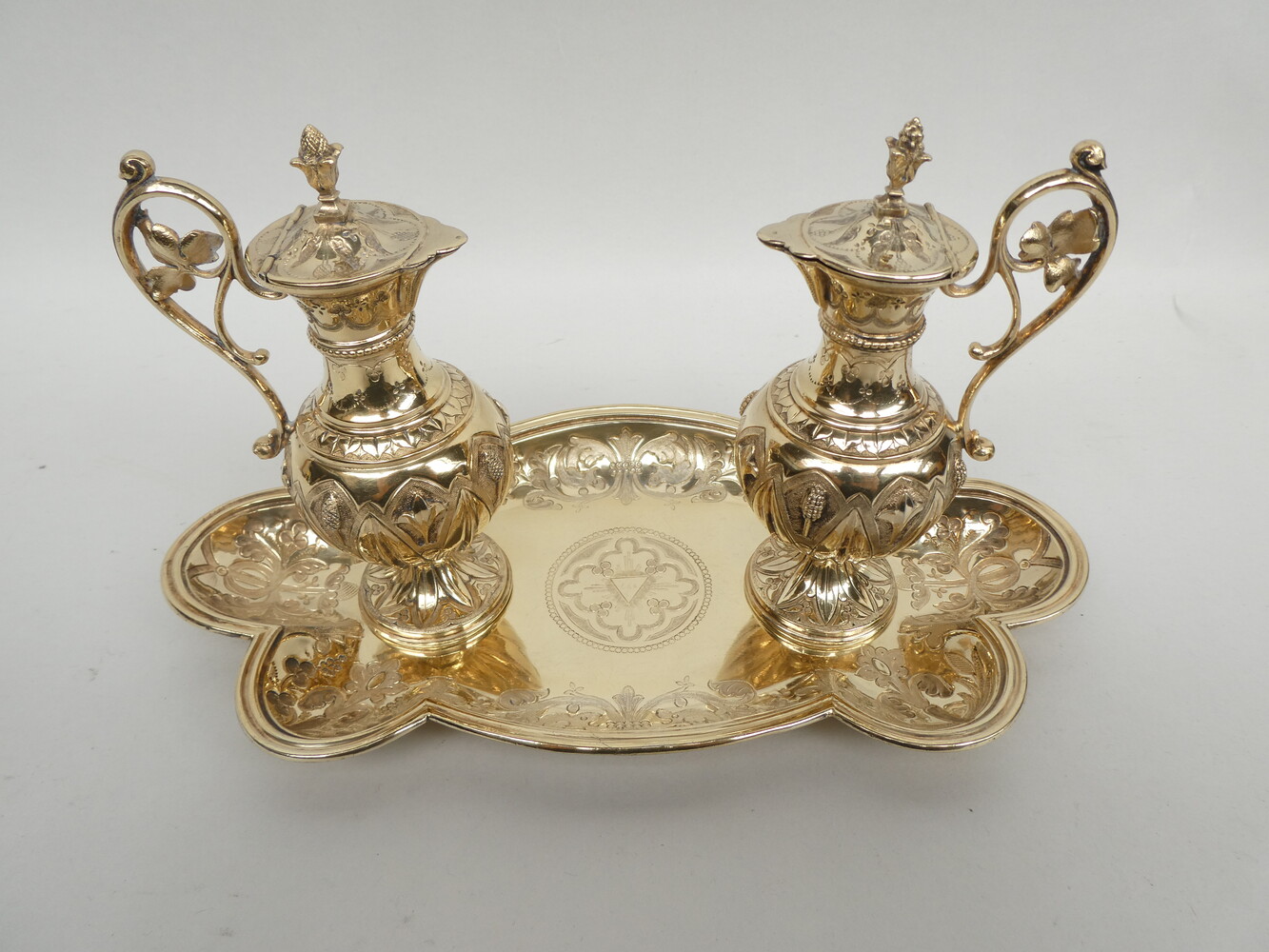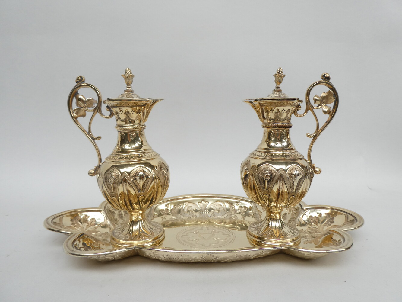 Prachtig zilveren water-en wijnstel met bijhorende onderschaal, verguld. Totale hoogte 14cm. Onderschaal 27cmx13,5cm. Totaal gewicht 480gram. Topkwaliteit !