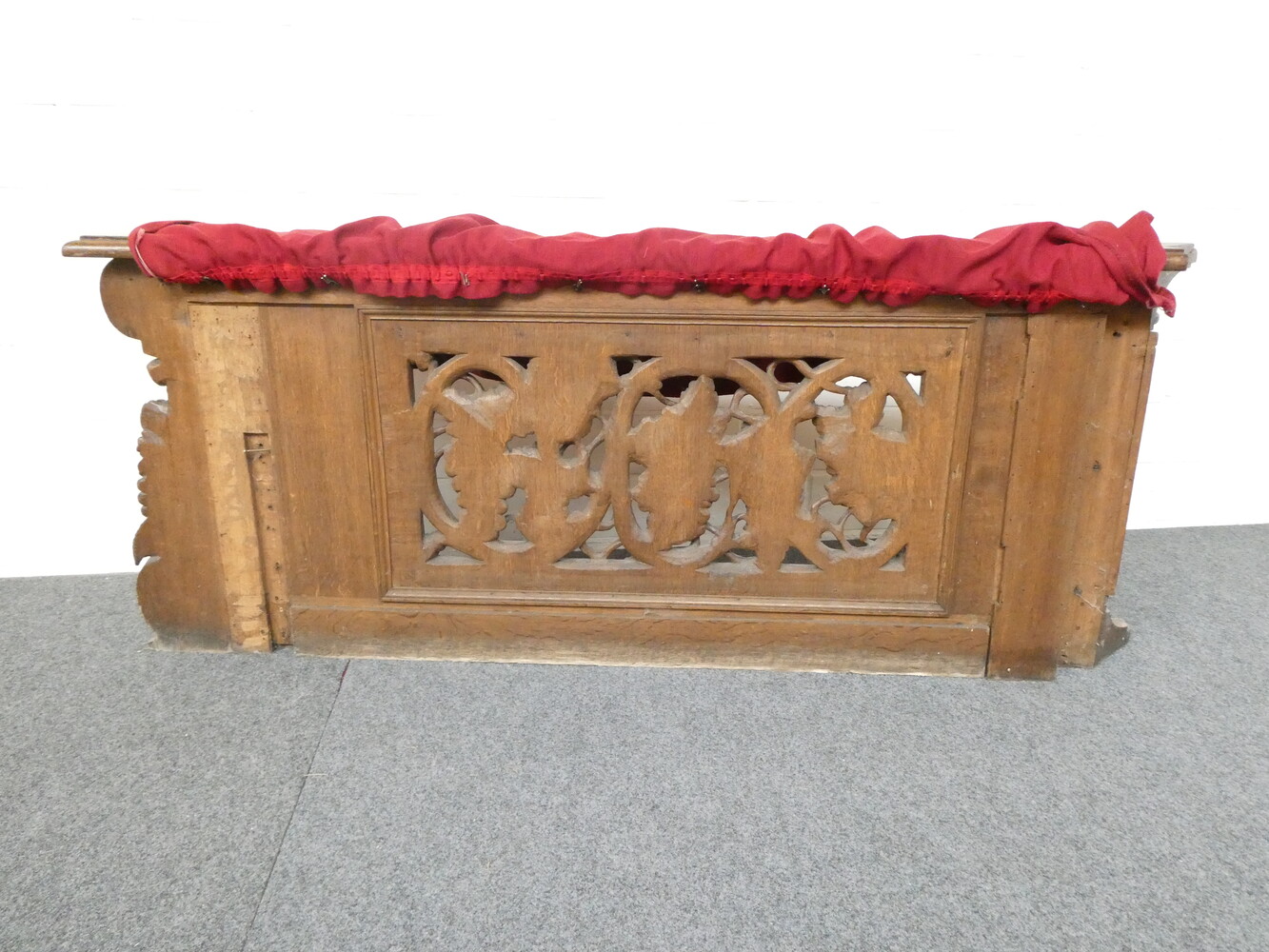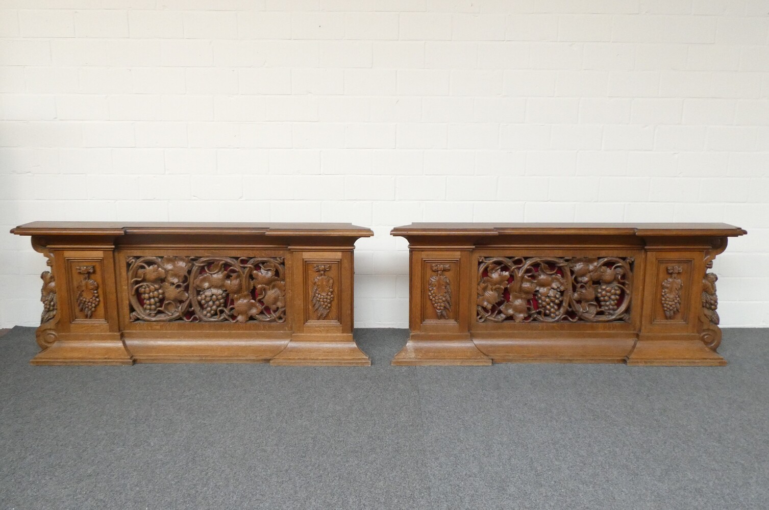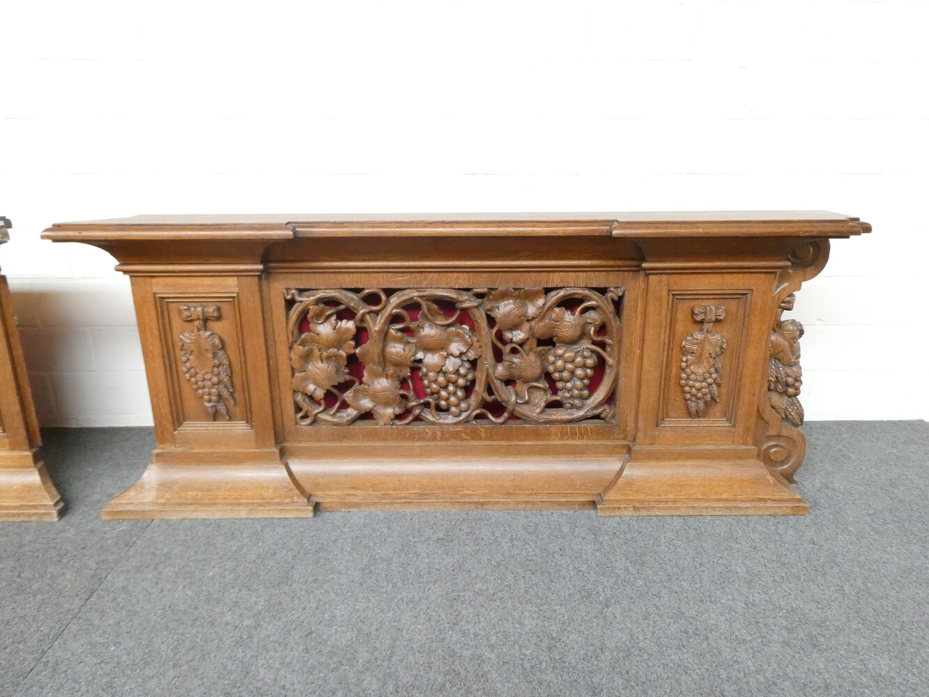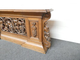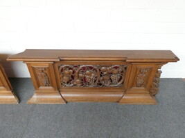 Prachtige gesculpteerde eiken communiebank in twee delen ( links en rechts deel ). Afmetingen per deel : lengte 180cm - hoogte 72cm - breedte 24cm.