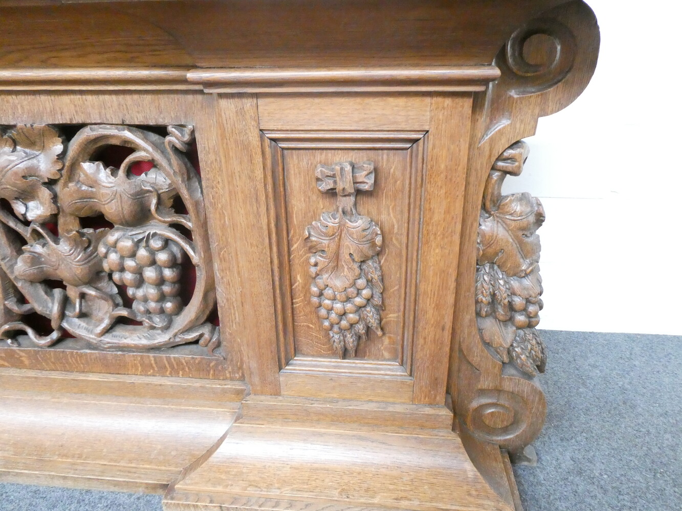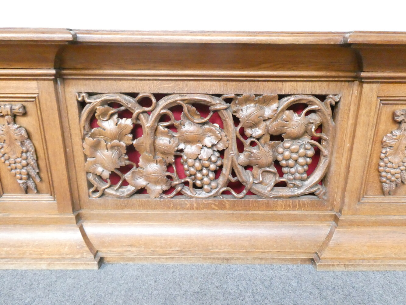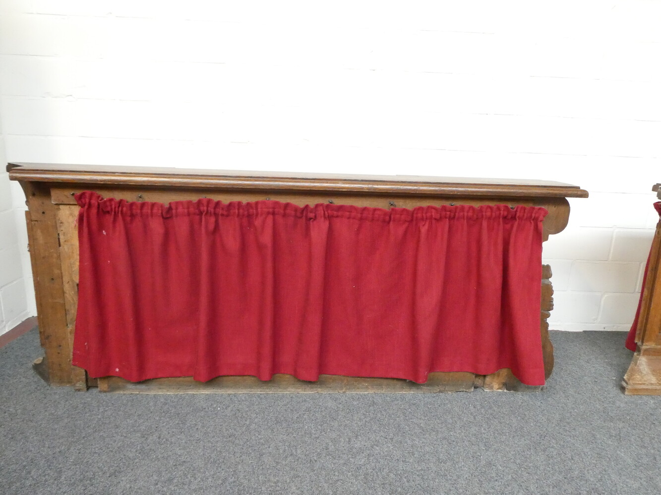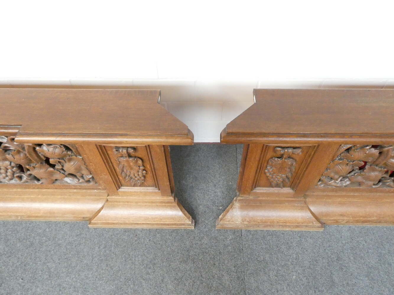 Prachtige gesculpteerde eiken communiebank in twee delen ( links en rechts deel ). Afmetingen per deel : lengte 180cm - hoogte 72cm - breedte 24cm.