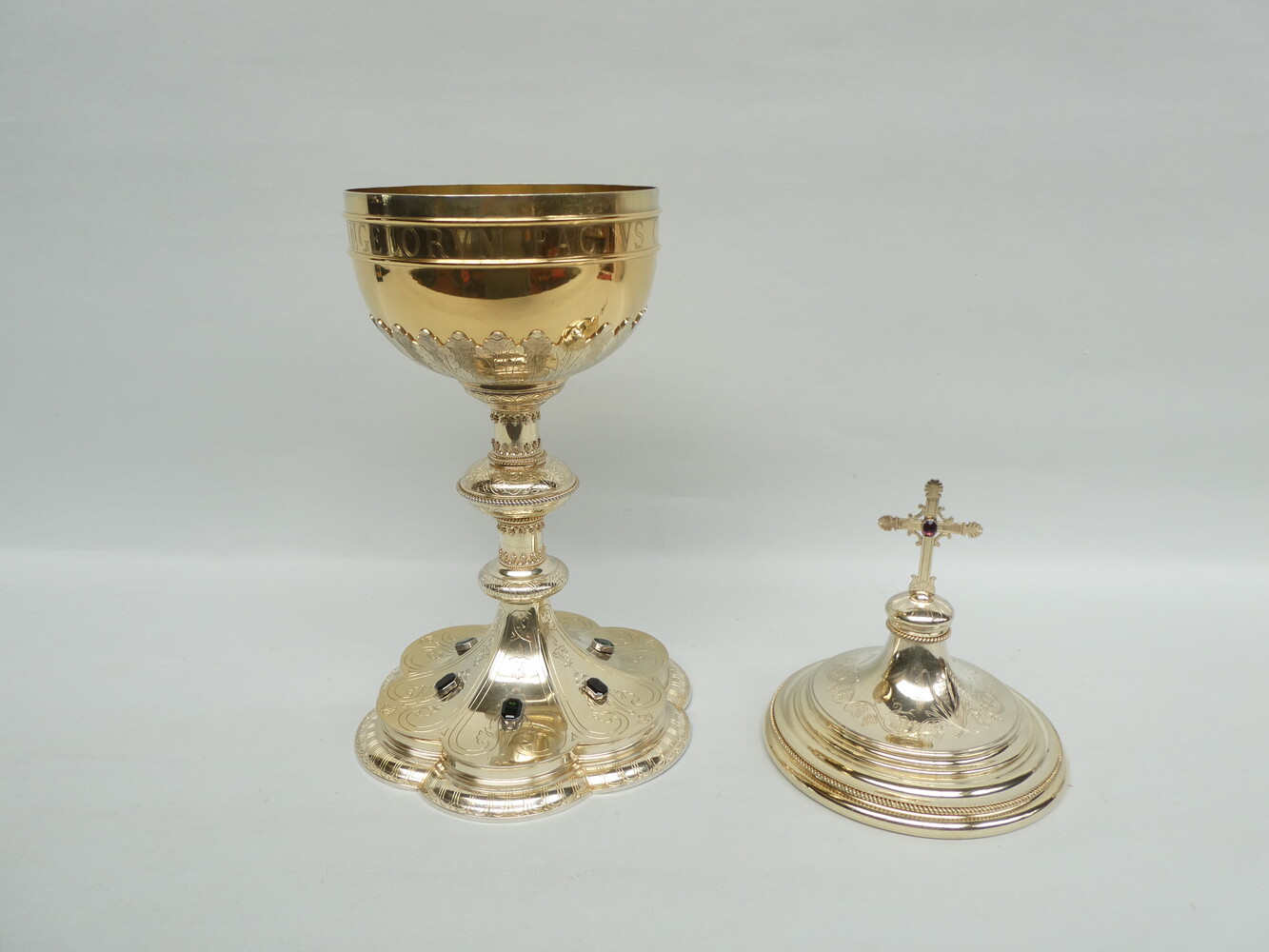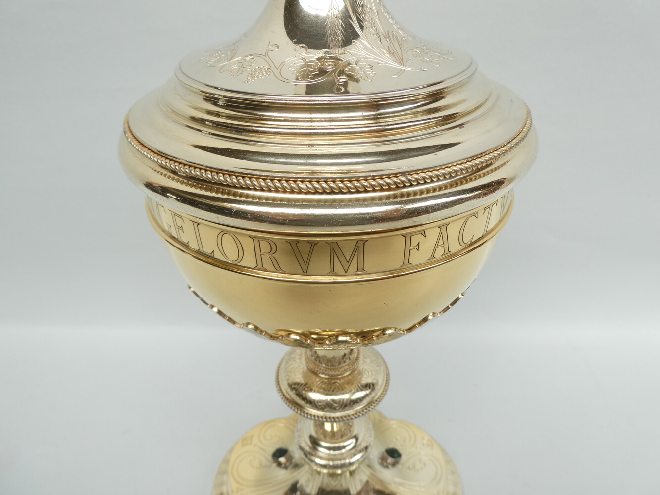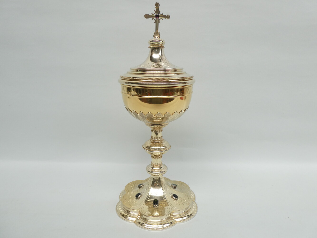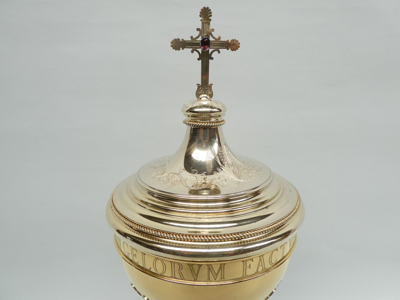 De ciborie heeft een geprofileerd deksel met bovenaan een kruisje met palmetvormige versiering op de kruisarmen en een roze edelsteen ( een morganiet ) in het midden, fijne gegraveerde florale versiering en mooie parelranden.