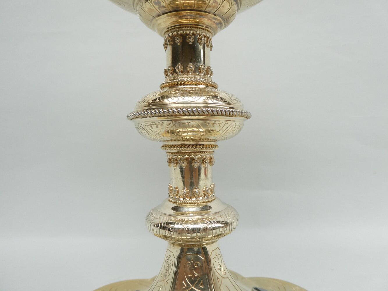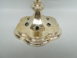 De geprofileerde zeslobbige voet loopt door tot aan de kleine nodus van de stam, heeft fijne florale gravering en zes edelstenen, afwisselend een diepgroene smaragd en een bordeaux rode edelsteen ( rode beryl ), geslepen in "emerald cut" ( rechthoekige of vierkante vorm met afgeslepen hoeken ).
