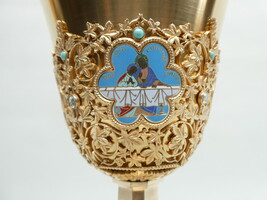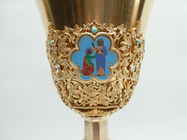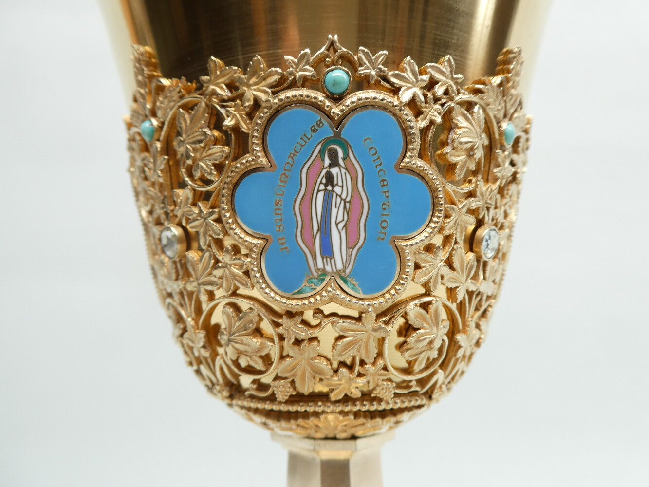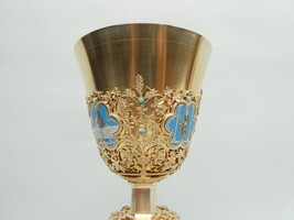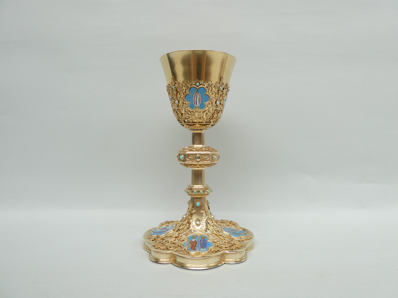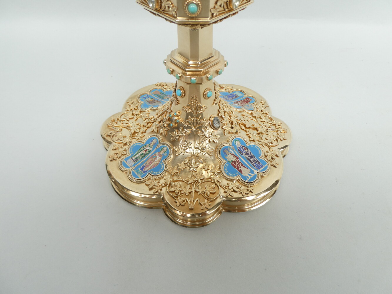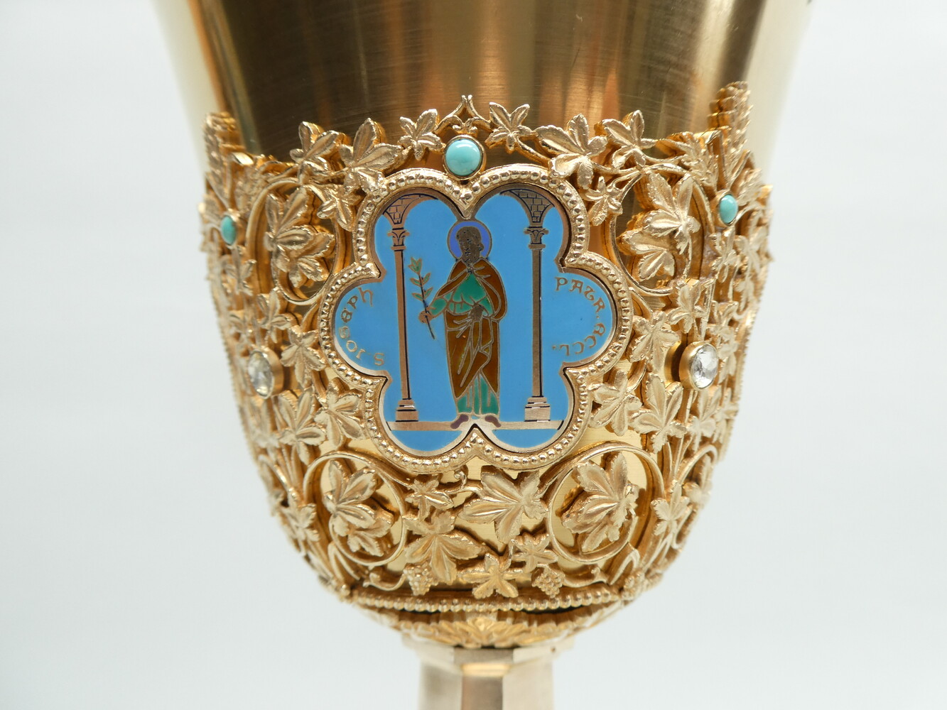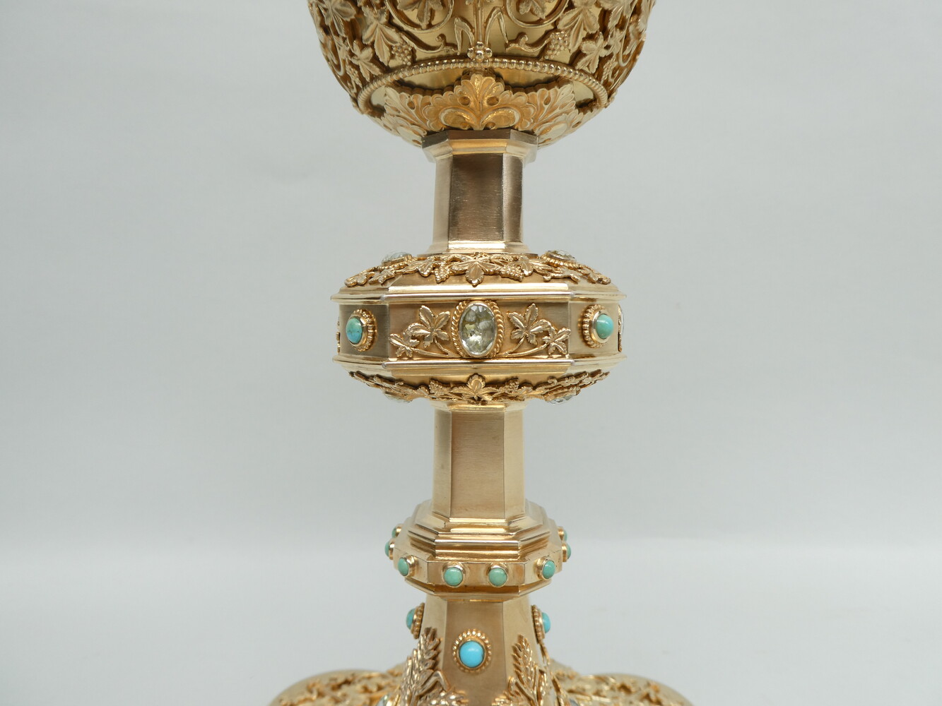Prachtige neogotieke kelk in verguld zilver met een achtpassige voet, met telkens een zeslobbige versiering in émail die werd opgelegd en afgeboord met parelmotief. De voet, nodus en fausse coupe zijn versierd met een opgelegd plantenmotief. De stam is effen en is aan de voet versierd met turkooizen pareltjes en drie geslepen steentjes. De kleine nodus heeft eveneens een turkooizen parelversiering in lijst, de grote nodus heeft een versiering met grotere turkooizen parels en geslepen steentjes. De fausse coupe is eveneens versierd met vier zeslobbige versieringen in émail, gezet in florale decoratie en met ertussen een versiering met geslepen steentjes en turkooizen parels. De cuppa is verguld.