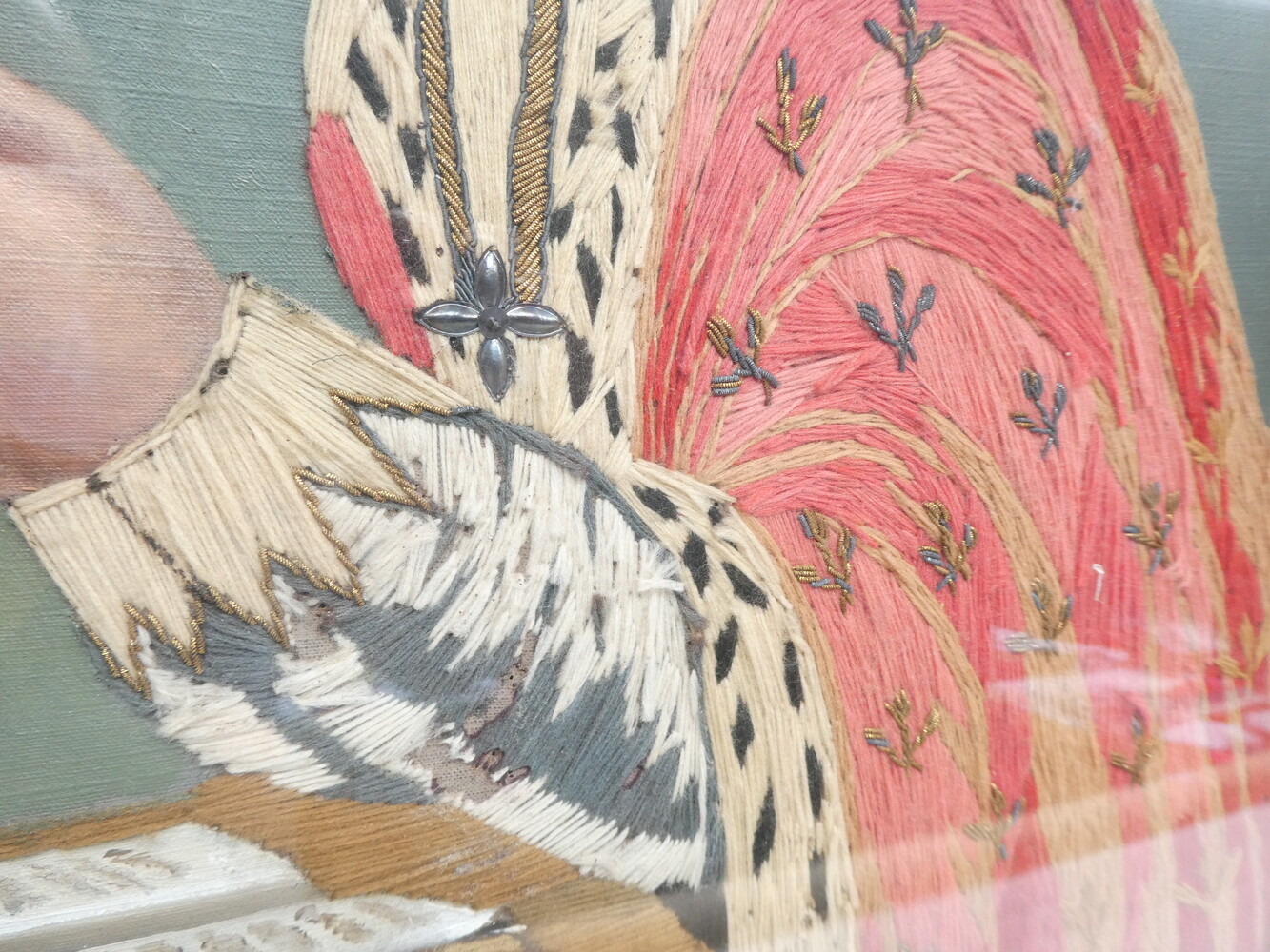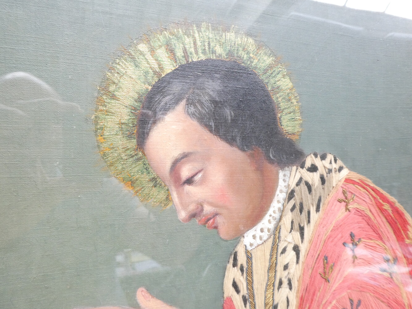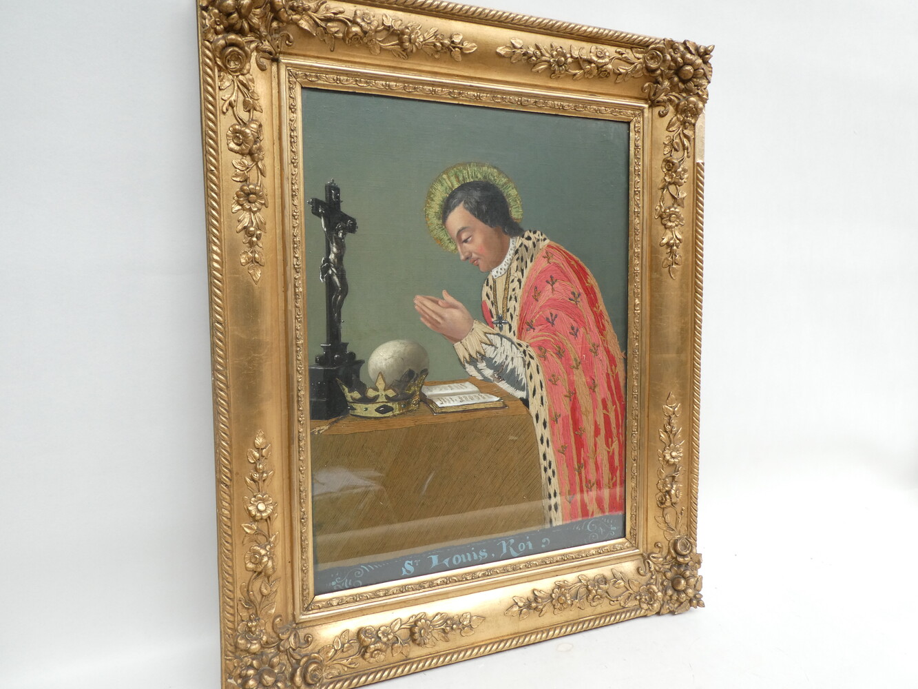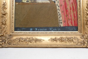 "Sint Lodewijk" schilderij olie op doek met borduurwerk. Mantel en altaar zijn in borduurwerk. 40cm x 53cm - met kader 59cm x 72cm.