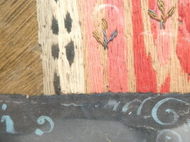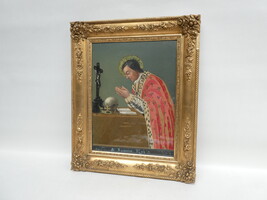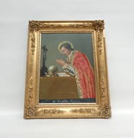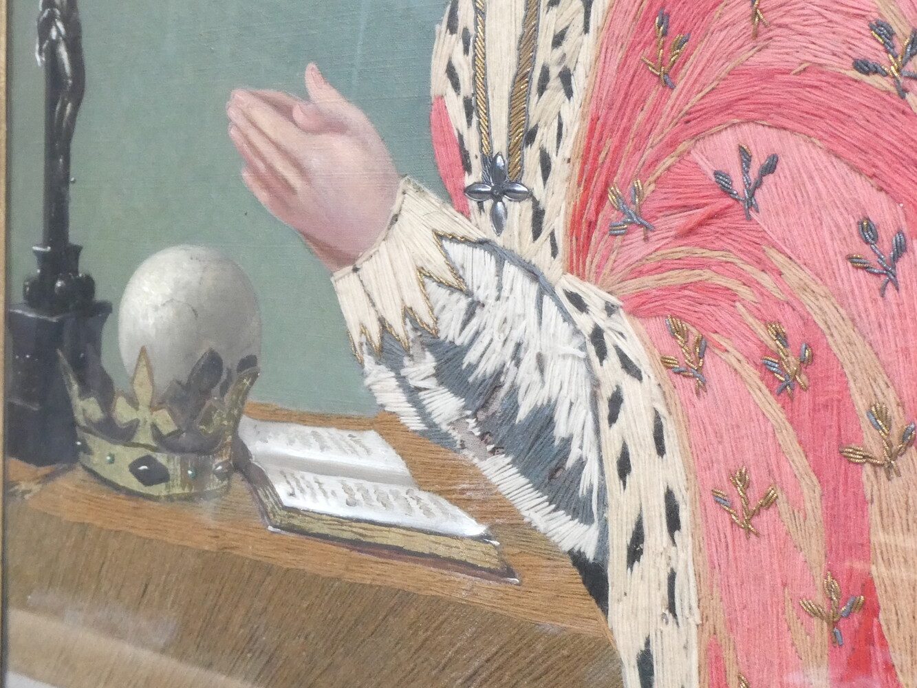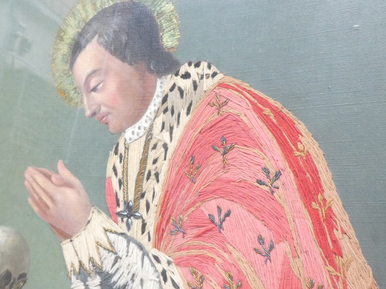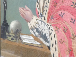 "Sint Lodewijk" schilderij olie op doek met borduurwerk. Mantel en altaar zijn in borduurwerk. 40cm x 53cm - met kader 59cm x 72cm.
