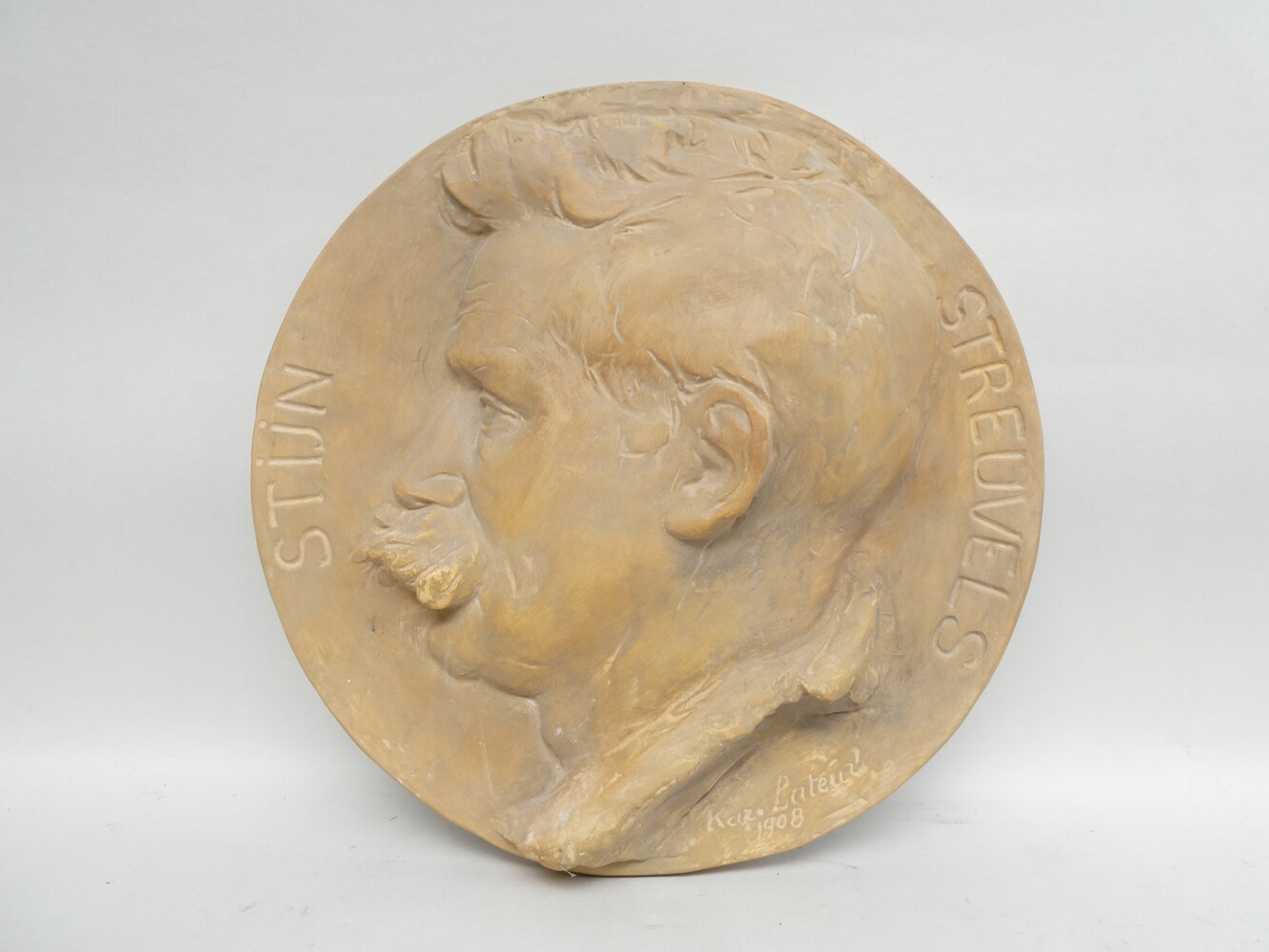 "Stijn Streuvels" rond bas-reliëf in gips, gemerkt Karl Lateur 1908. Diameter 33,5cm.