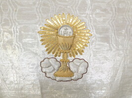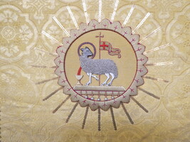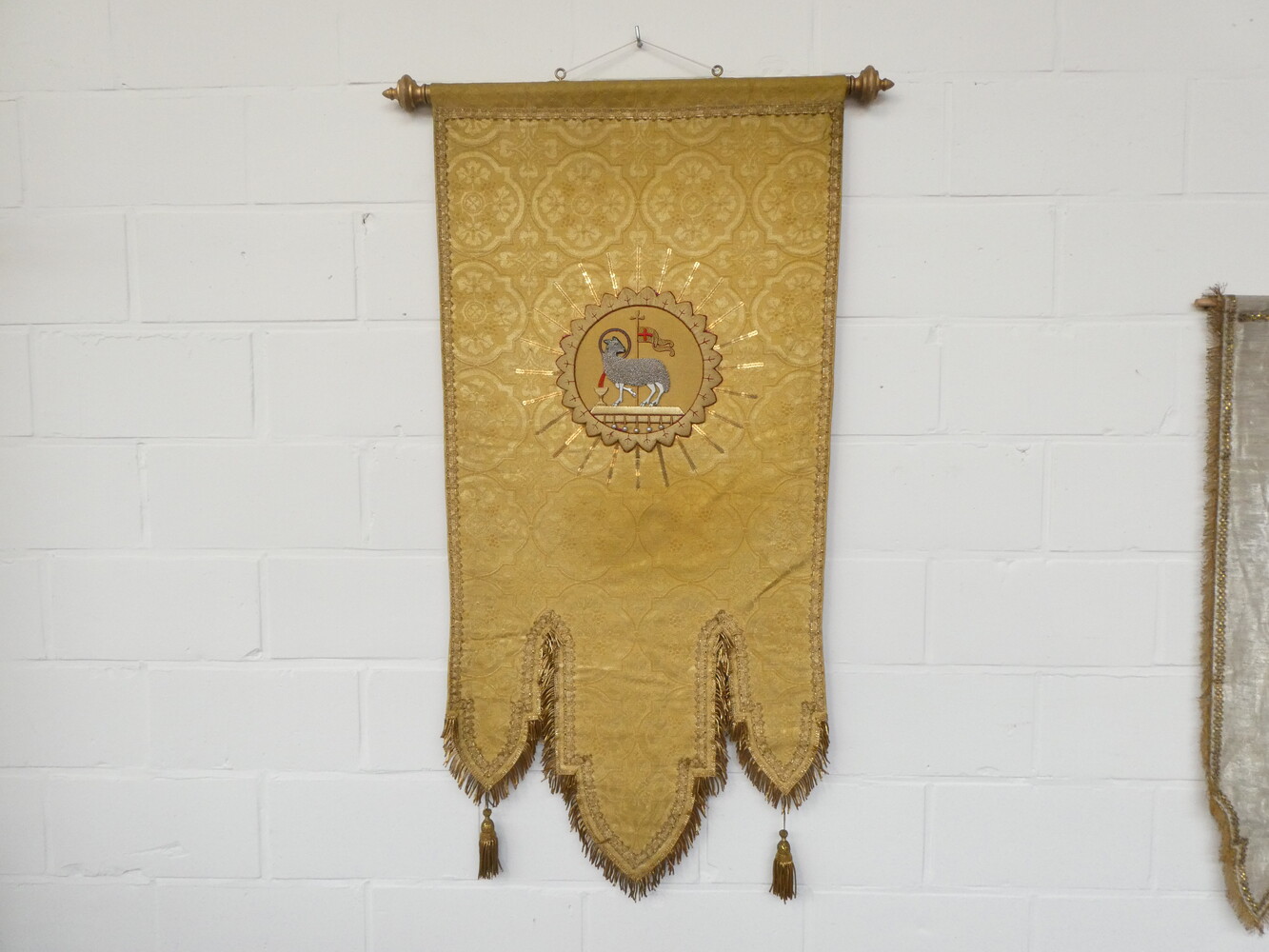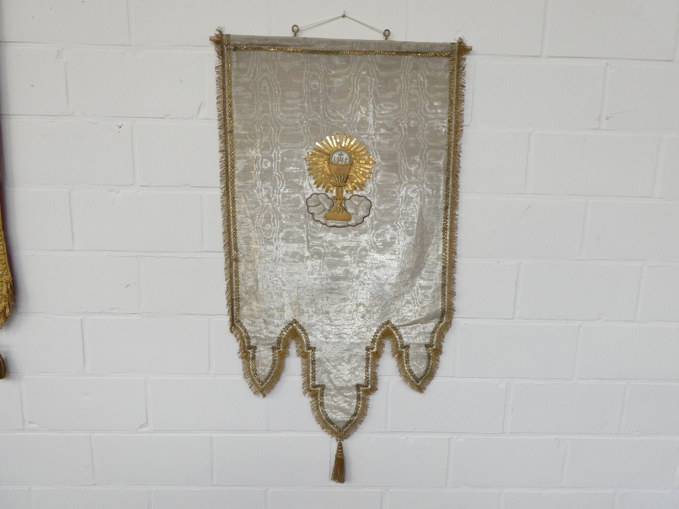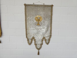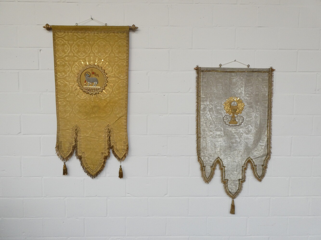 Twee antieke kerkvaandeltjes met brokaat borduurwerk - met kelk 50cm x 105cm - met Lam Gods 50cm x 105cm