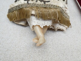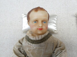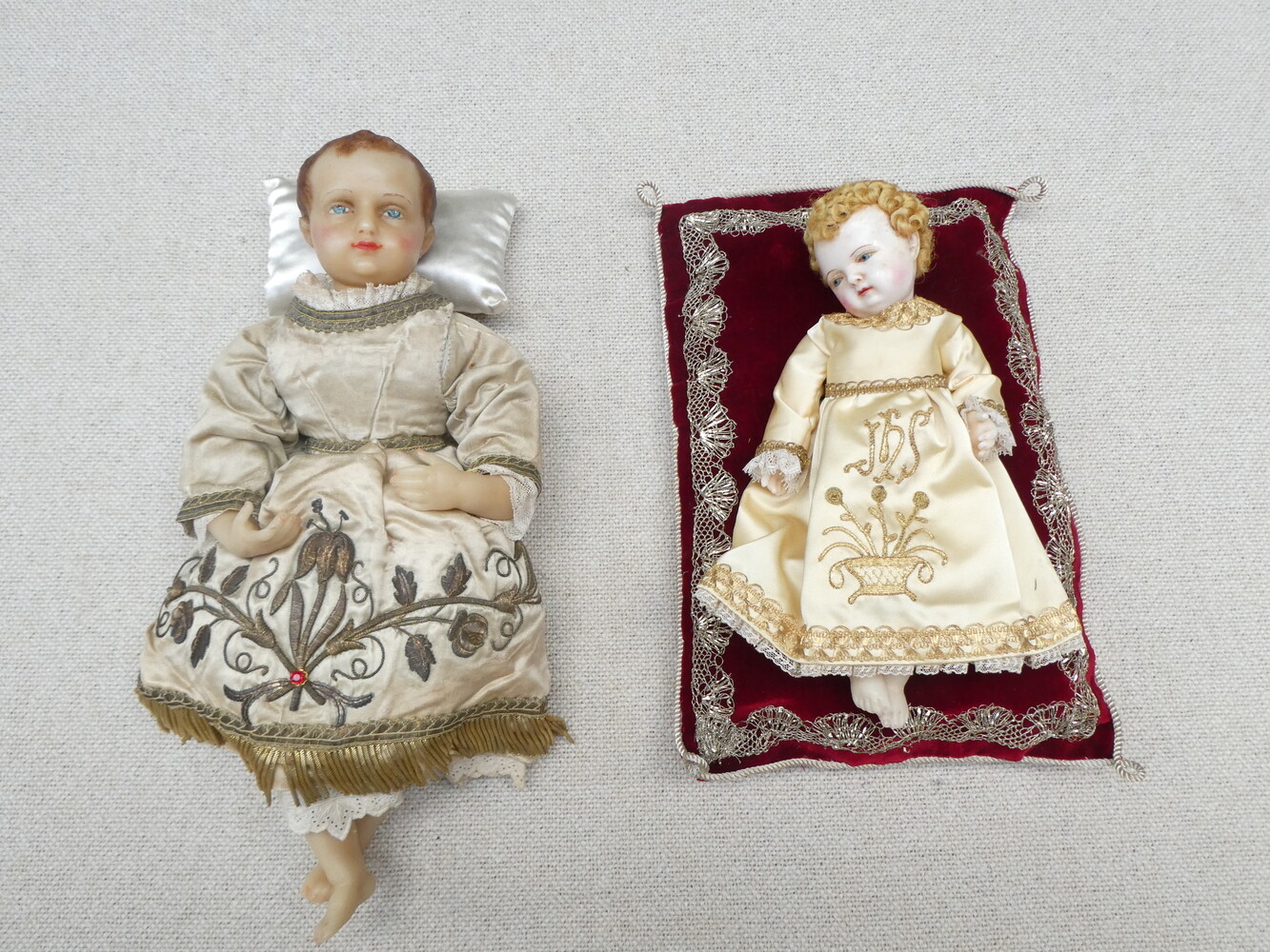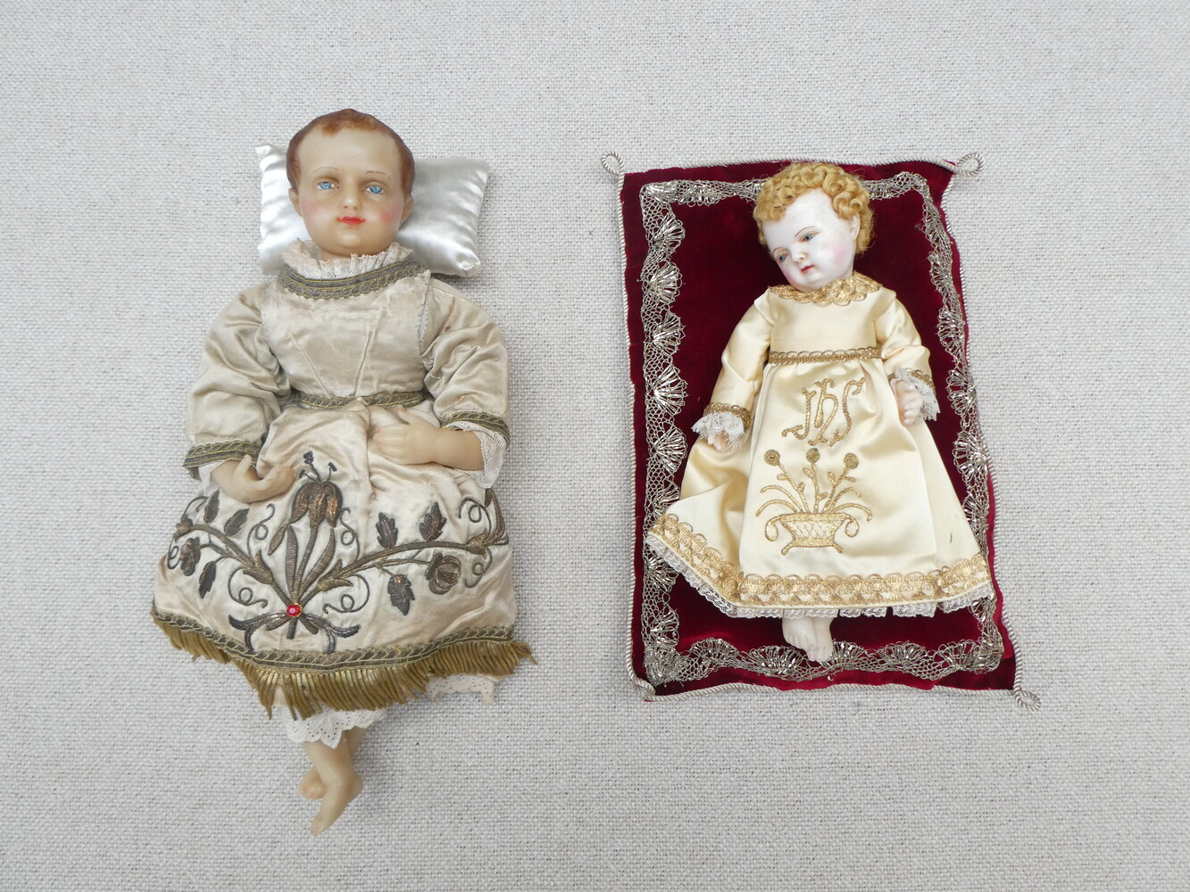 Twee Jezuskindjes in was, de kleedjes met prachtig goudbrokaat borduurwerk.