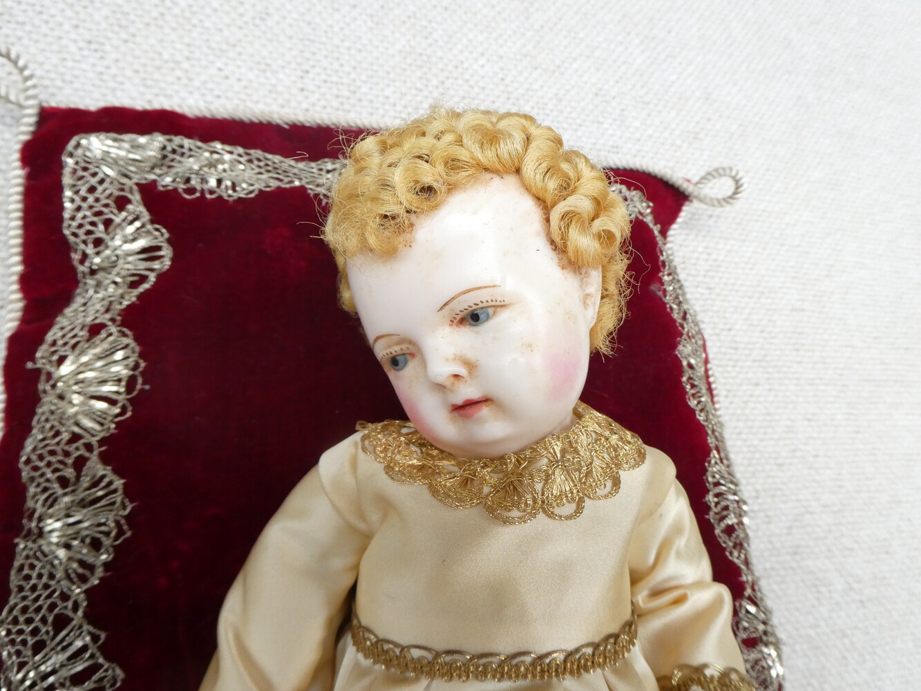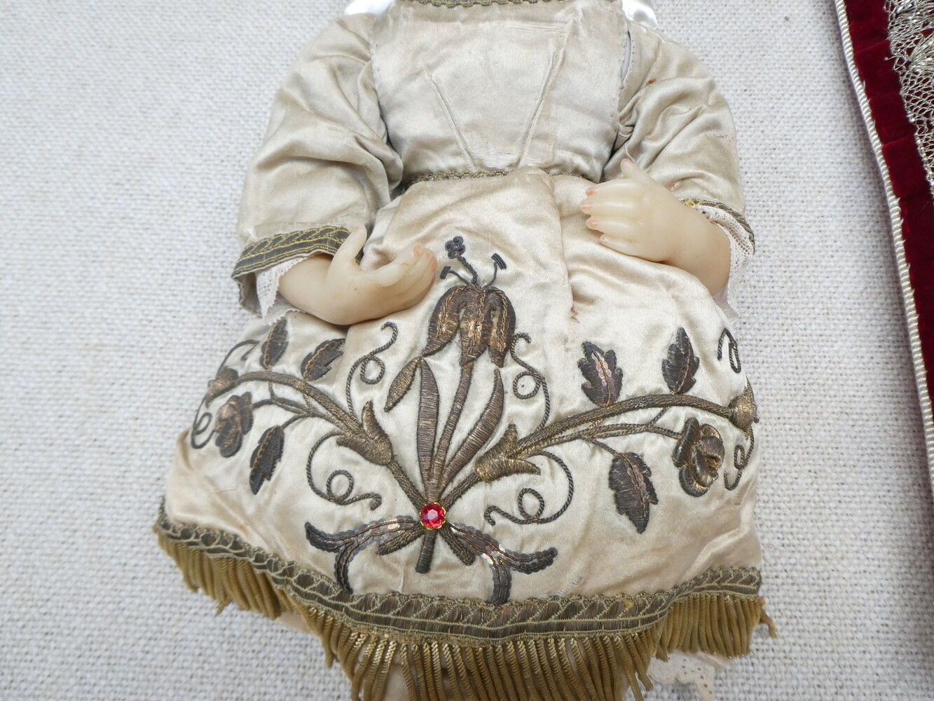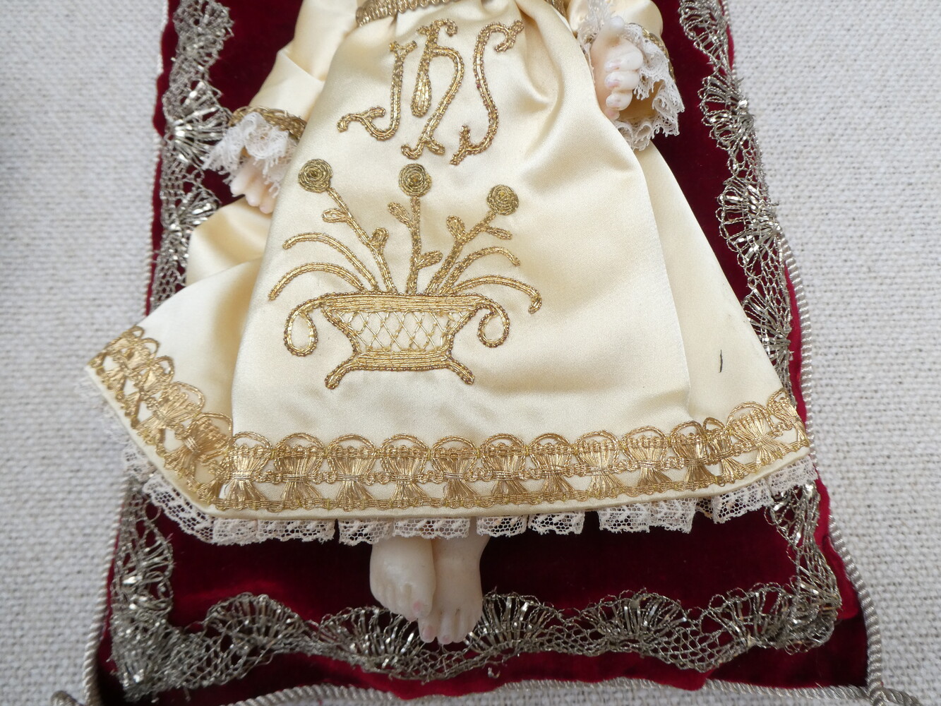 Twee Jezuskindjes, de kleedjes met prachtig goudbrokaat borduurwerk