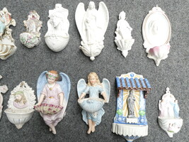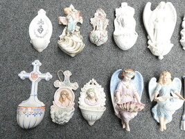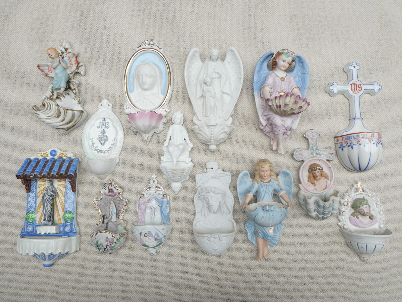 Veertien antieke porseleinen wijwatervatjes, hoogte tussen 16 en 25cm. Geen beschadigingen.
