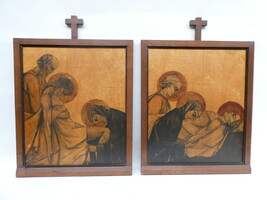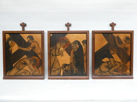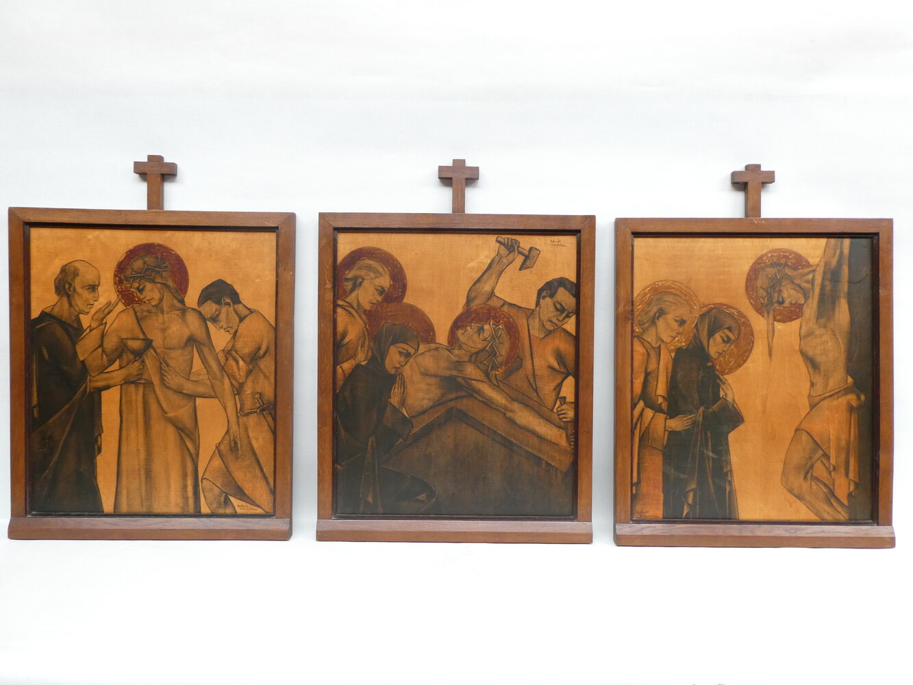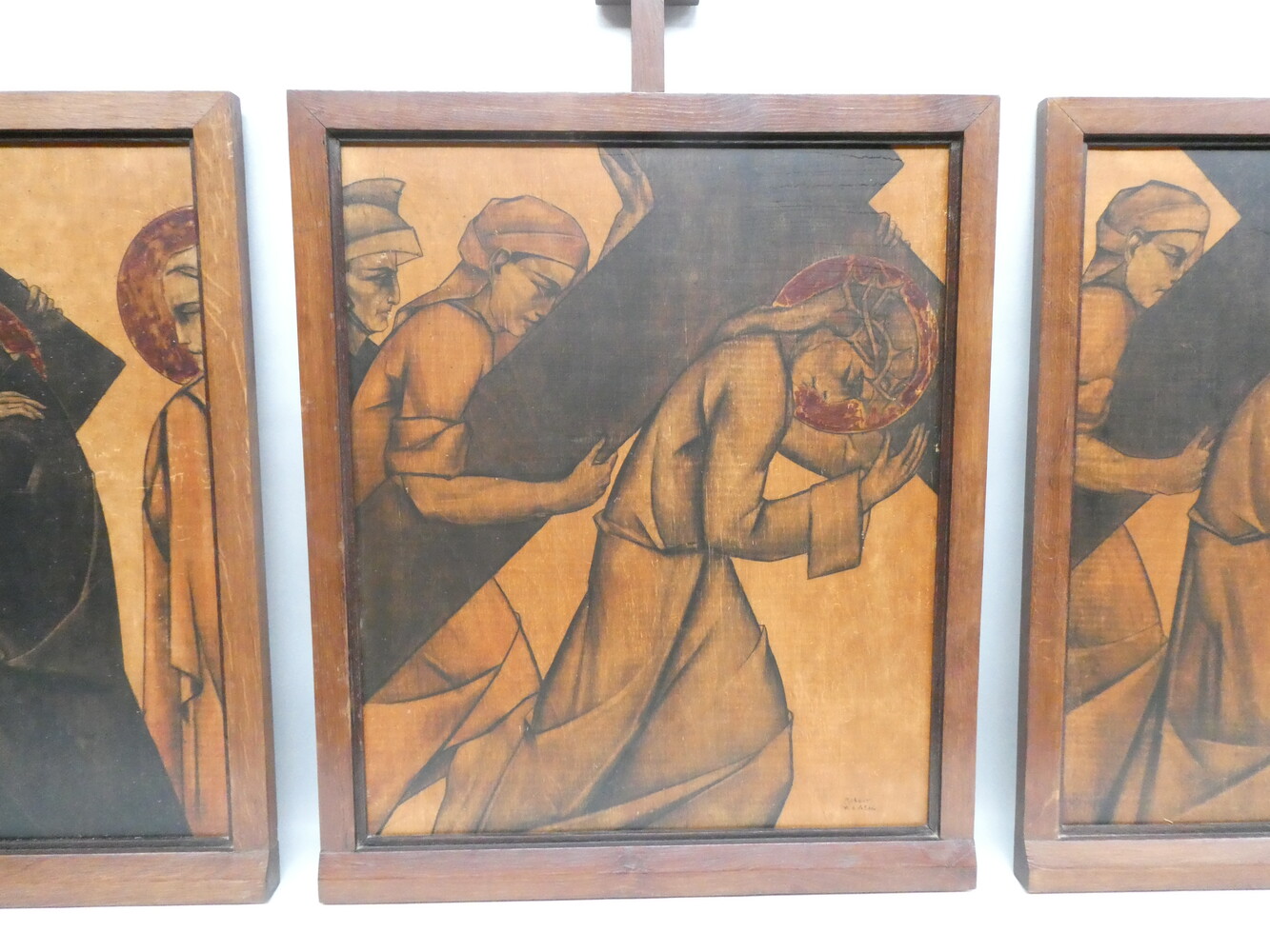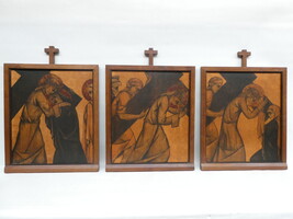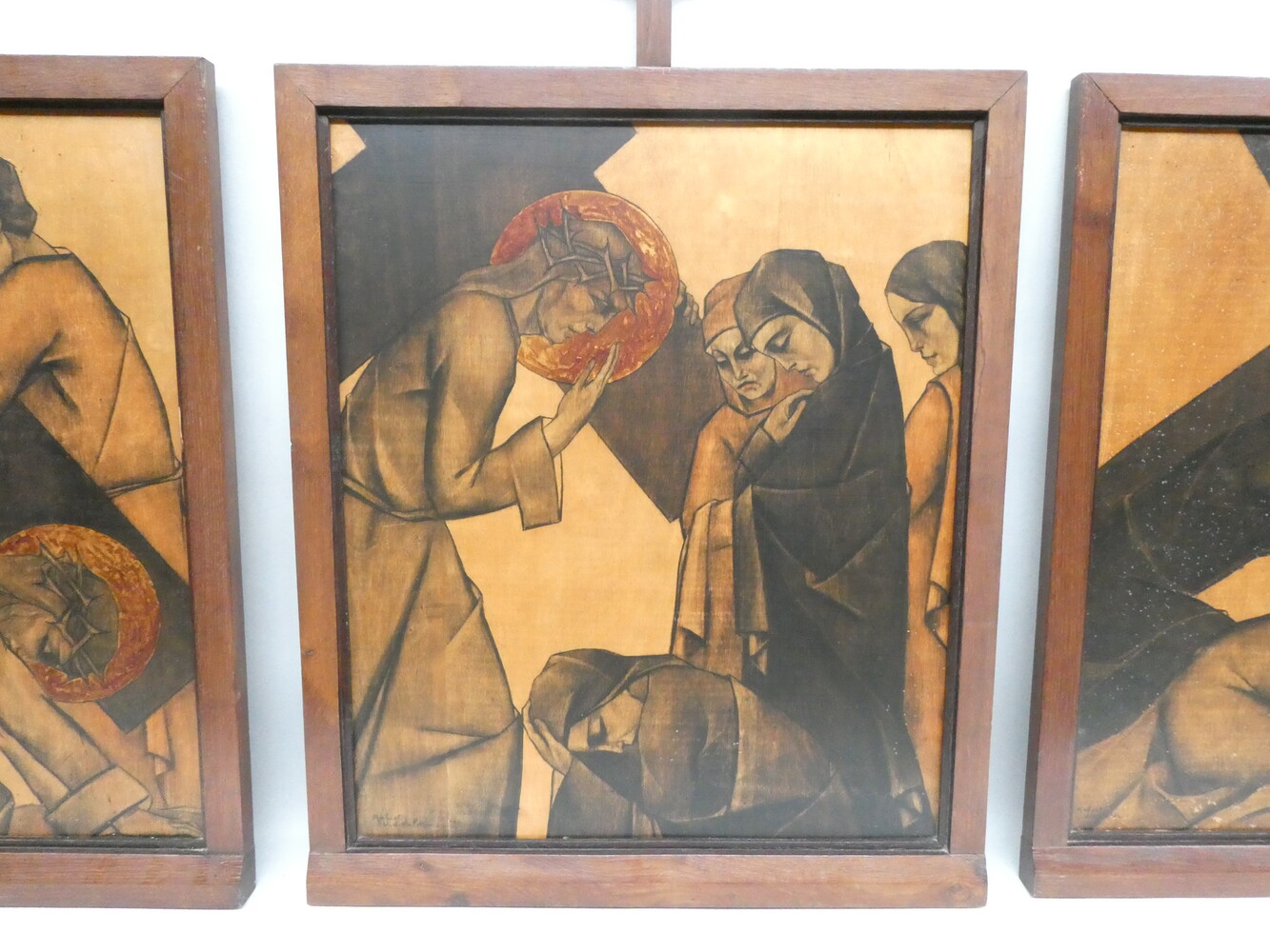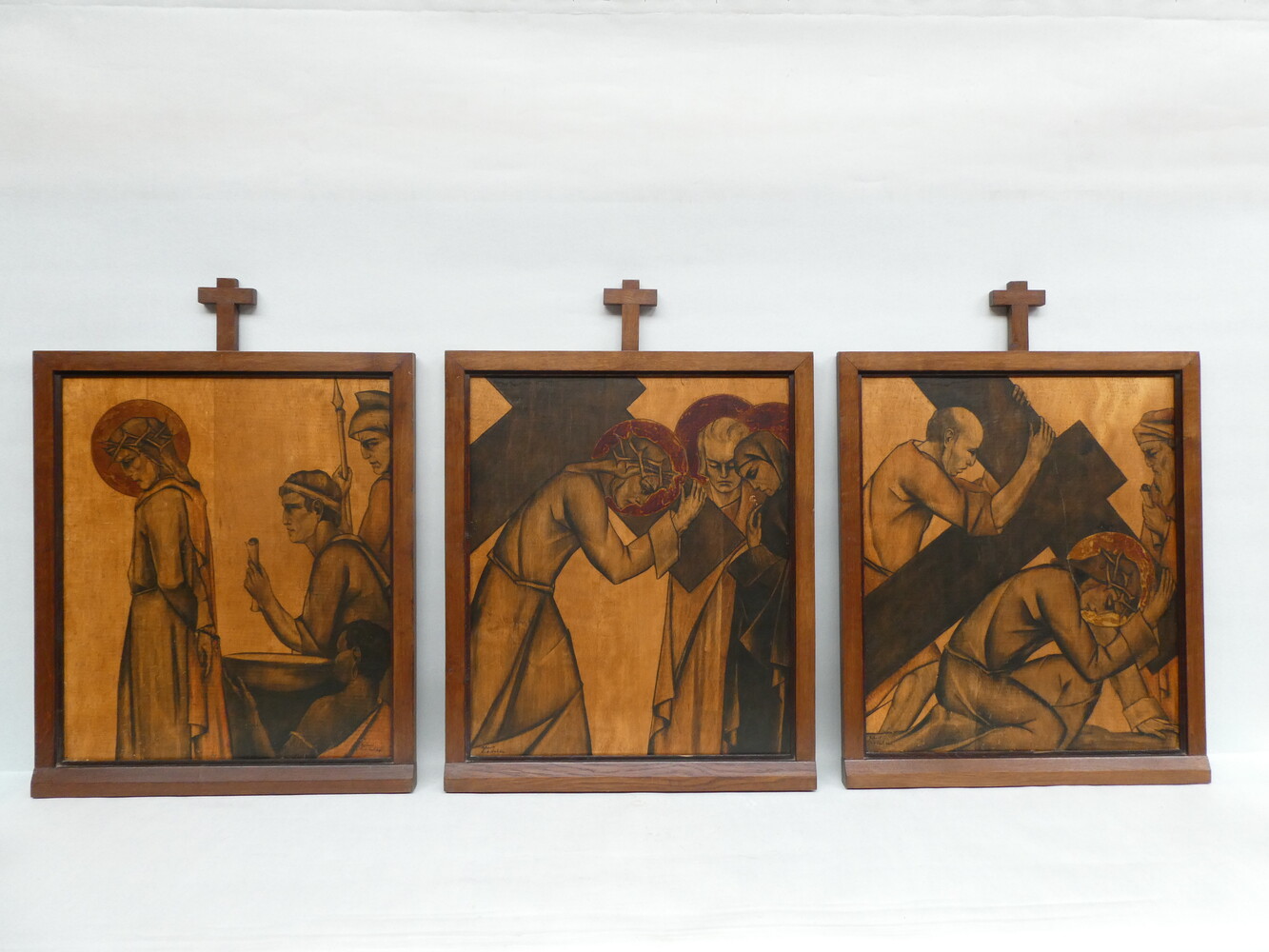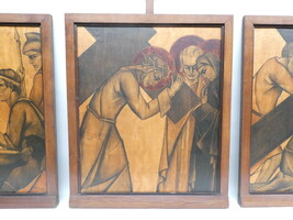 Veertiendelige kruisweg, schildering op hout, van Robert Van De Velde. Afmetingen per statie : 61cm x 73cm. ( enkele met sporen van memel ).
