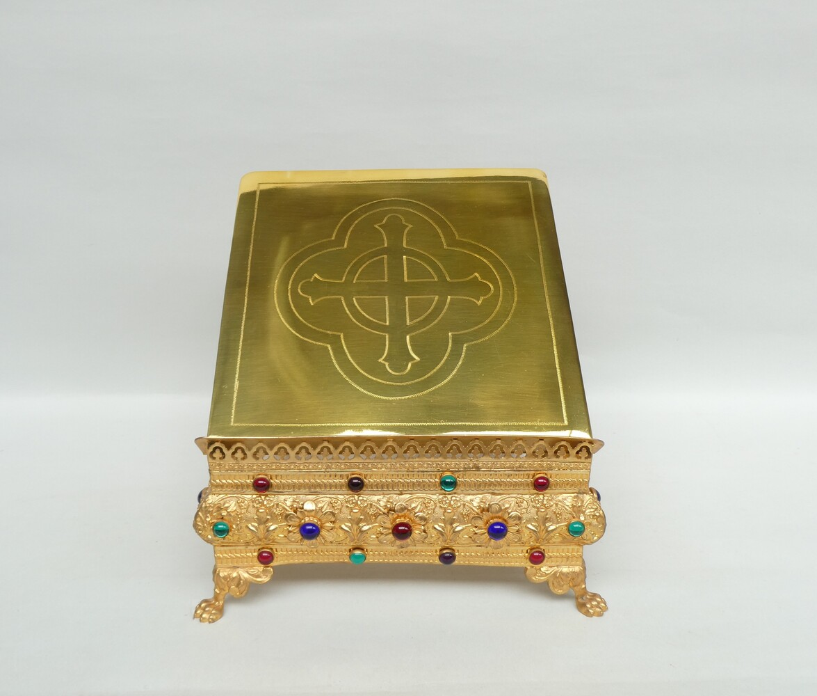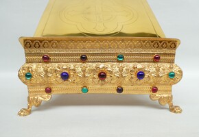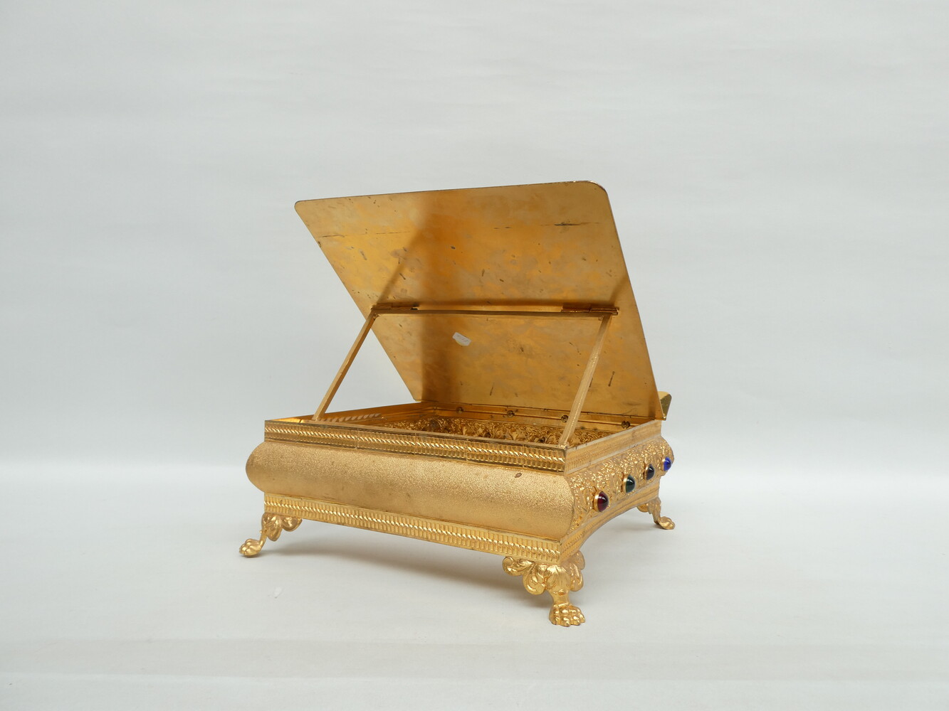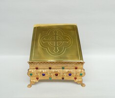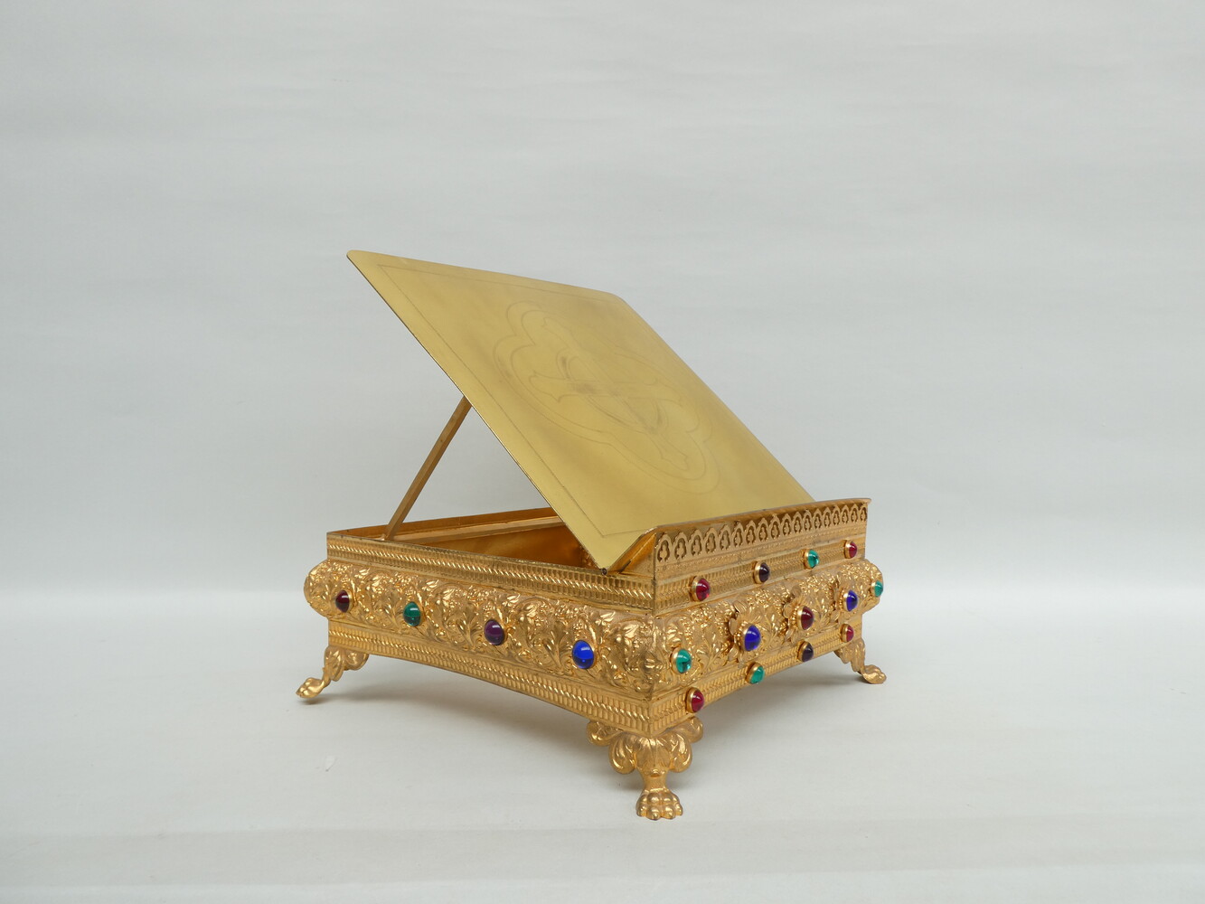 Vergulde koperen tafellezenaar met mooi bewerkte voor-en zijkanten en versierd met gekleurde glasknopen. Rustend op klauwenpootjes. 30cm x 30cm.