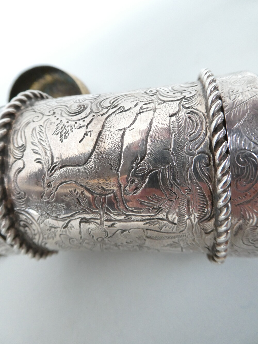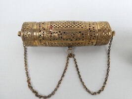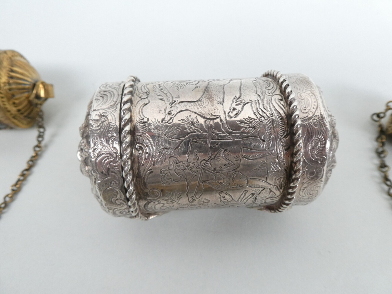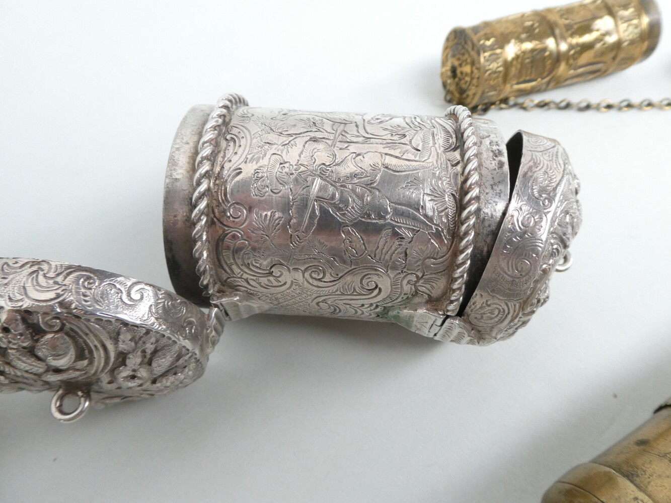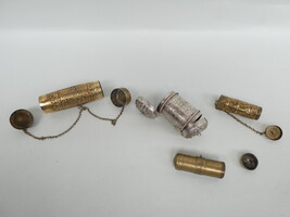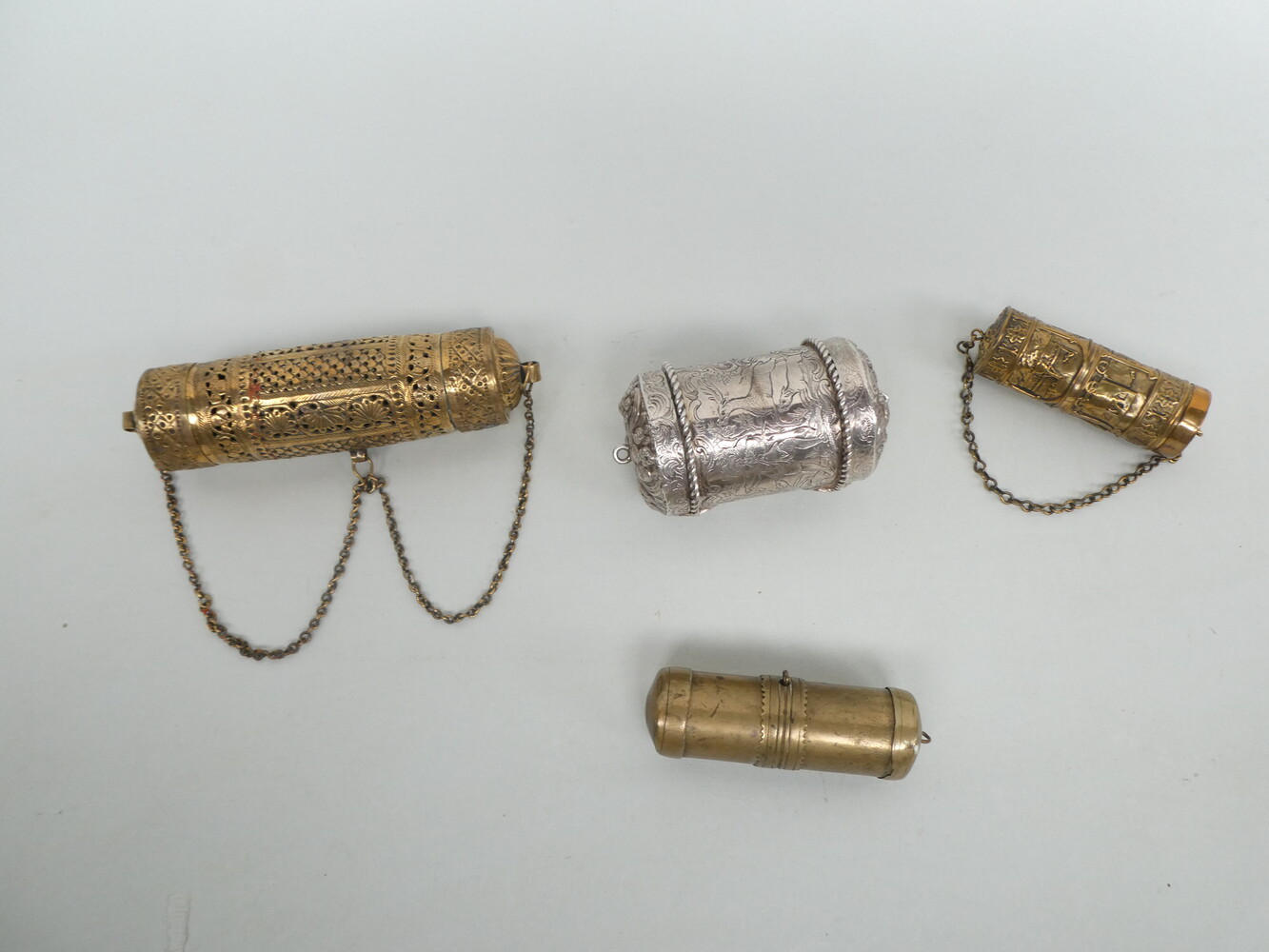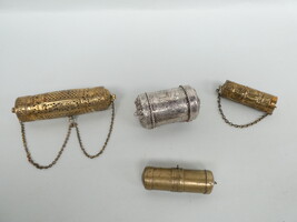 Vier tondeldoosjes, één in zilver lengte 8cm en drie in koper, lengte 13 - 8 en 7,5cm.