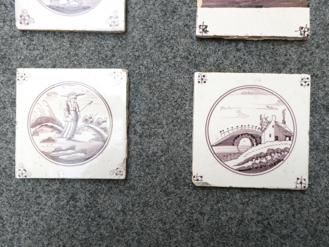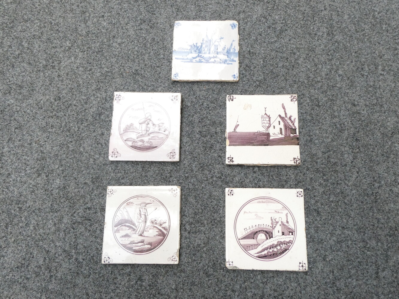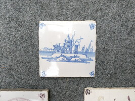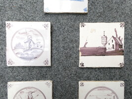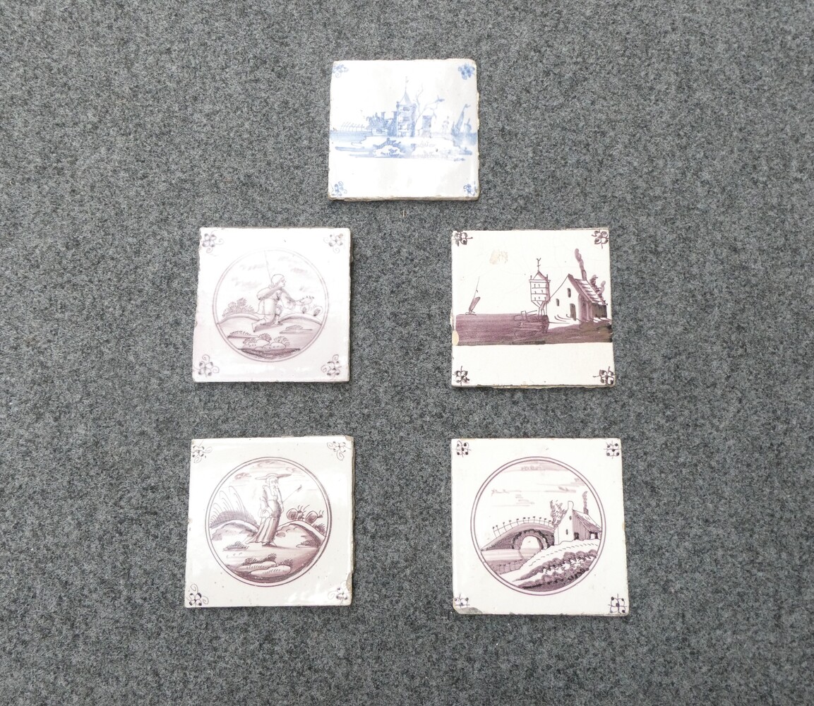 Vijf antieke Delftse tegeltjes, profane voorstellingen