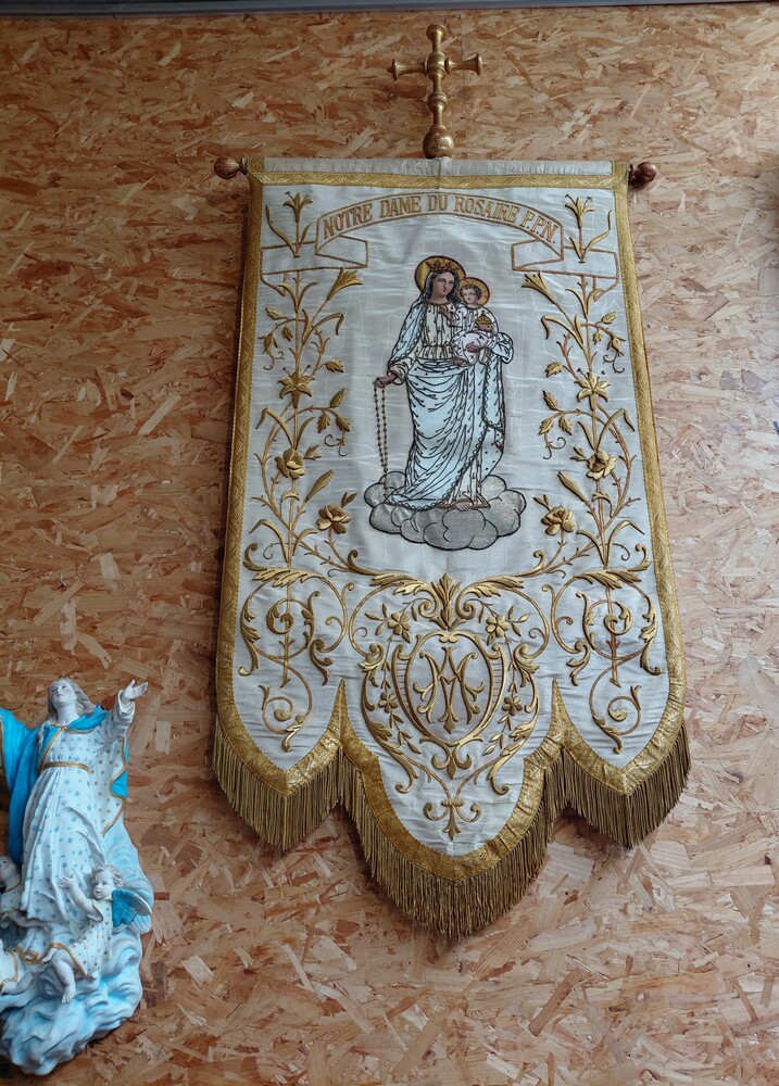 Voor de veiling van zondag 31 mei. Antiek kerkvaandel met mooi goudbrokaat borduurwerk en bovenaan een gedoreerd houten kruis. Er zal terug een zeer mooi aanbod zijn van waardevol religiosa en devotionalia.
