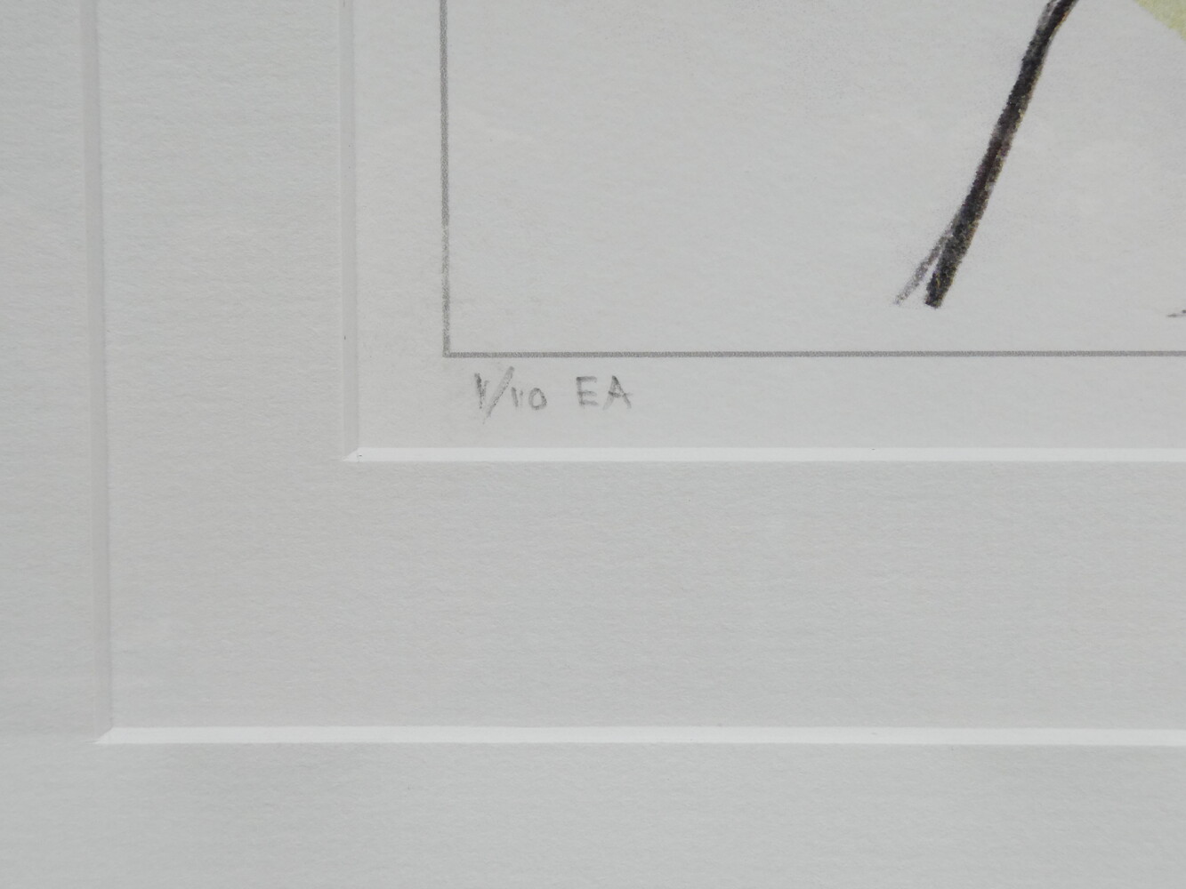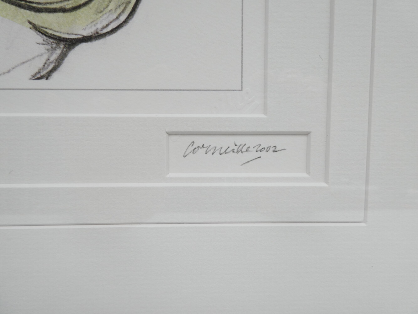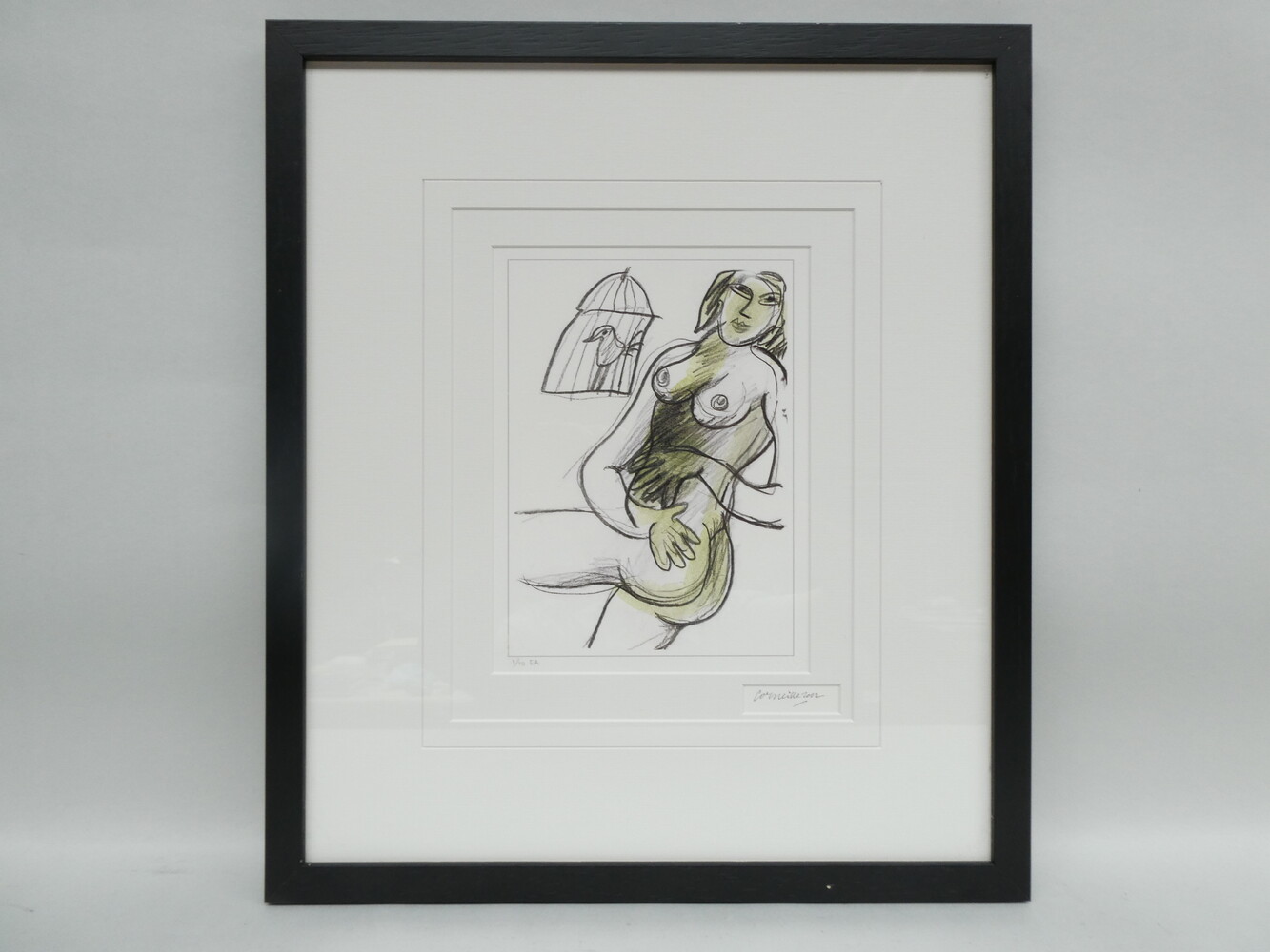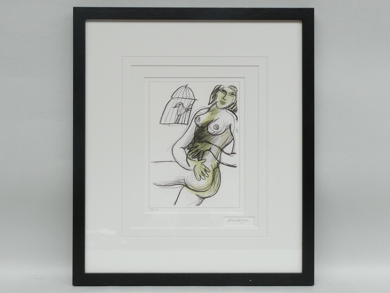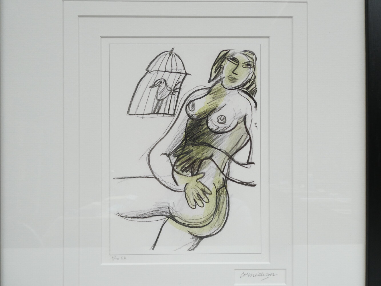 "Vrouw met vogelkooi" manueel grafisch werk van Corneille, artiestenproef. Kader : 41cm x 47cm.