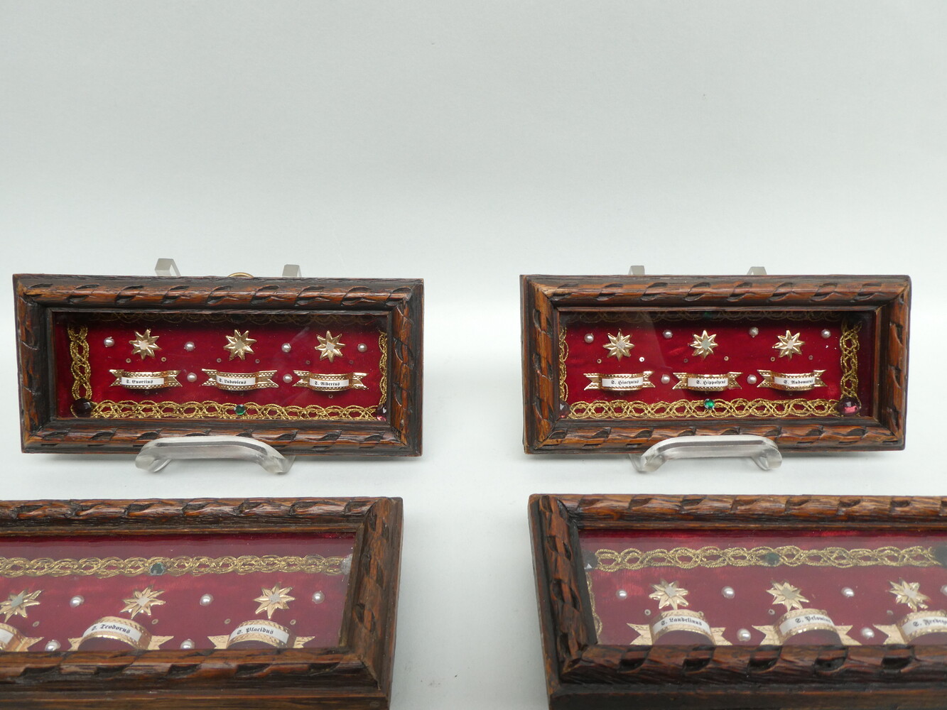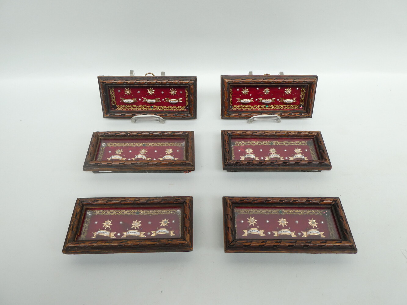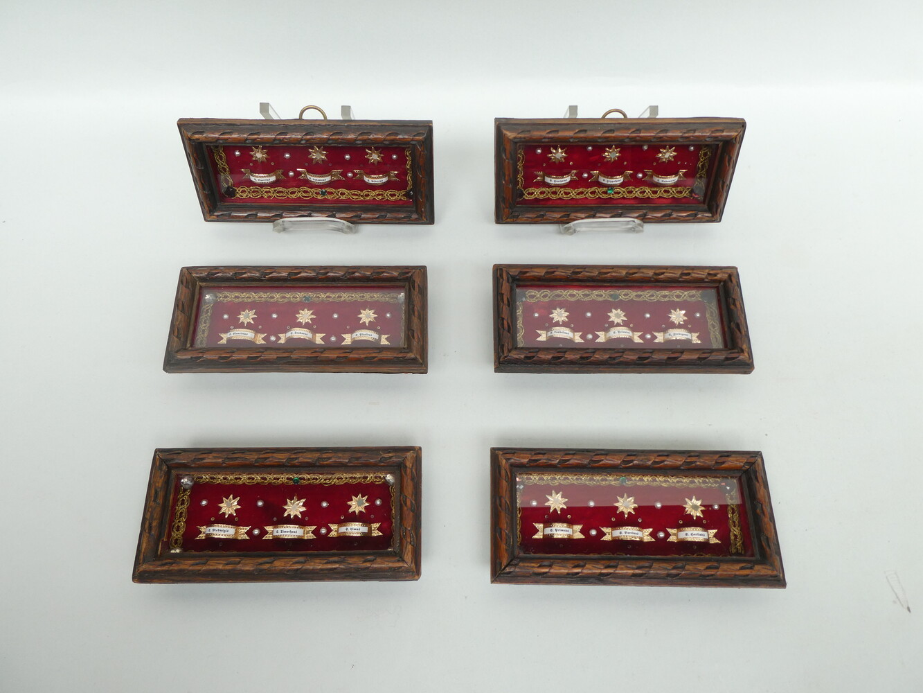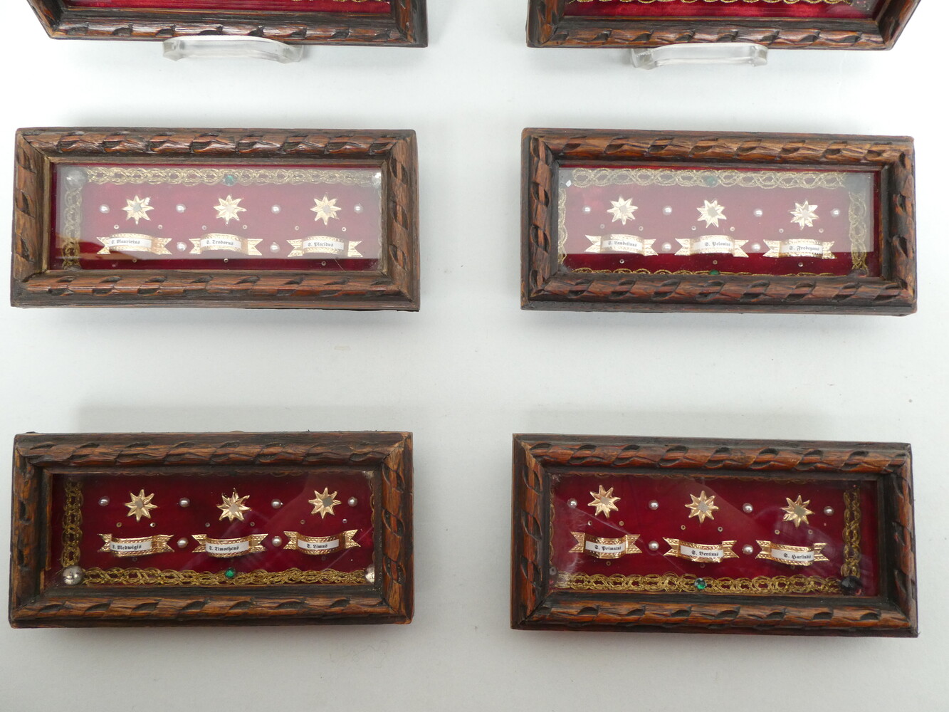 Zes antieke kloosterwerkkadertjes met reliekjes.