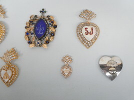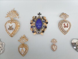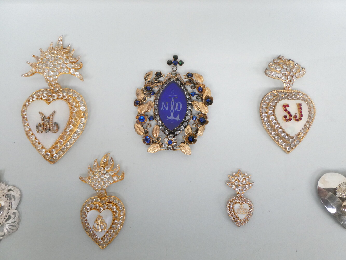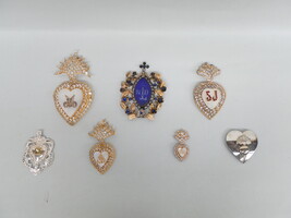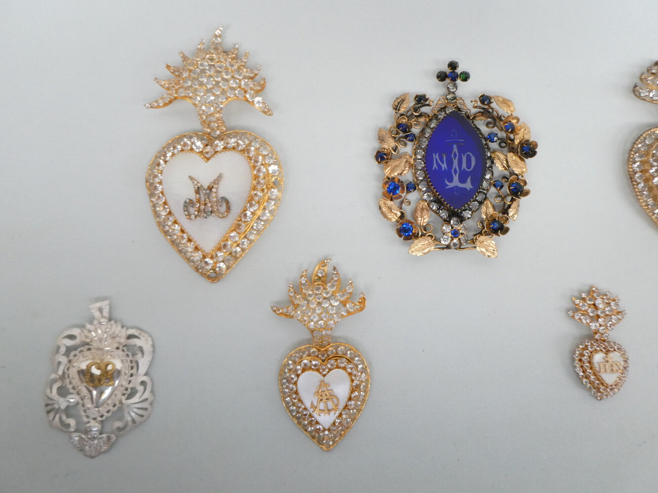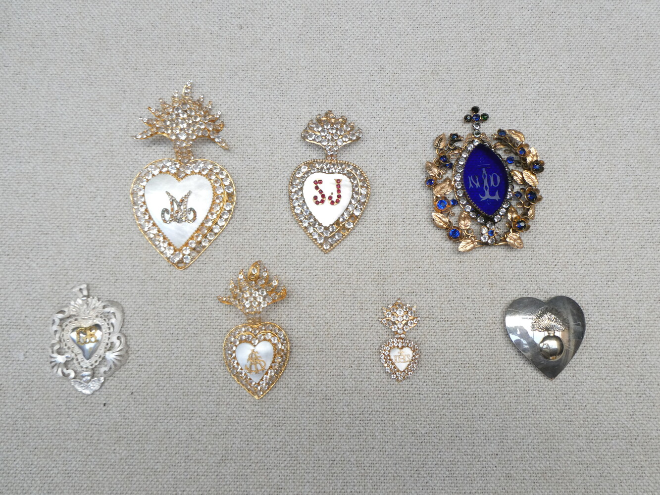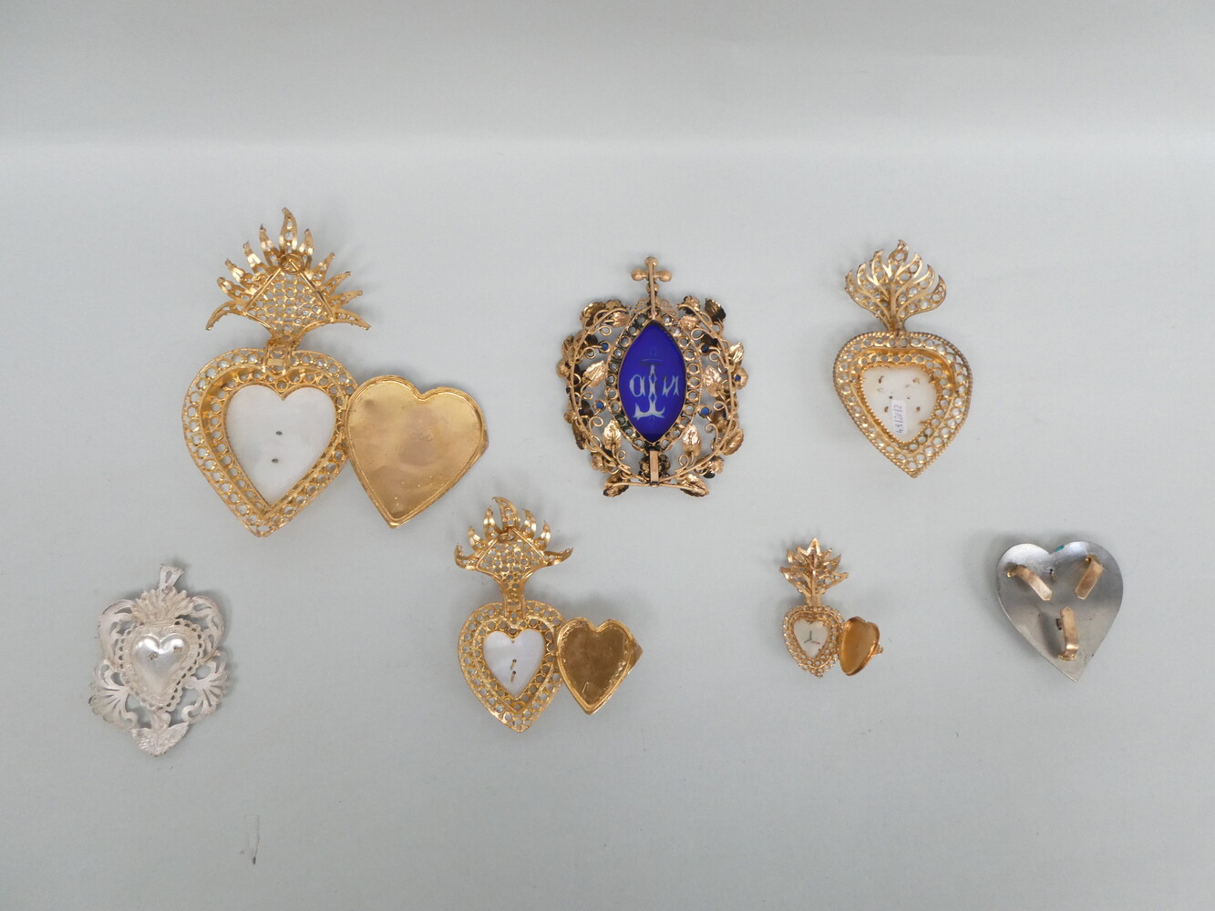 Zes ex-voto harten en een "Lourdes" lauwerenkrans, in verguld koper, nacré en zilver, versierd met geslepen glaspareltjes. Hoogte tussen 7 en 18cm.