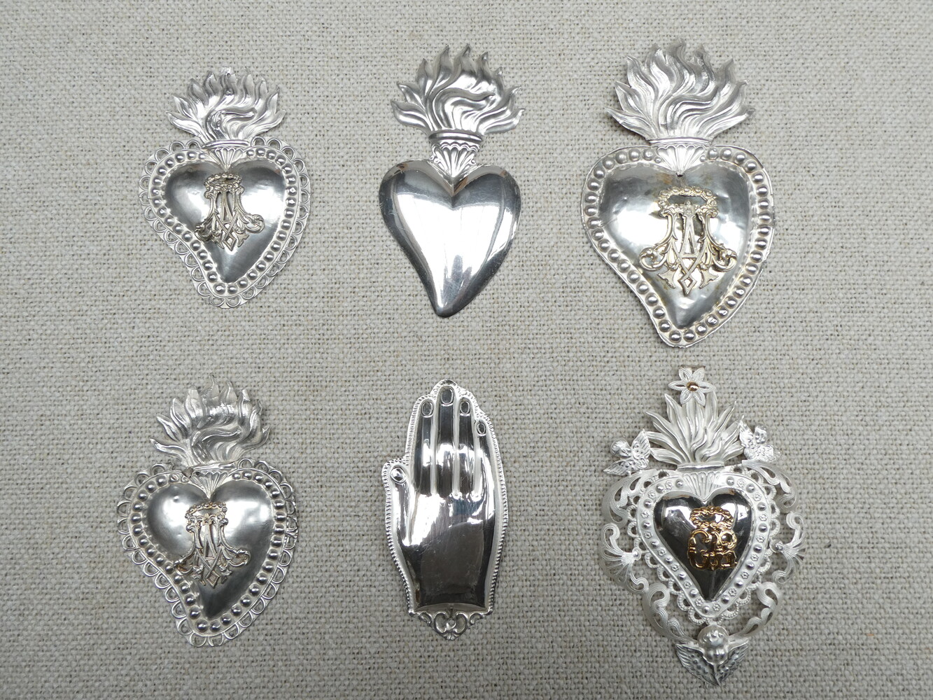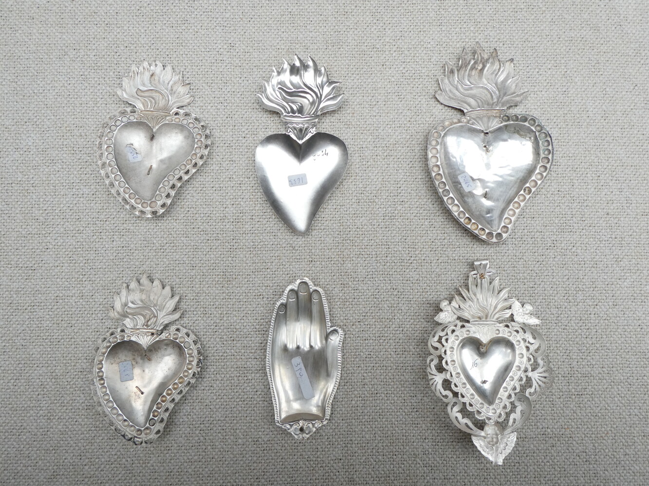Zes verzilverde ex voto's ( vijf harten en één hand ).