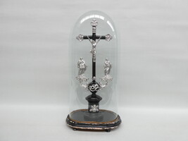 Zilveren Calvarietafereel op zwarthouten kruis, onder globe