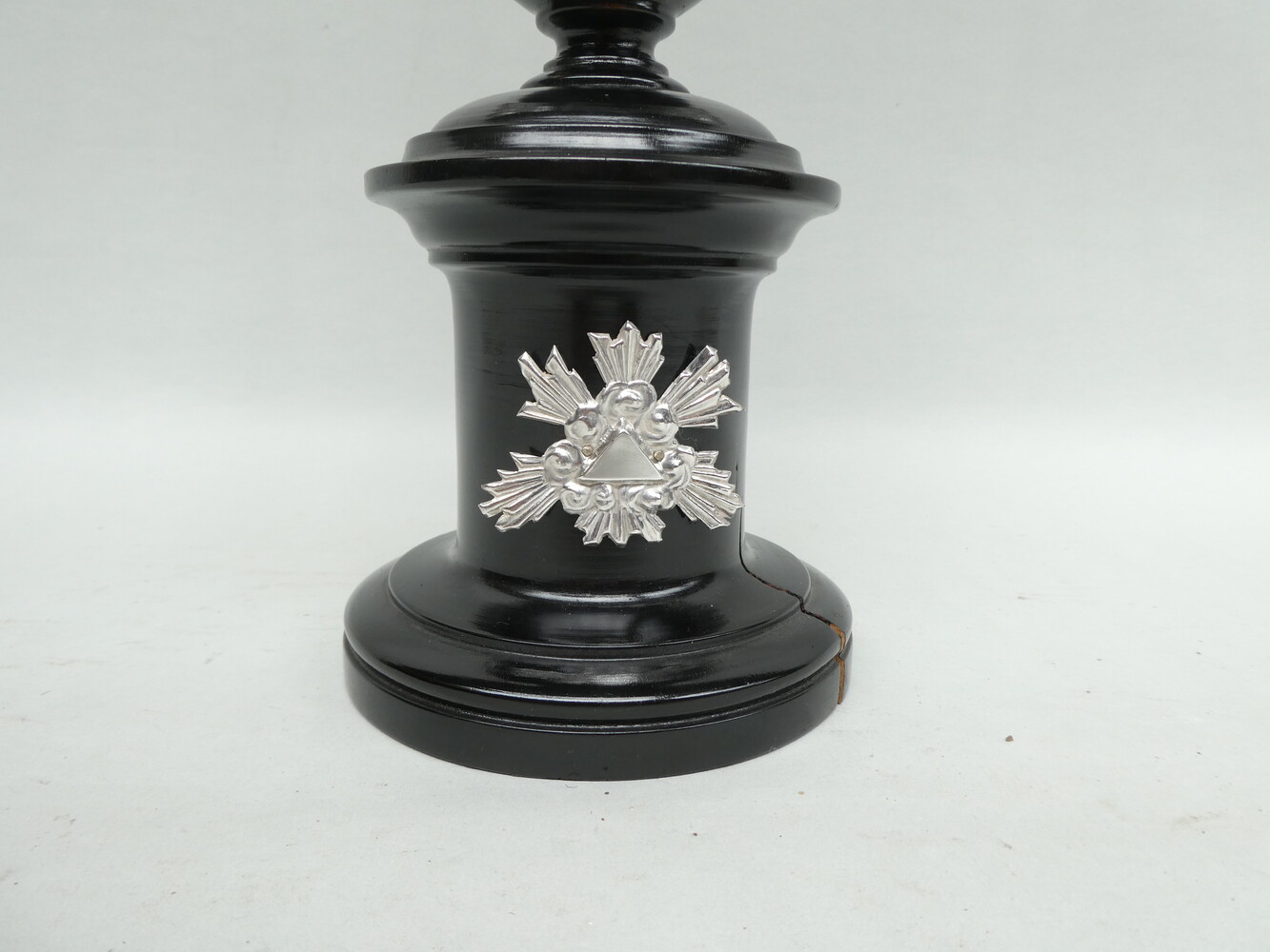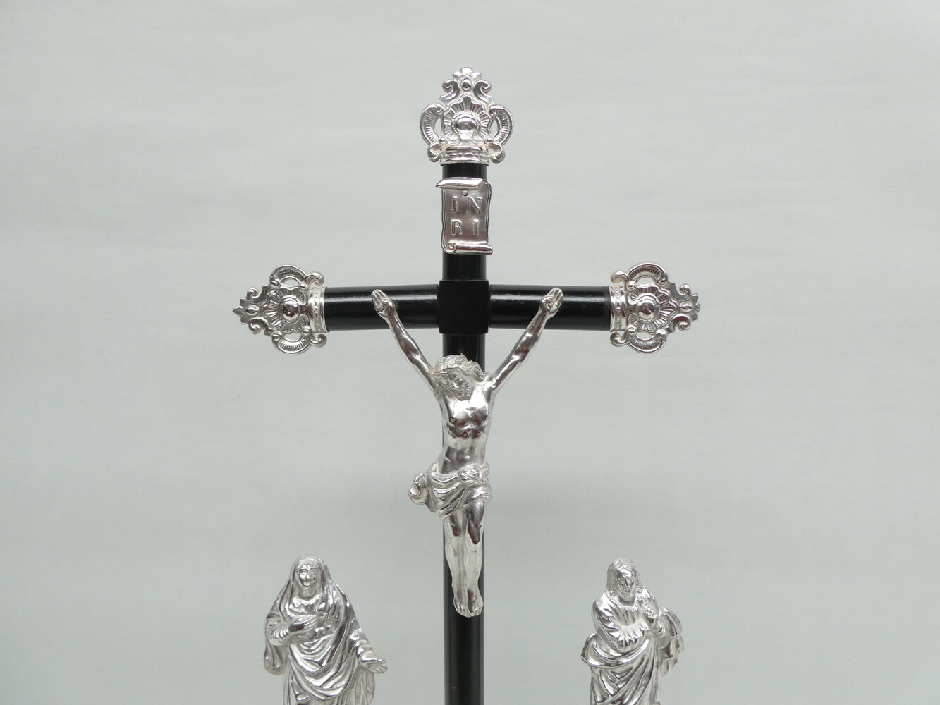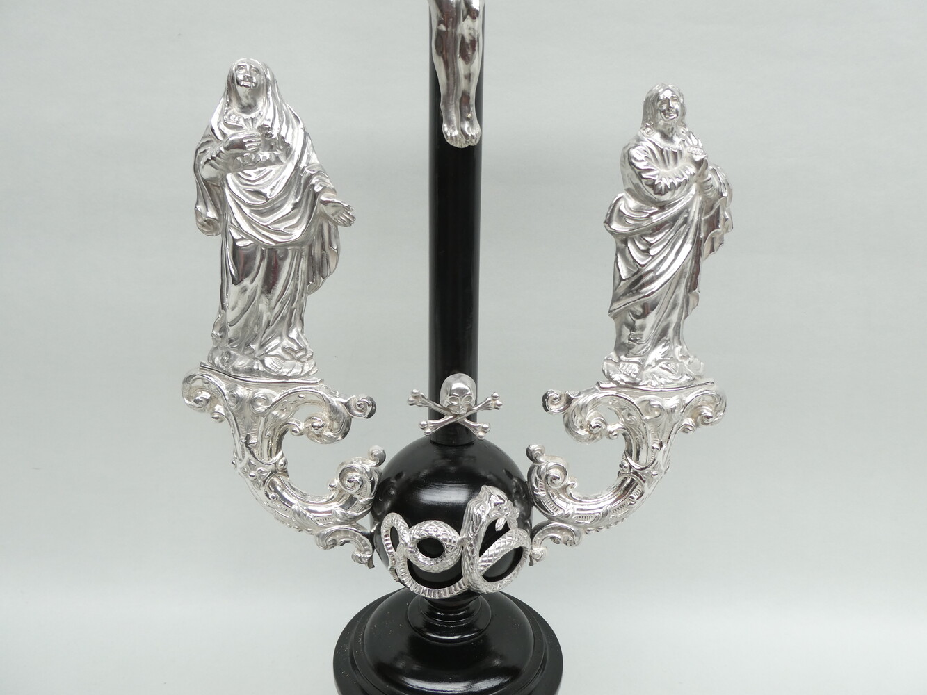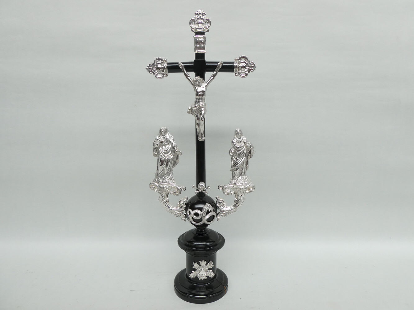 Zilveren Calvarietafereel op zwarthouten kruis, onder globe.