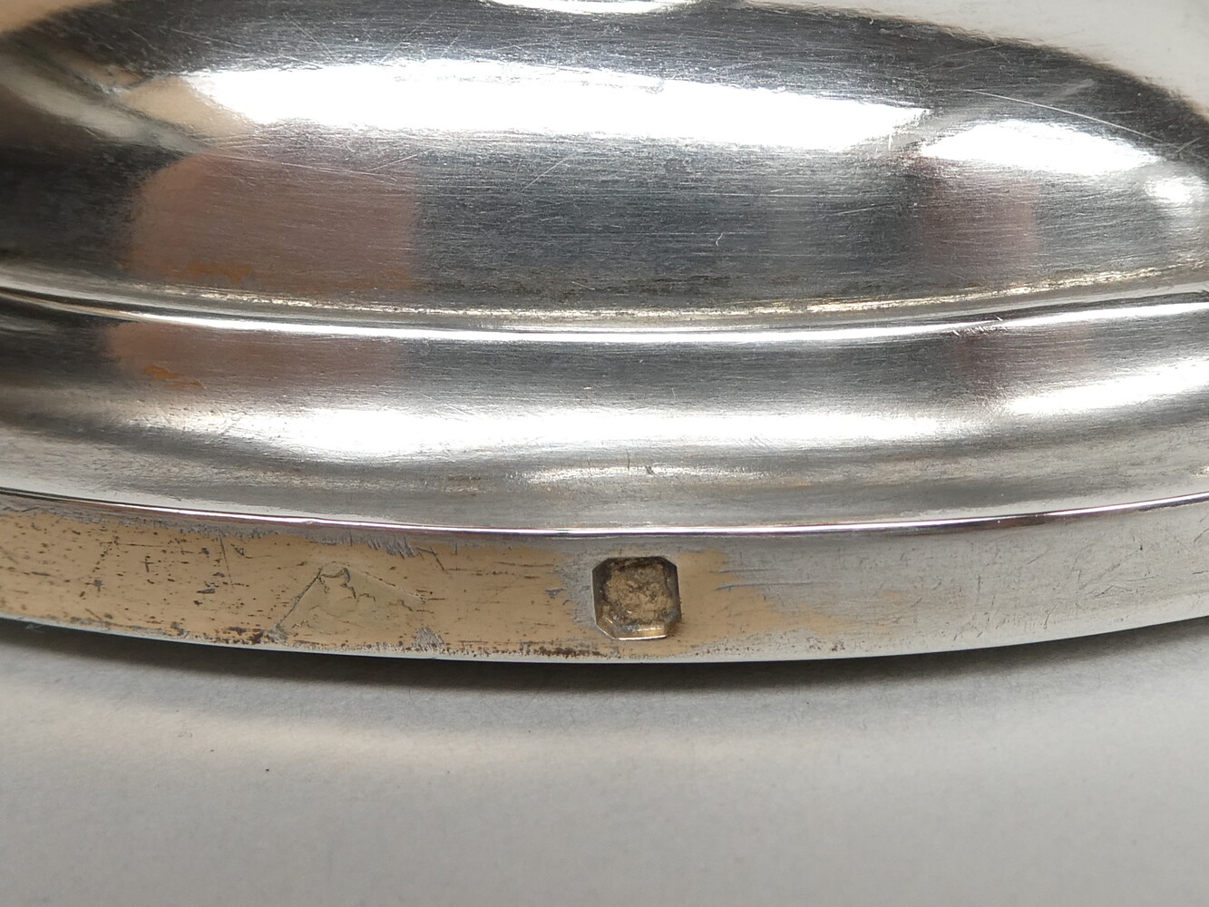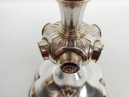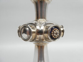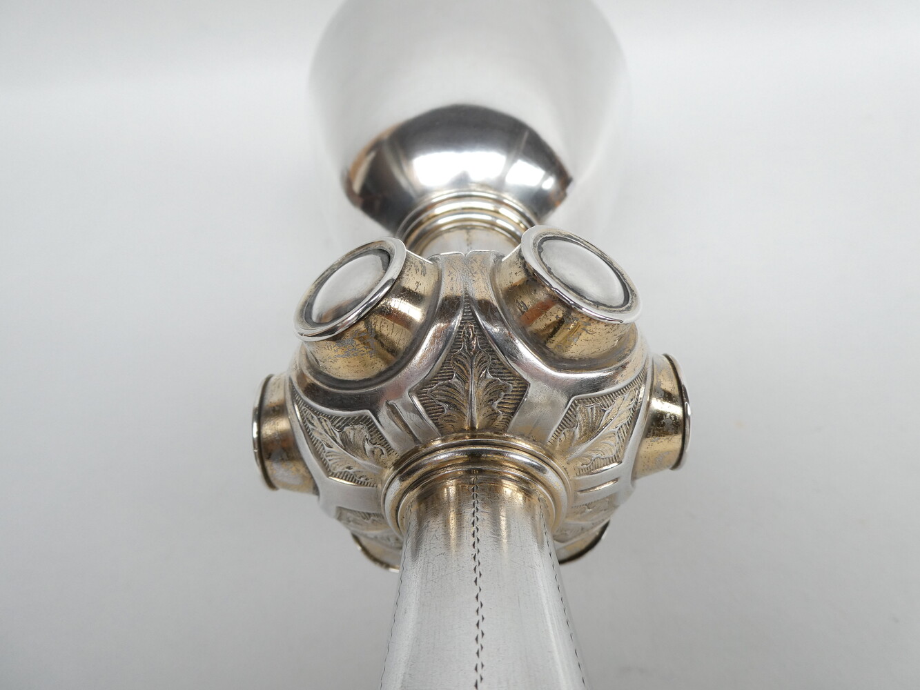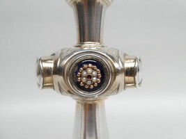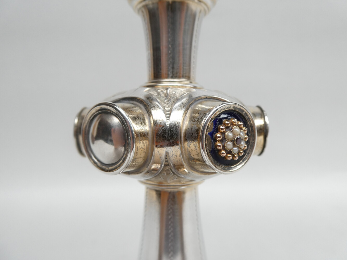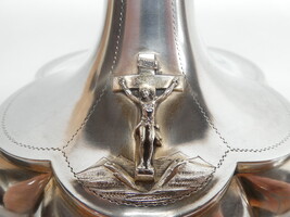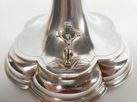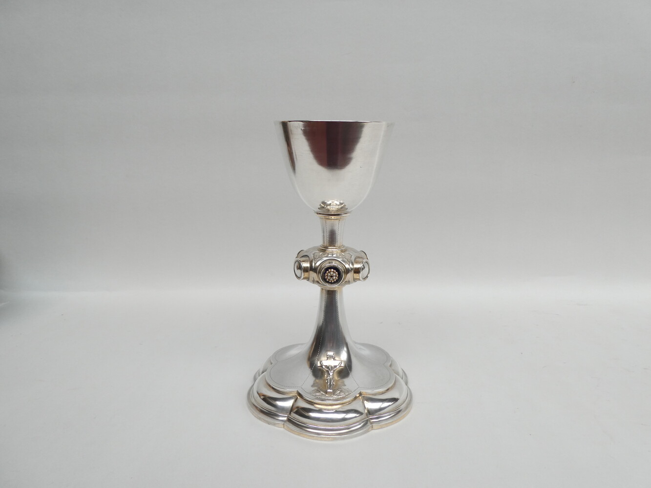Zilveren franse kelk met mooie gelobde nodus versierd met pareltjes en steentjes, Calvarietafereel op de gelobde geprofileerde voet. Hoogte 25cm.
