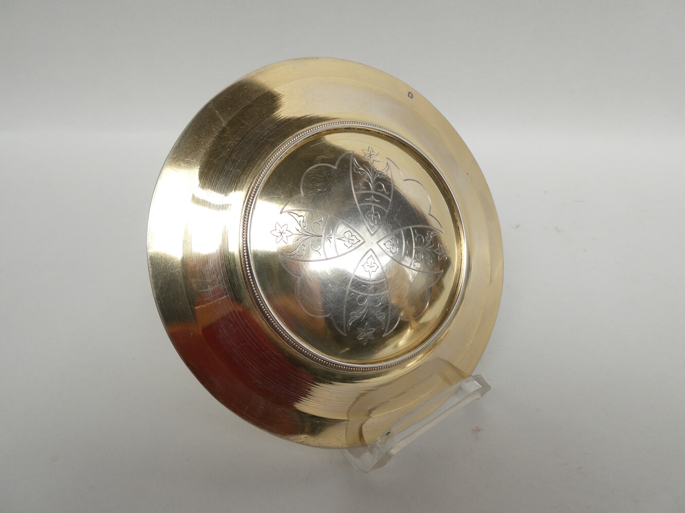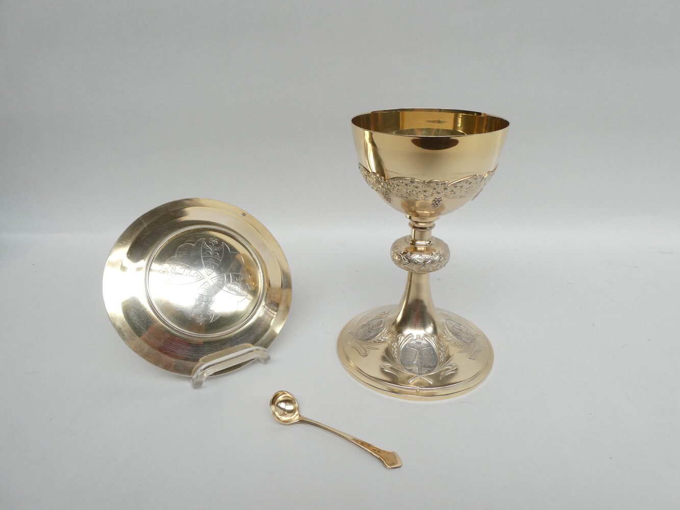 Zilveren kelk, verguld, met zilveren pateen en lepeltje, gedateerd 1928, in de voet vier medaillons "Jezus aan het kruis", "Jozef met Kindje", "Romeinse martelaar" en "een bisschop".