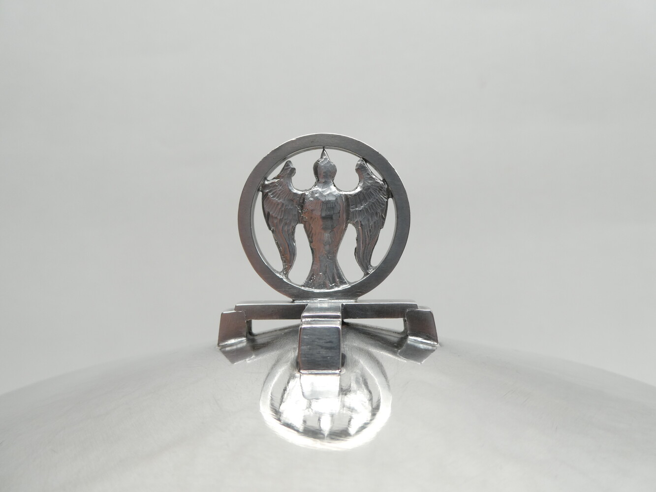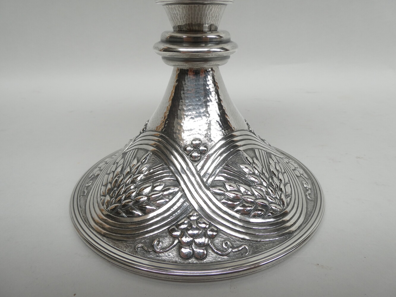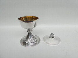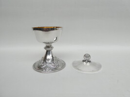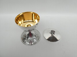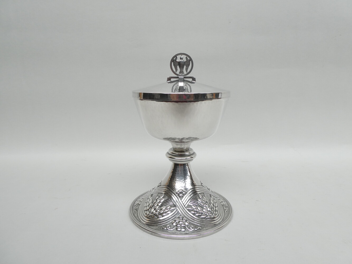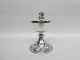Zware zilveren art deco ciborie, sterling zilver ( gehalte 900 ). Bovenaan op het deksel het symbool van de Heilige Geest. Totale hoogte 22cm. Totaal gewicht 900gram.
