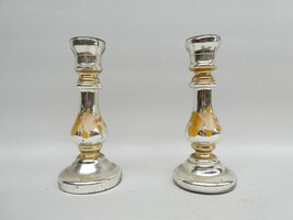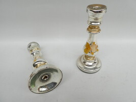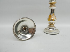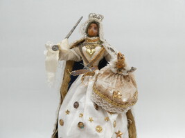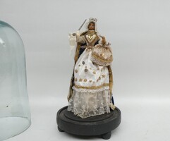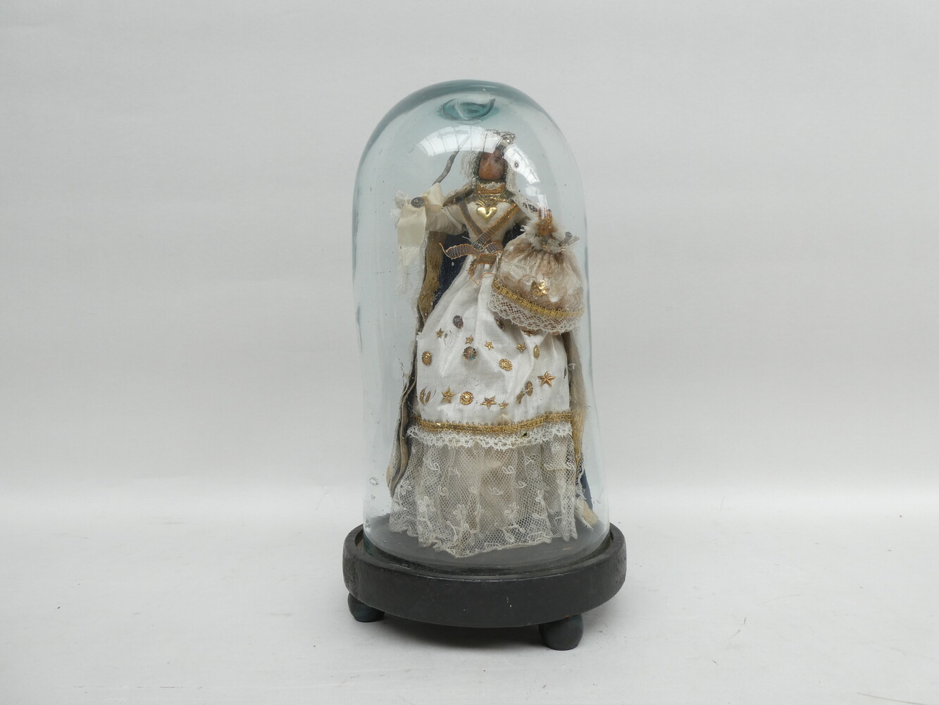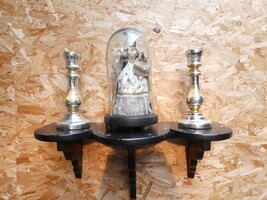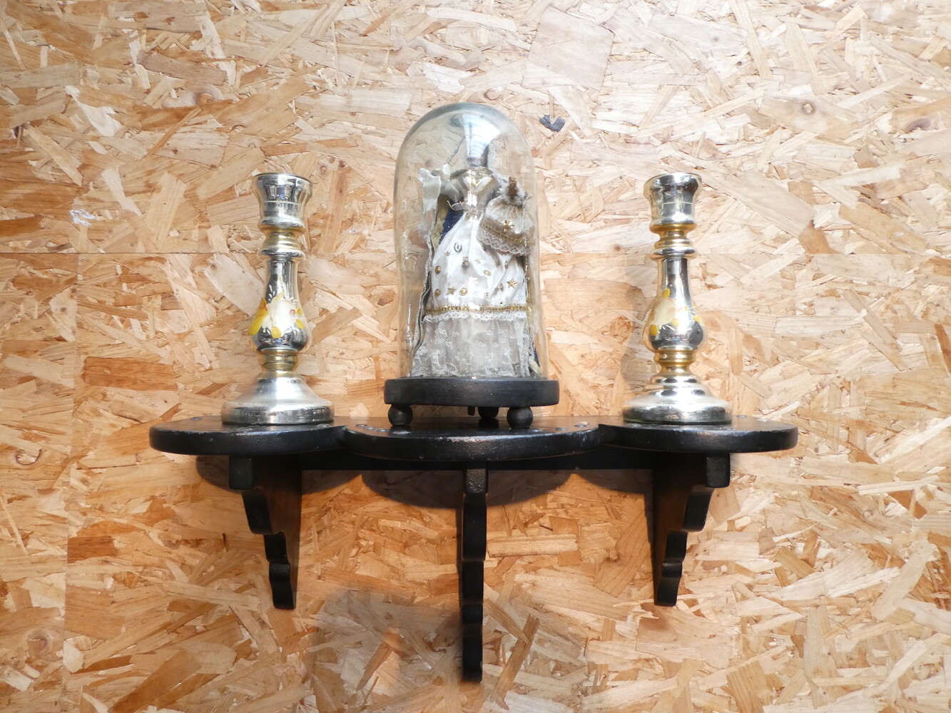 Zwarthouten schapje 60cmx28cm met een antiek Mariabeeldje onder globe, hoogte 31cm, met een koppel kandelaartjes in armenzilver, hoogte 24cm.